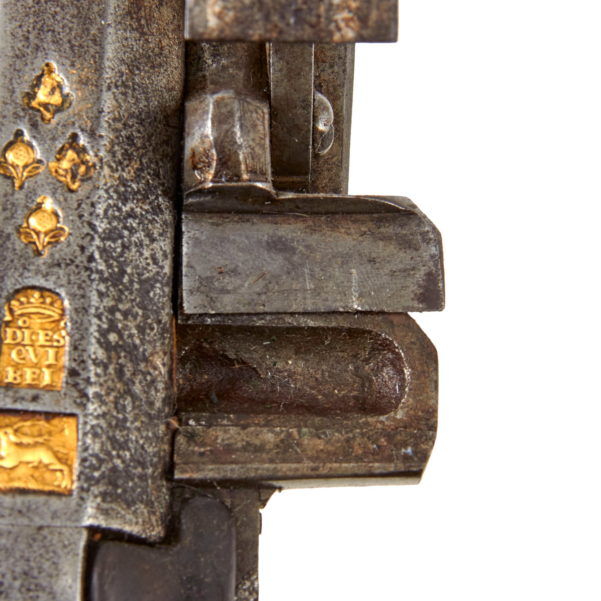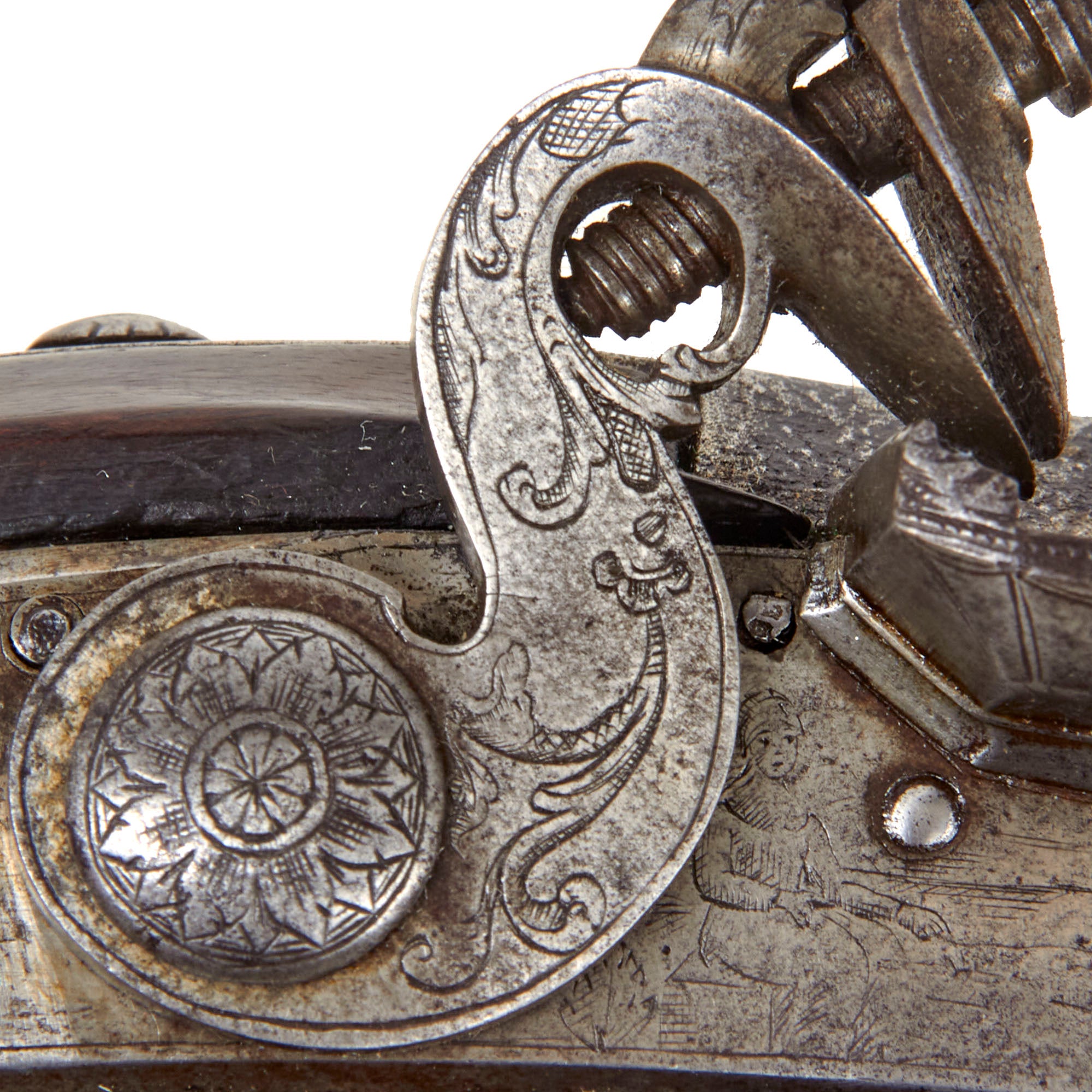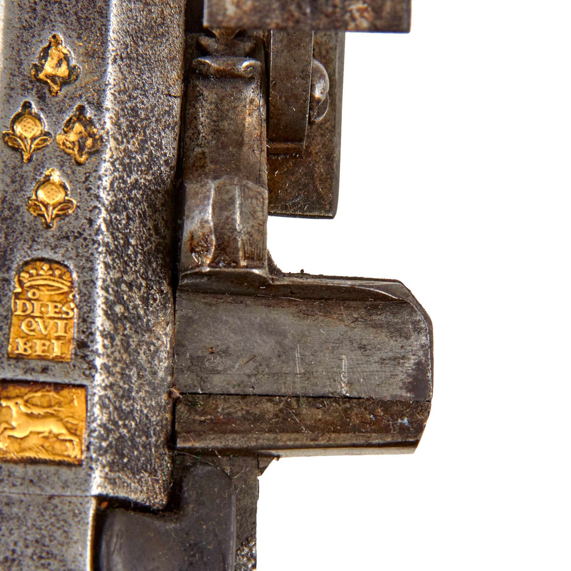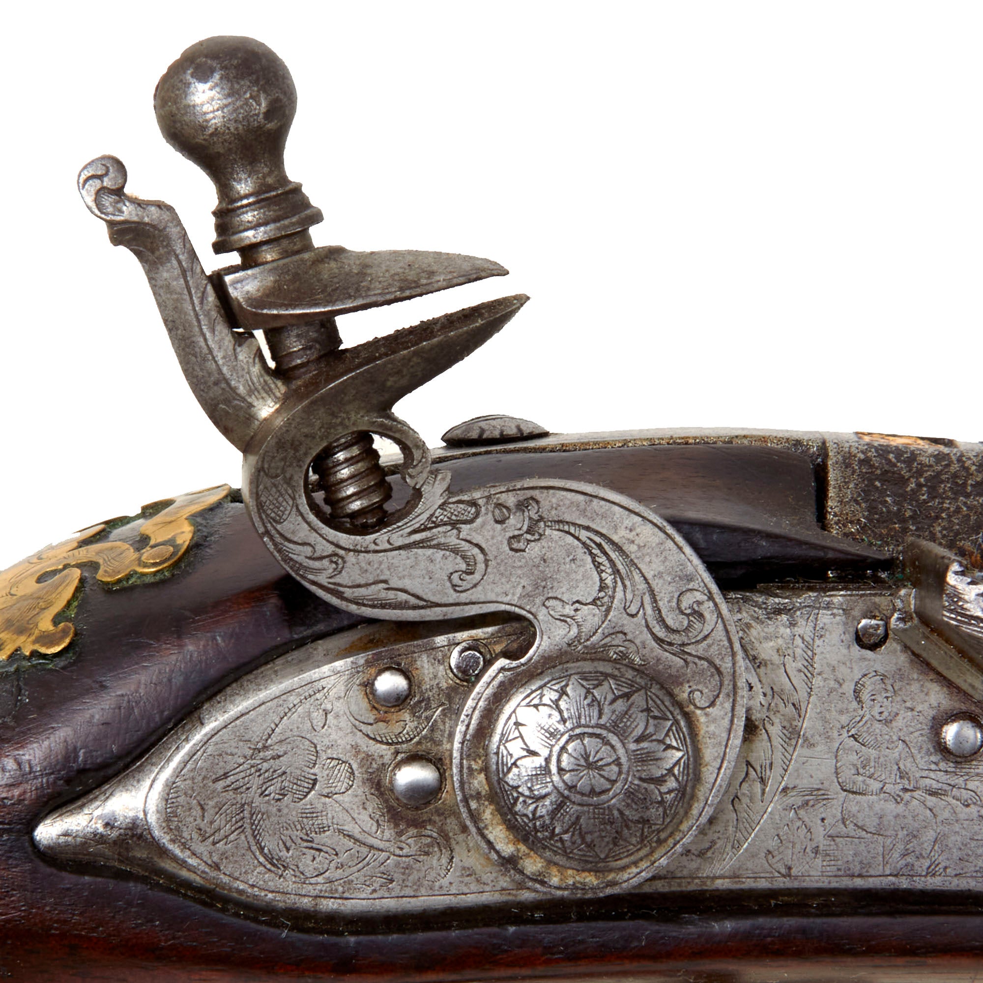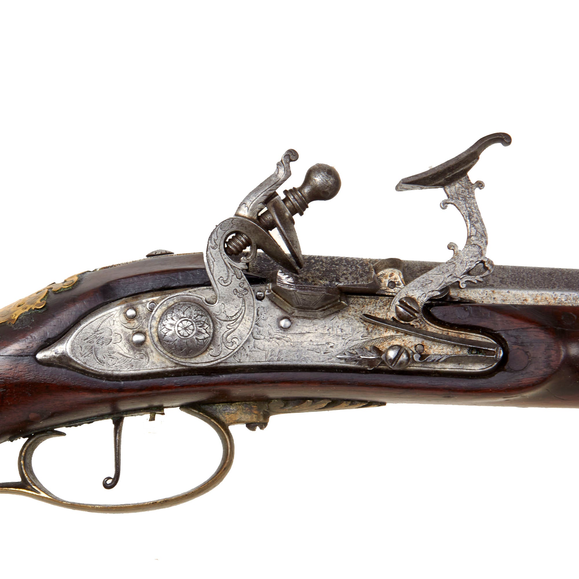 The lock is fully engraved with very fine designs, and pretty much every part of the lock has some type of engraving, though there is no maker marking on the lock. It is the classic snaphaunce design, with a fully functional sliding cover over the flash pan. This type of lock was very popular in Spain during the time, as the "modern" French style flintlock that attached the pan cover to the frizzen was not fully popularized yet. The lock seems to be fully functional, however it does not have any provision for a half cock position, which seems to be correct due to the presence of the pan cover.