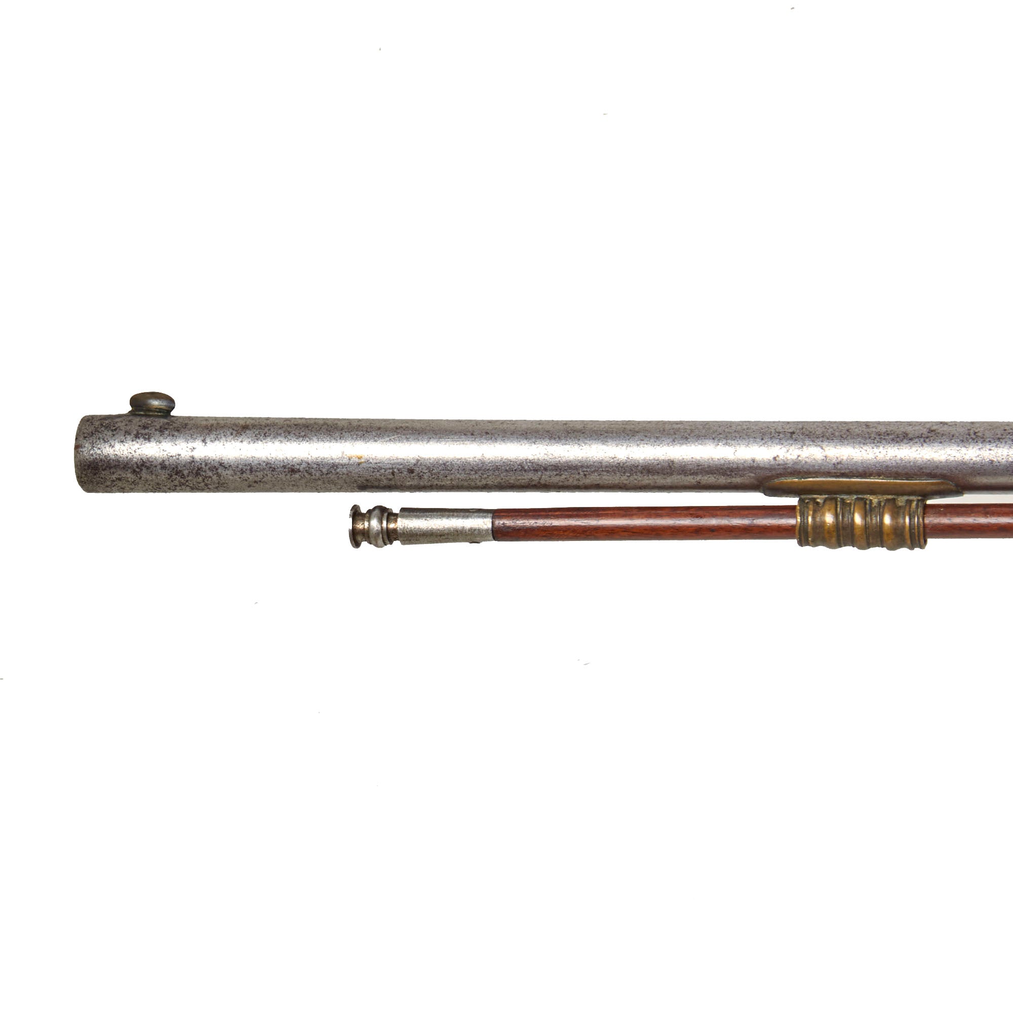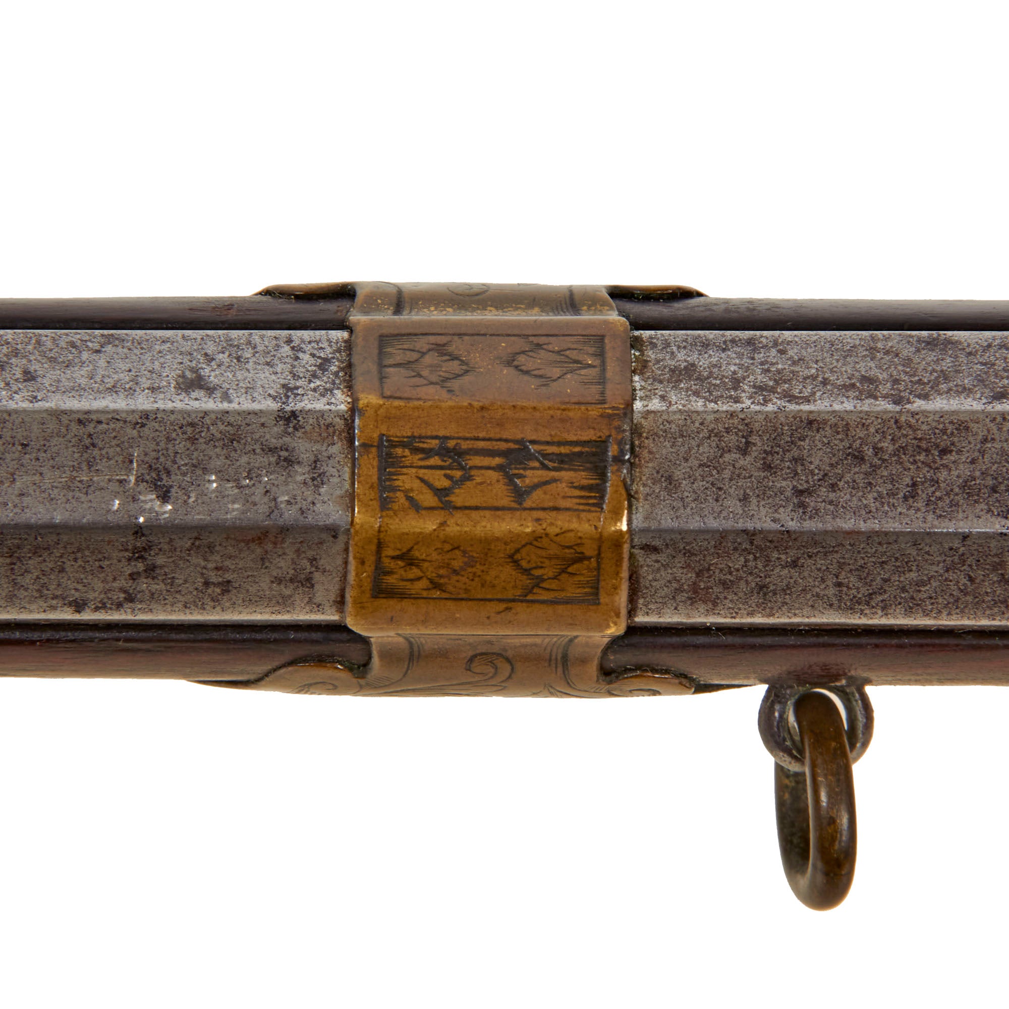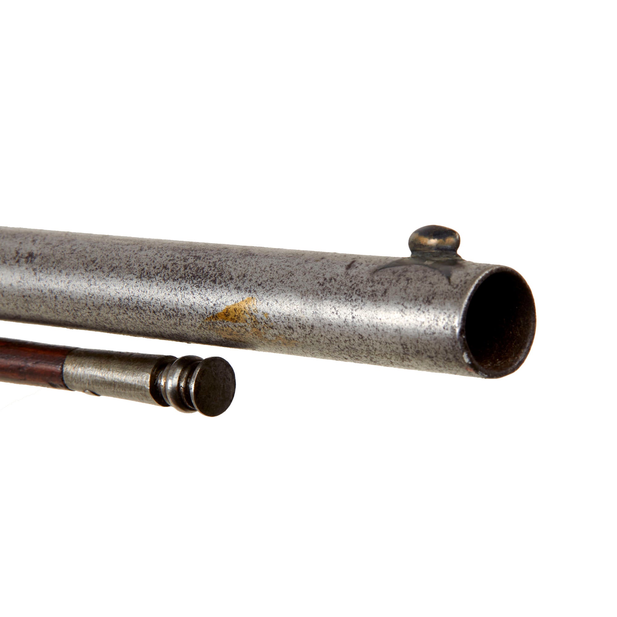 The metalwork of the gun shows a lovely aged patina on the barrel, while the lock is a bit more polished, and the brass areas have a lovely mustard patina. The stock has a great "banister" style butt stock, and overall has a fantastic color, showing no major damage or wear. There are two small round brass sling swivels attached to the left side stock, and there is a brass ramrod pipe about 9 inches from the muzzle. There is also an iron tipped ramrod under the barrel, which definitely looks to be original, or at least a period replacement.