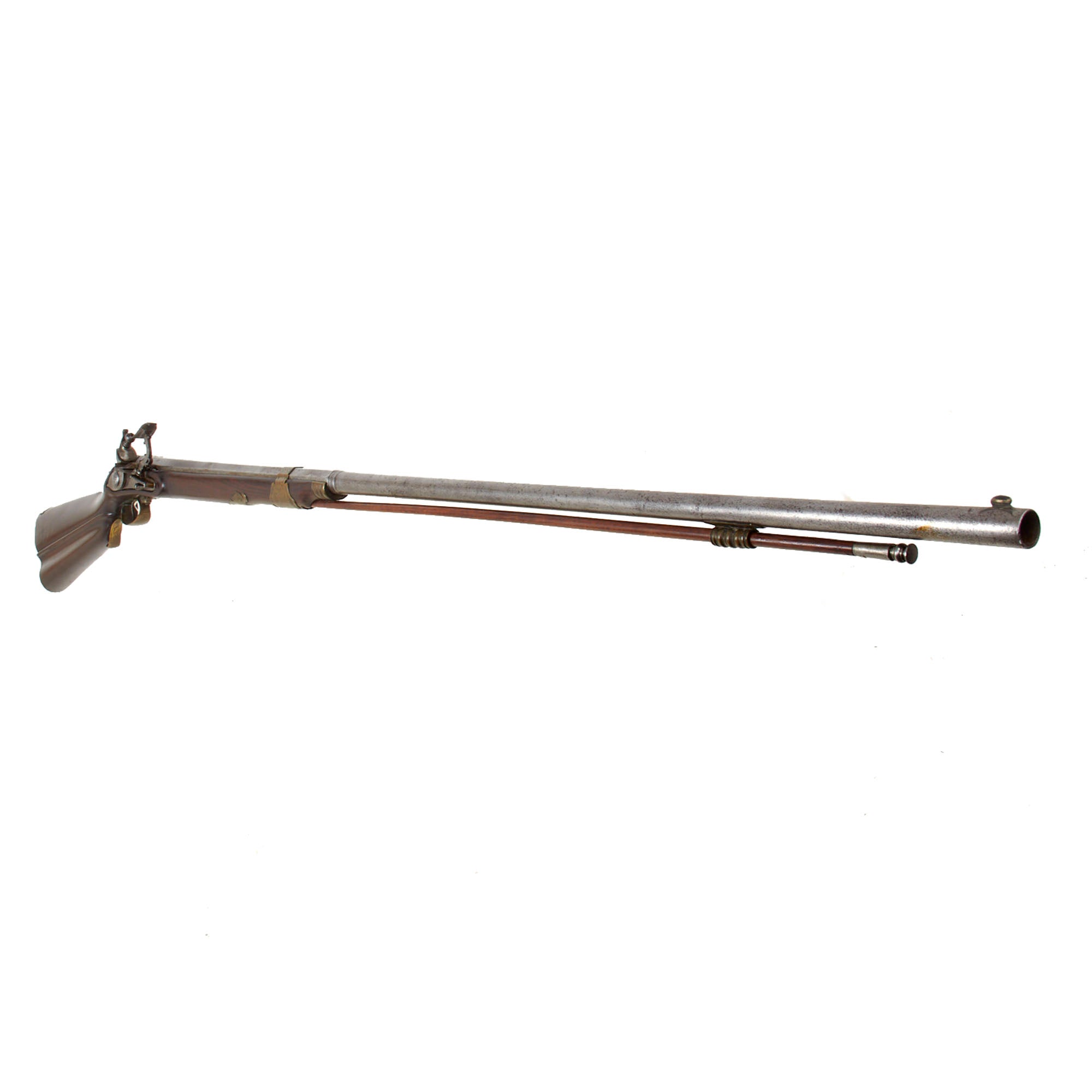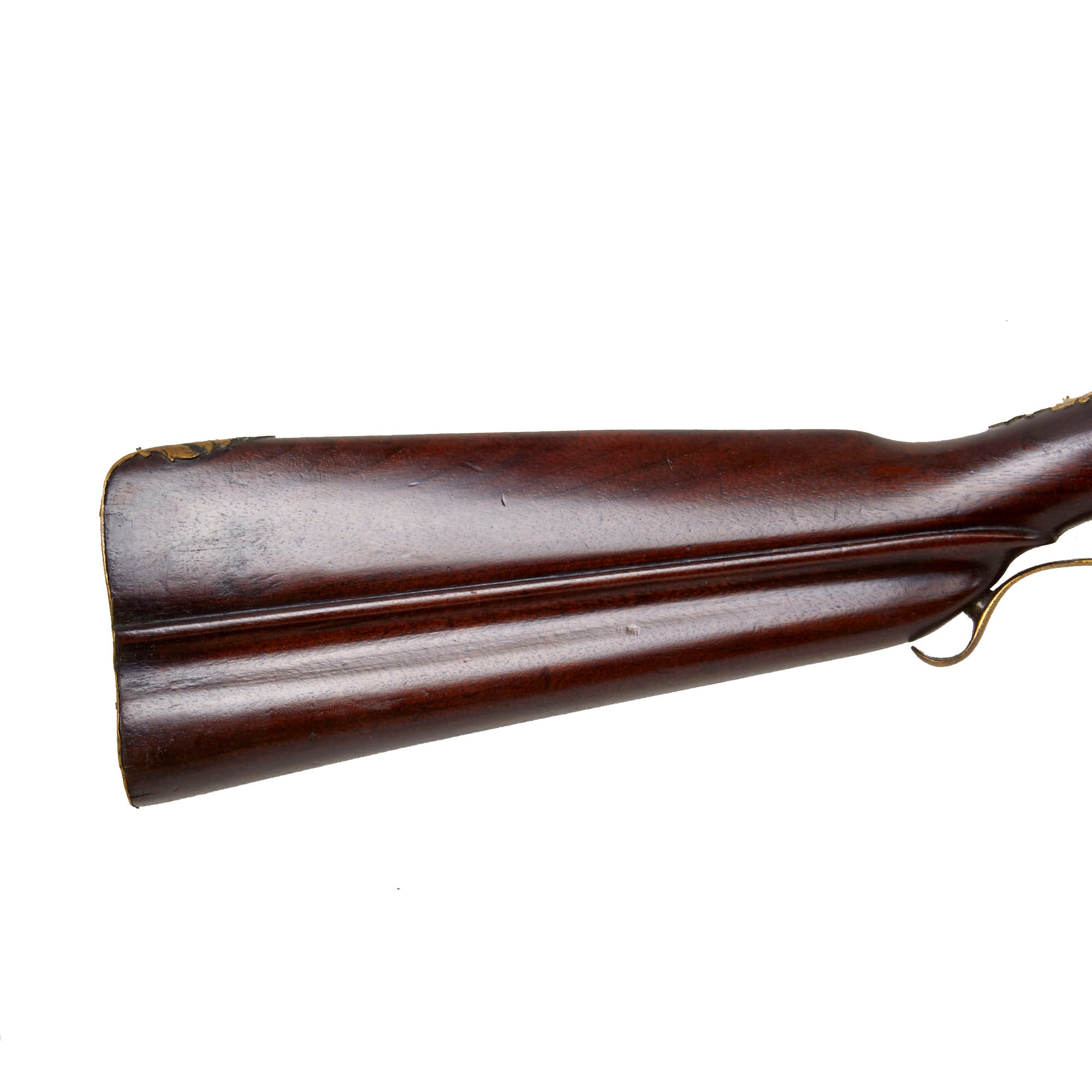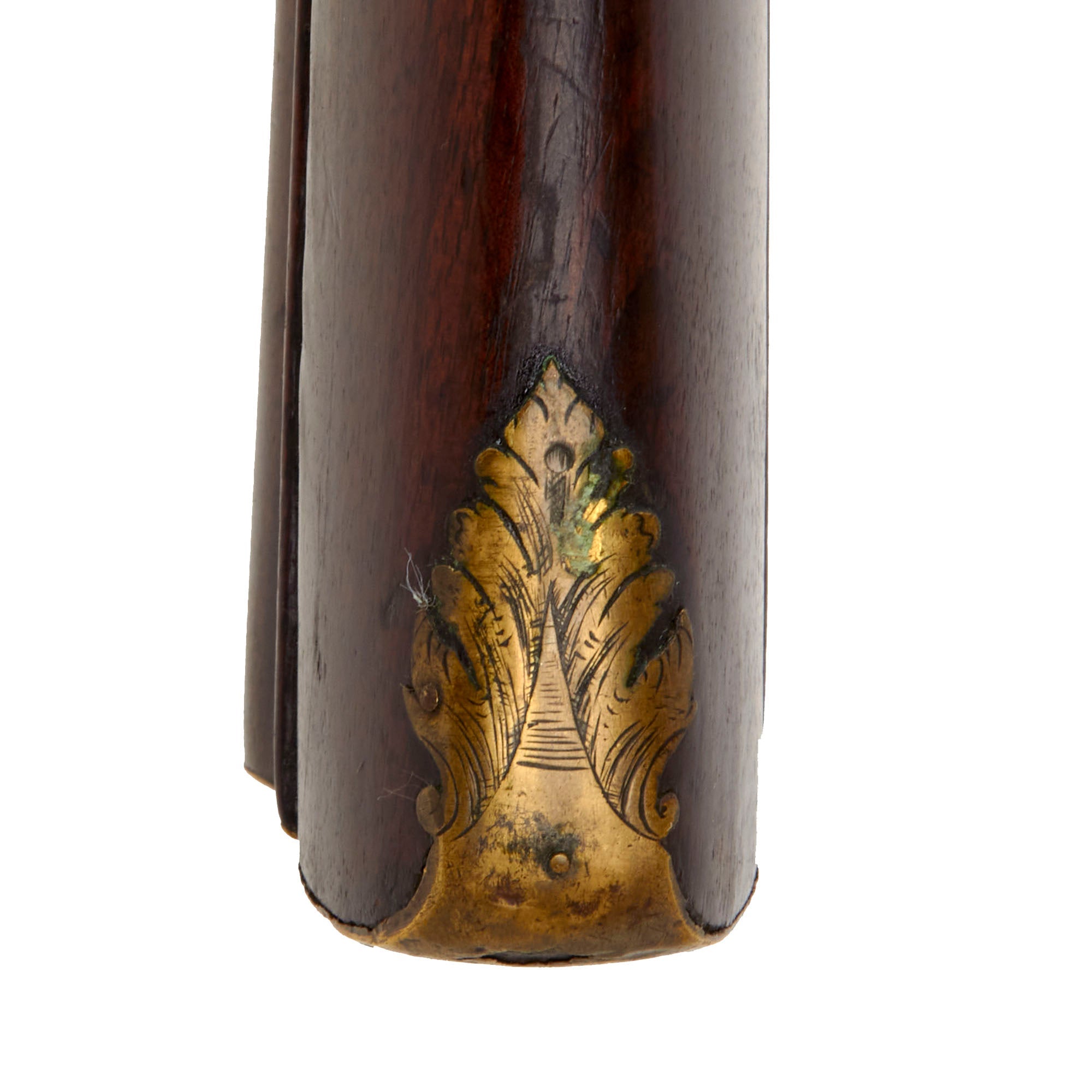 The metalwork of the gun shows a lovely aged patina on the barrel, while the lock is a bit more polished, and the brass areas have a lovely mustard patina. The stock has a great "banister" style butt stock, and overall has a fantastic color, showing no major damage or wear. There are two small round brass sling swivels attached to the left side stock, and there is a brass ramrod pipe about 9 inches from the muzzle. There is also an iron tipped ramrod under the barrel, which definitely looks to be original, or at least a period replacement.
