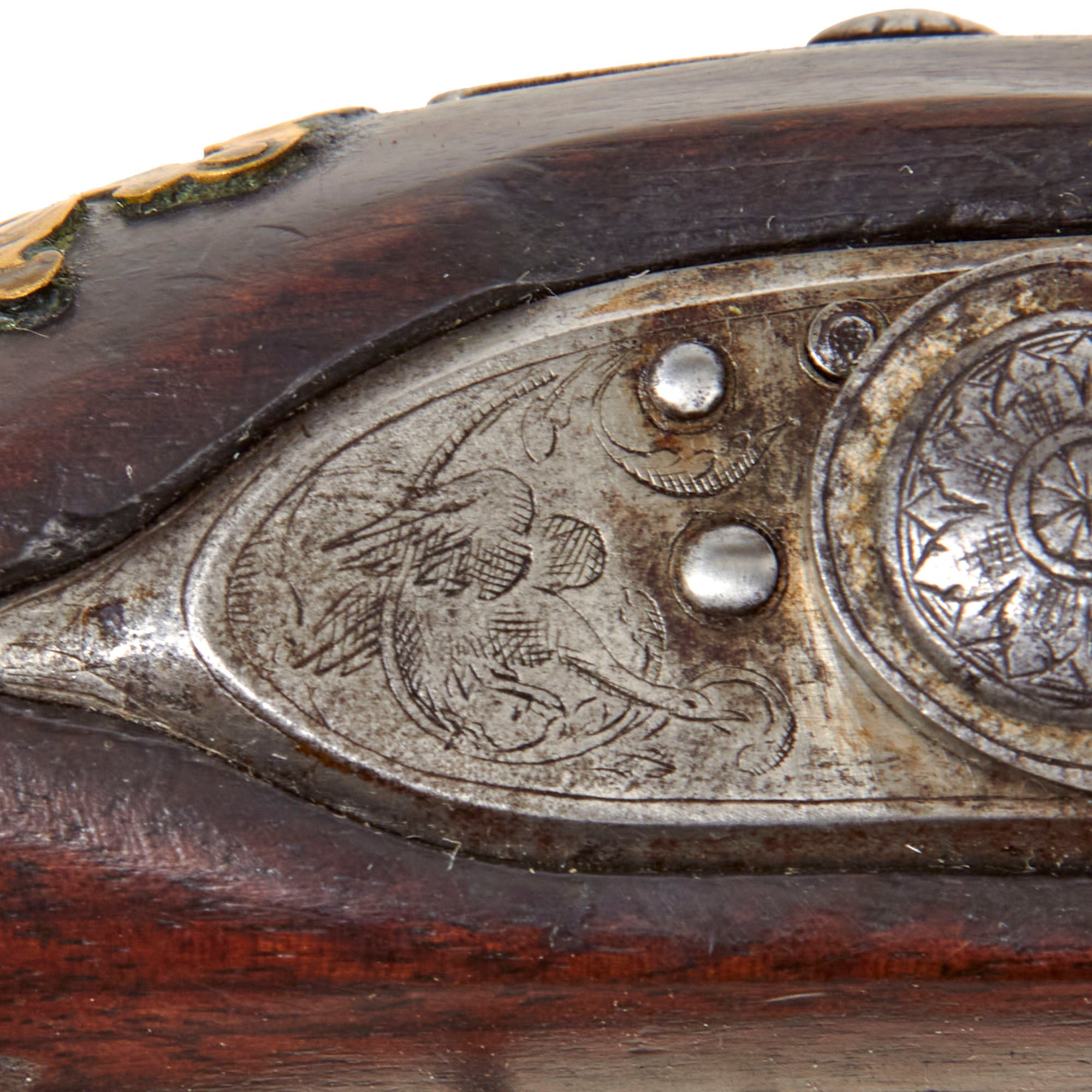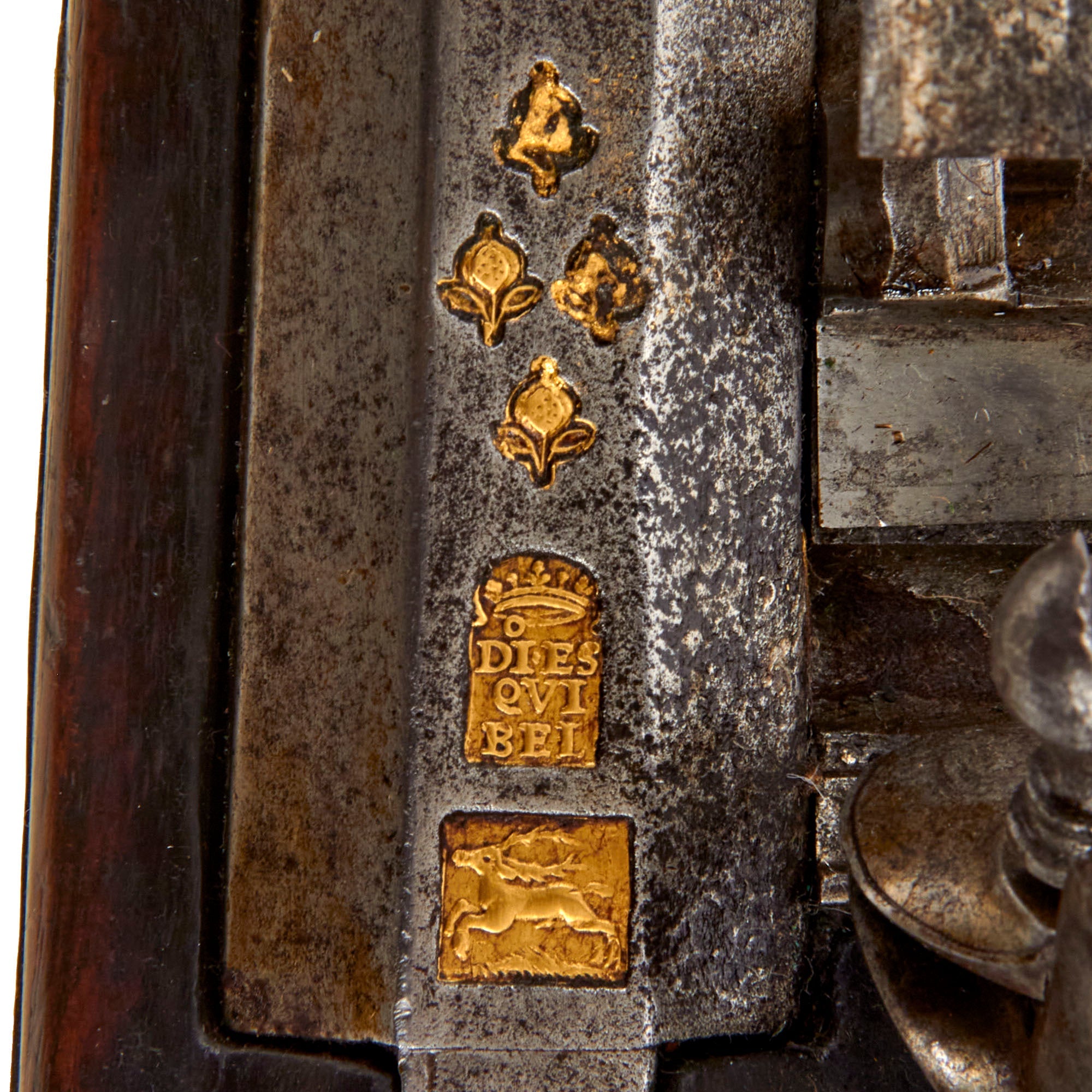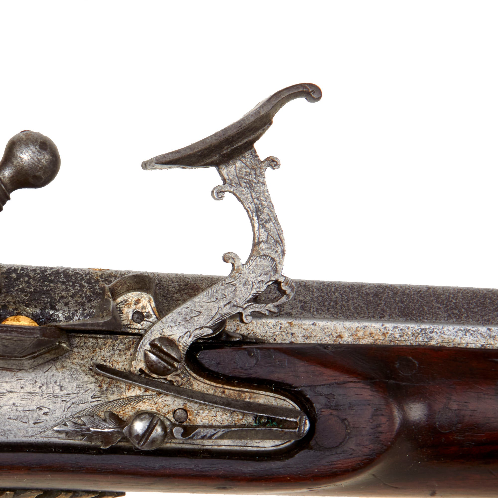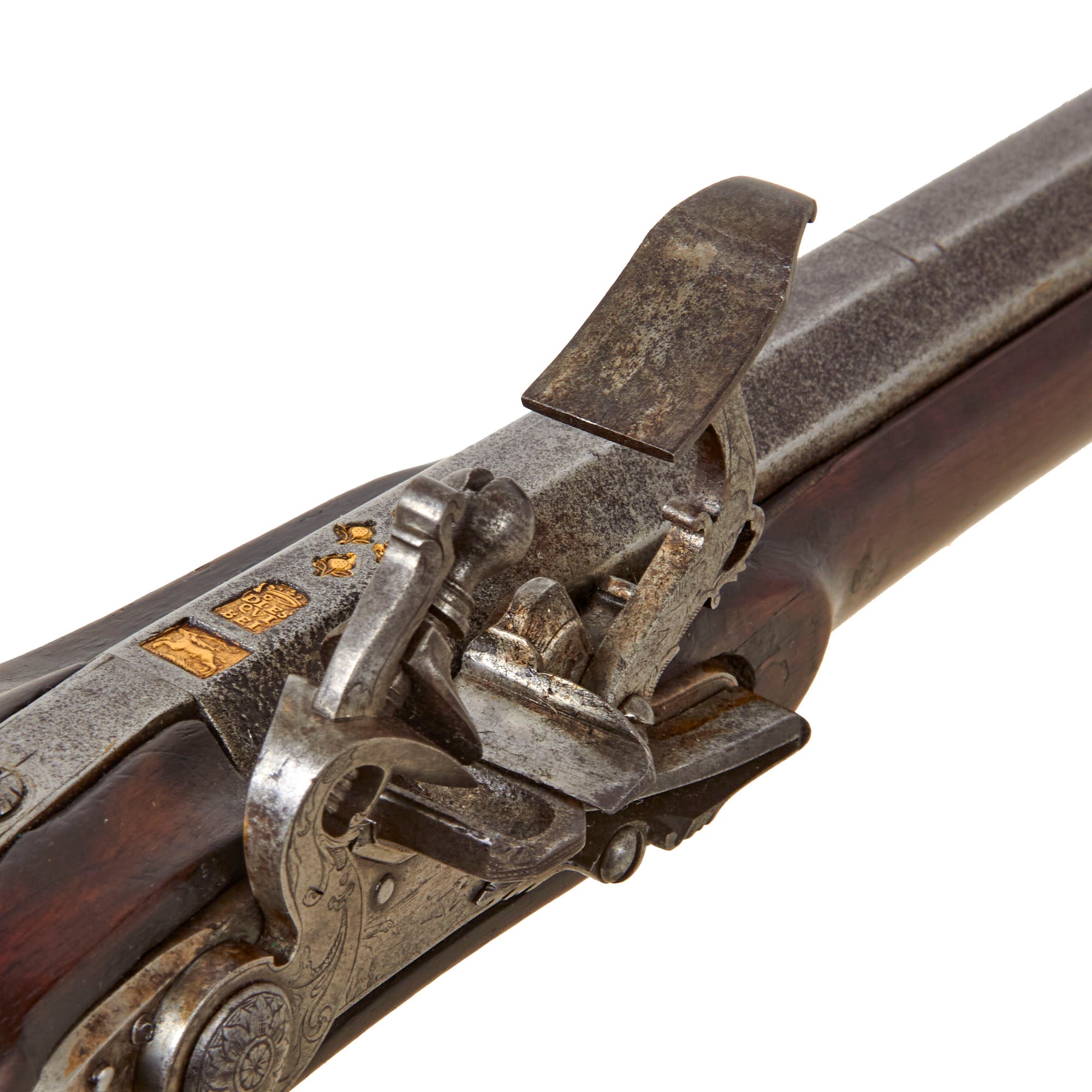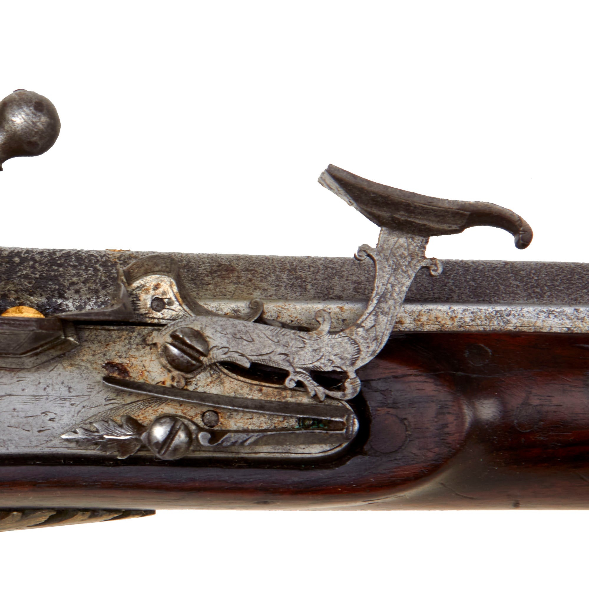 Original Item: One of a Kind. Here we have a beautiful example of an early 18th Century Spanish Snaphaunce Lock Fowling Piece in approximately 20 Bore, crafted by gunmaker Diego Esquivel of Madrid. Guns of this era from Spain were true works of art, usually made to order, and featured carved stocks and extremely high levels of decoration. This example features a fantastic 2 stage octagon to round barrel, which has just a bit of a flare at the muzzle.