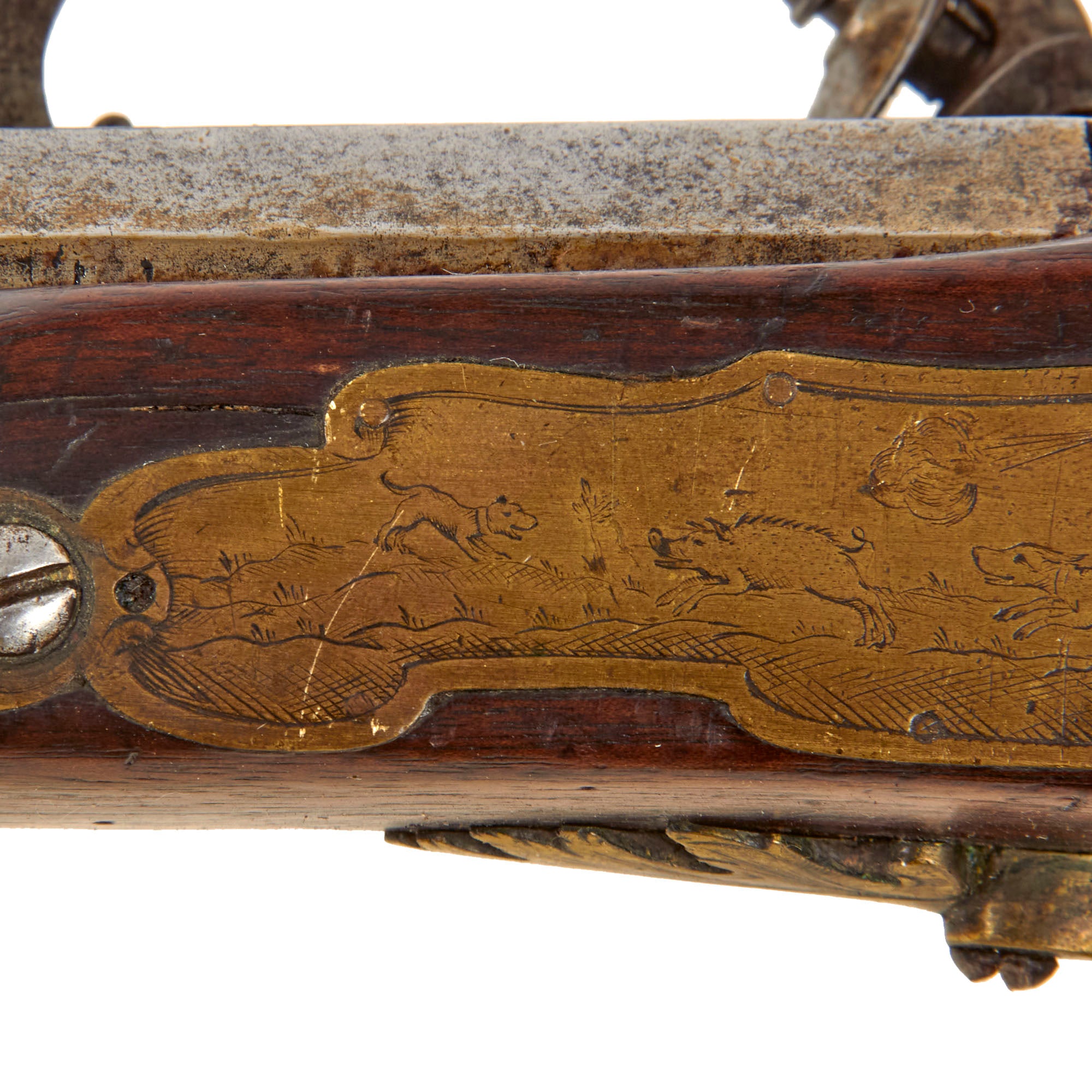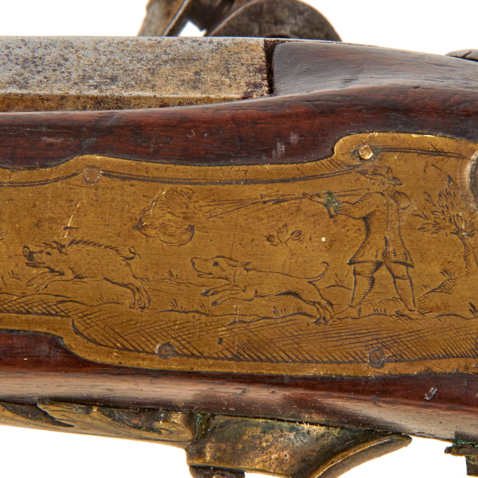 The fowler is all brass mounted, and features multiple expertly engraved scenes on many of them. The large side plate has a fantastic hunting scene, showing what looks to be hounds after a Wild Boar, and the escutcheon on the back of the wrist looks to show a hunting hound as well. The iron lock plate has additional hunting scenes, and there are additional engraved brass adornments on the bottom of the fore stock, one of which looks to have a LION surrounded by G R, possibly indicating it was sold to someone in England. It must have taken a very long amount of time to execute all of this engraving work.