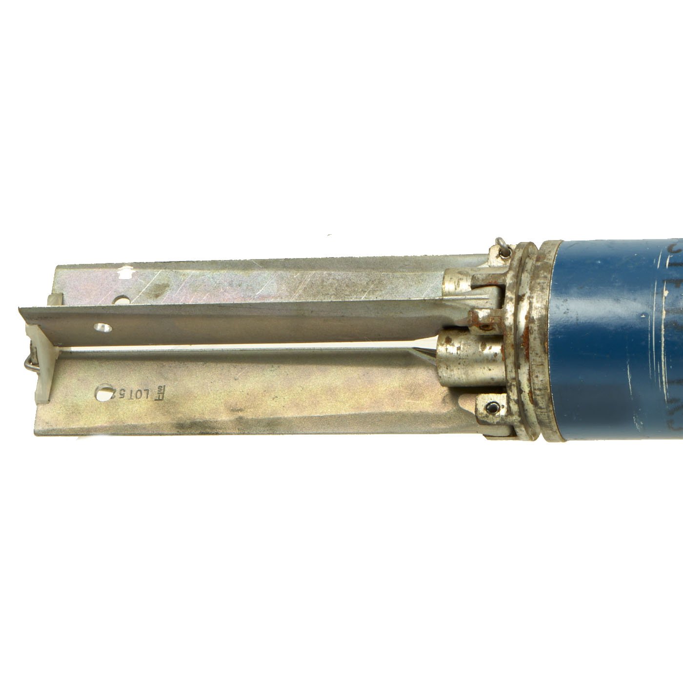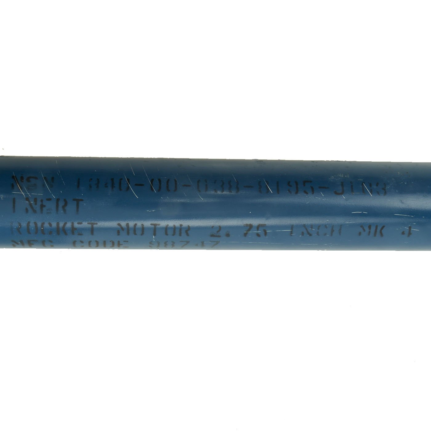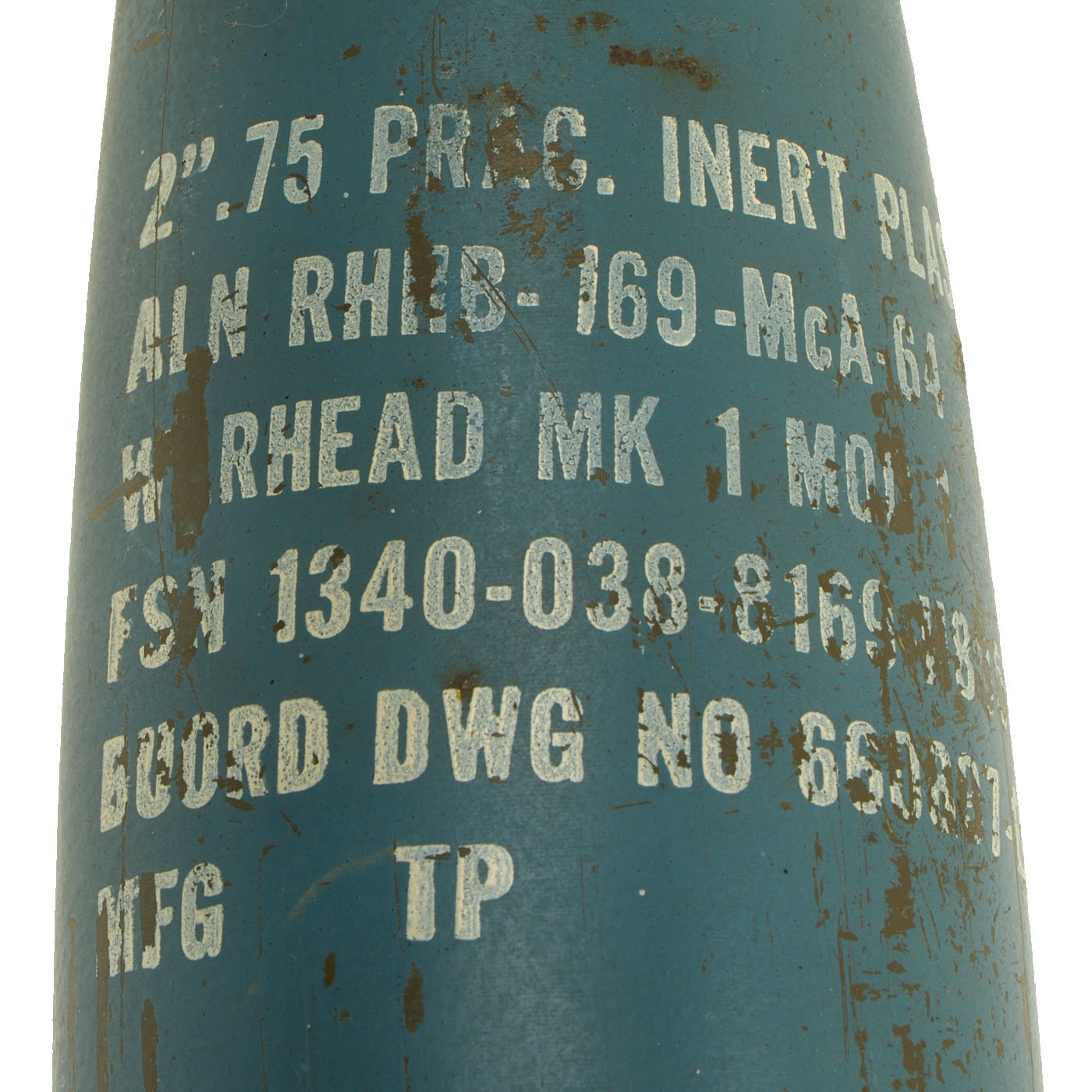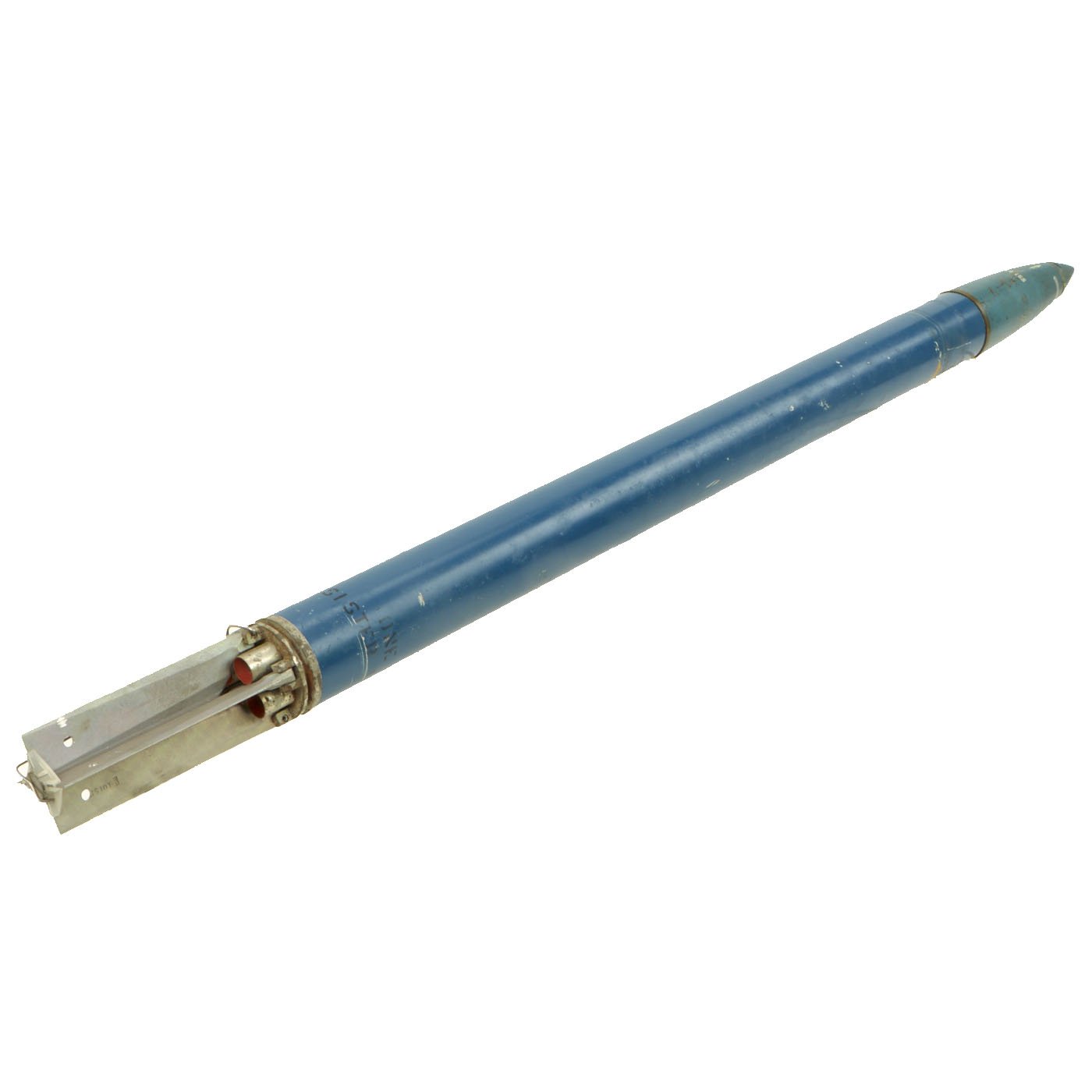 Original Item: Only One Available. Original Vietnam Era Hydra 70 Rocket with Warhead. Rocket and engine have been demilitarized for training purposes, and have been painted blue, and clearly stenciled INERT by the United States Military. These were fired from rocket pods attached to Huey UH-1B, and AH-1 Cobra Gunships during the Vietnam War in a surface-to-ground role. This particular Rocket is composed of an M-423 Fuze Assembly, a 2.75” High-Explosive FFAR warhead, and a Mark 66 Rocket Motor Assembly. Fuse is marked: The MK66 Motor Assembly is still equipped with it’s original spring loaded stabilization fins. Weighs about 20 lbs and measures 48" in overall length with a 2.75" diameter.