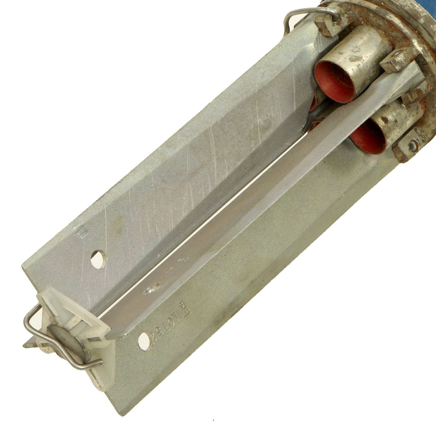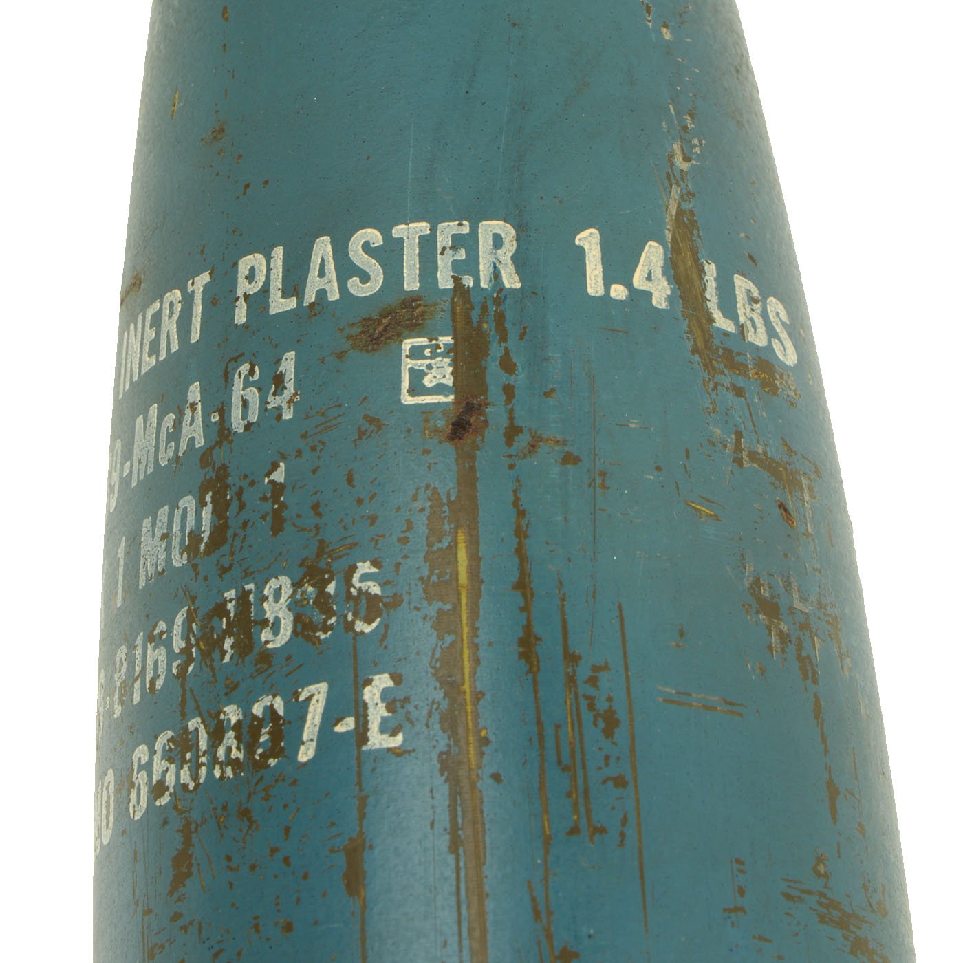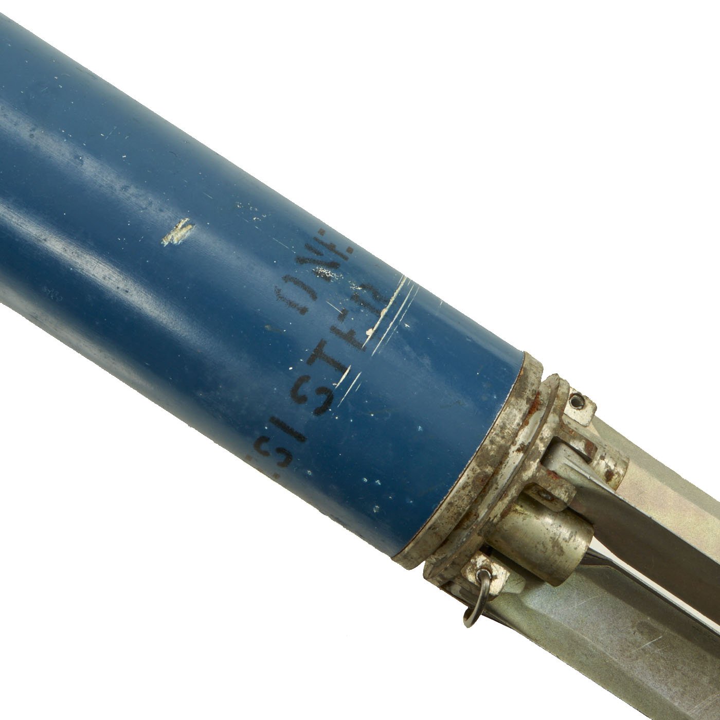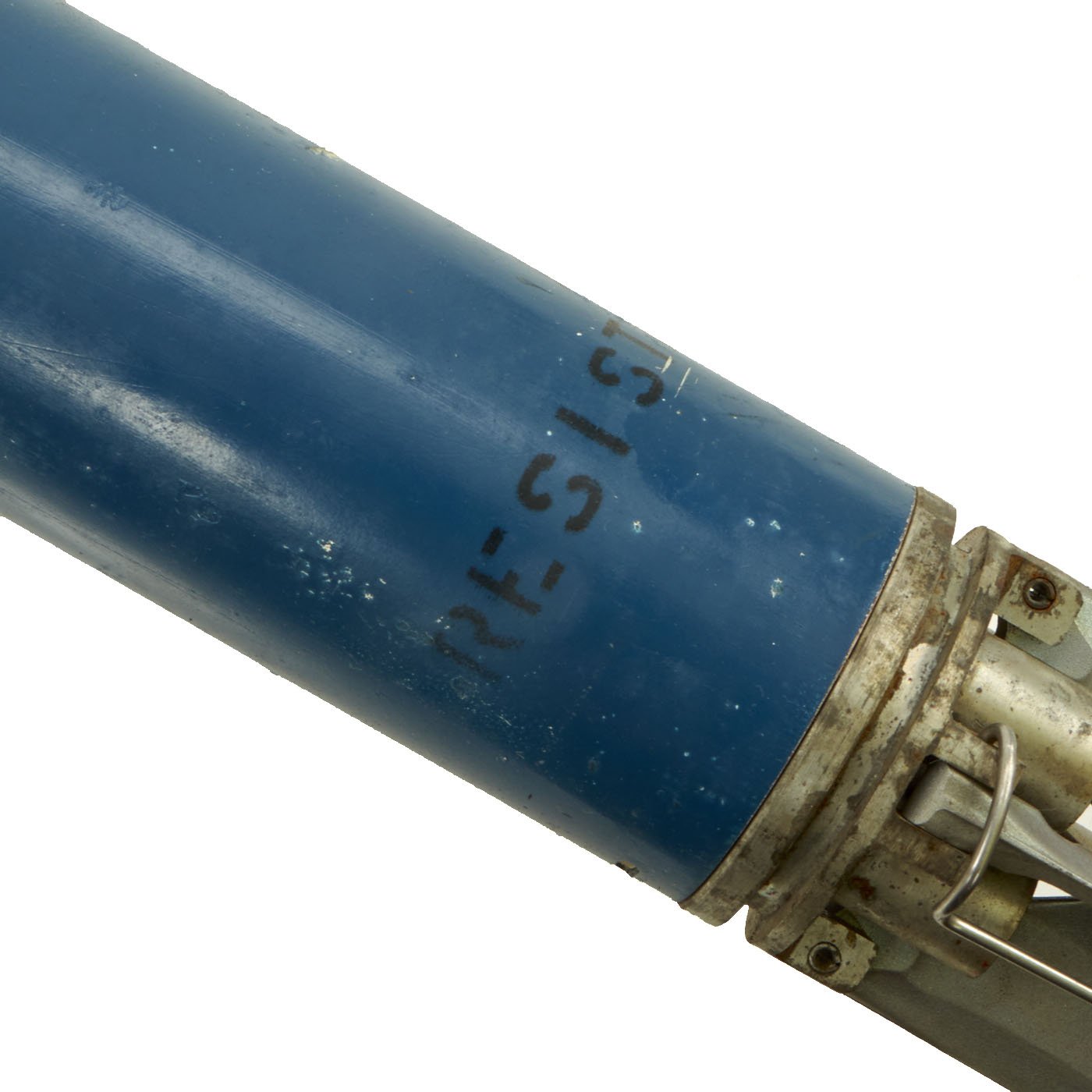 Original Item: Only One Available. Original Vietnam Era Hydra 70 Rocket with Warhead. Rocket and engine have been demilitarized for training purposes, and have been painted blue, and clearly stenciled INERT by the United States Military. These were fired from rocket pods attached to Huey UH-1B, and AH-1 Cobra Gunships during the Vietnam War in a surface-to-ground role. This particular Rocket is composed of an M-423 Fuze Assembly, a 2.75” High-Explosive FFAR warhead, and a Mark 66 Rocket Motor Assembly. Fuse is marked: The MK66 Motor Assembly is still equipped with it’s original spring loaded stabilization fins. Weighs about 20 lbs and measures 48" in overall length with a 2.75" diameter.