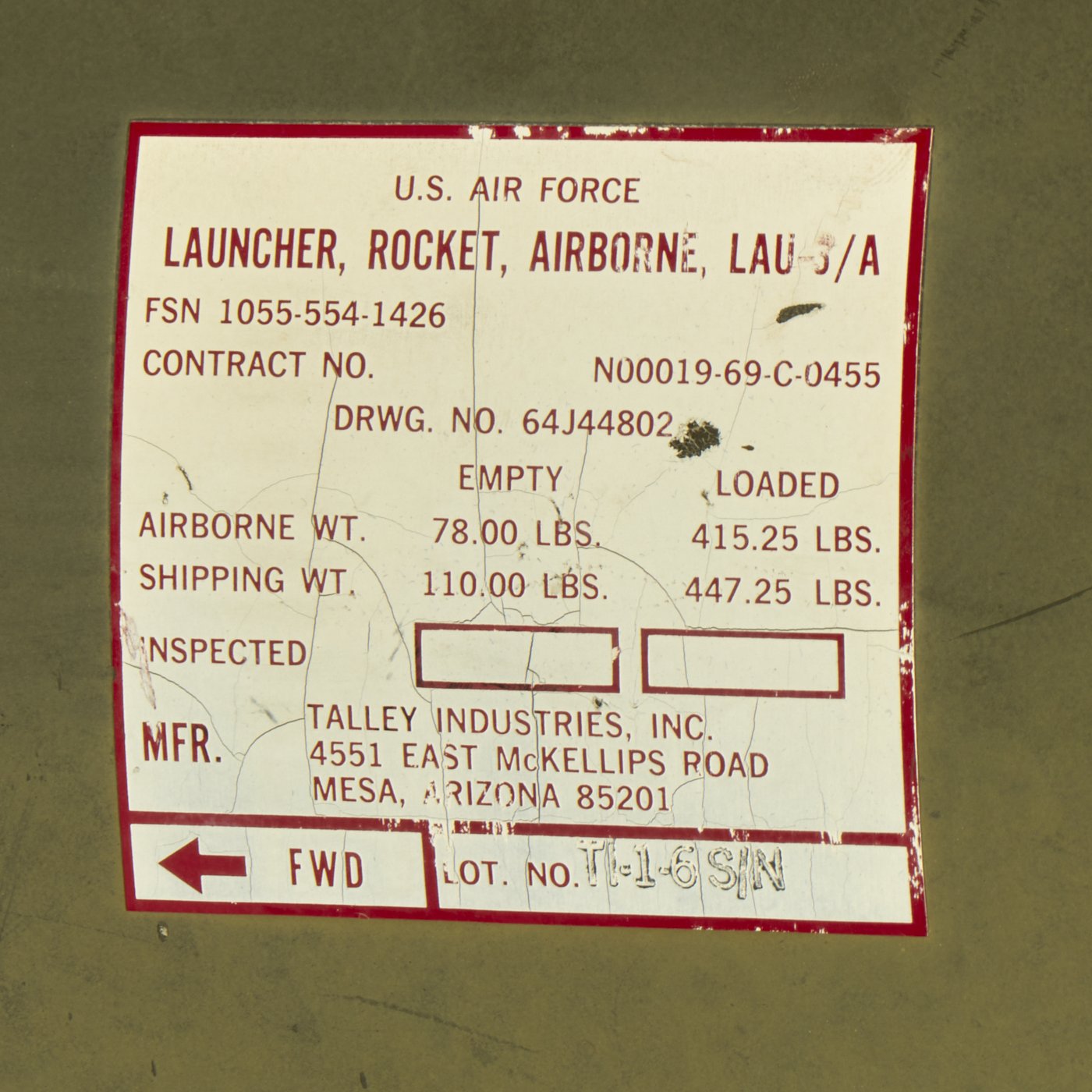 • Original Item: Only One Available. Well, you won't see one of these again anytime soon! The United States was the primary user of this type of weapon and developed a number of different launching pods for it. LAU-3 pods were constructed of aluminum-reinforced cardboard and were intended to be disposed of either on the ground after a mission or by dropping them in-flight. With the advent of the armed helicopter, and the increased usage during the Vietnam War, the need for launching pods that were reusable became apparent, so that later models were of all-metal construction. Though the rocket was initially developed by the US Navy, the US Air Force and later US Army were most responsible for the development of rocket pods for all services. You can see on at the National Air Force Museum at this link.