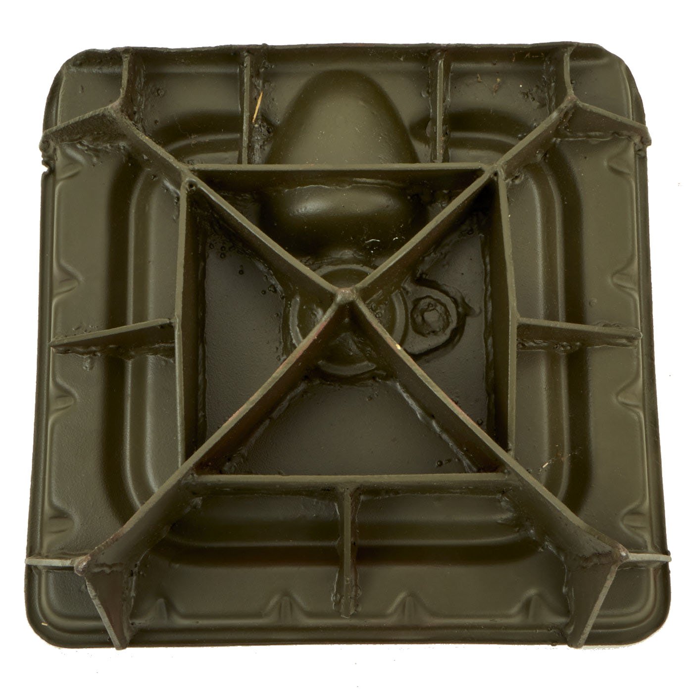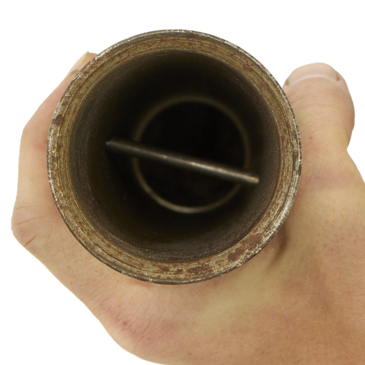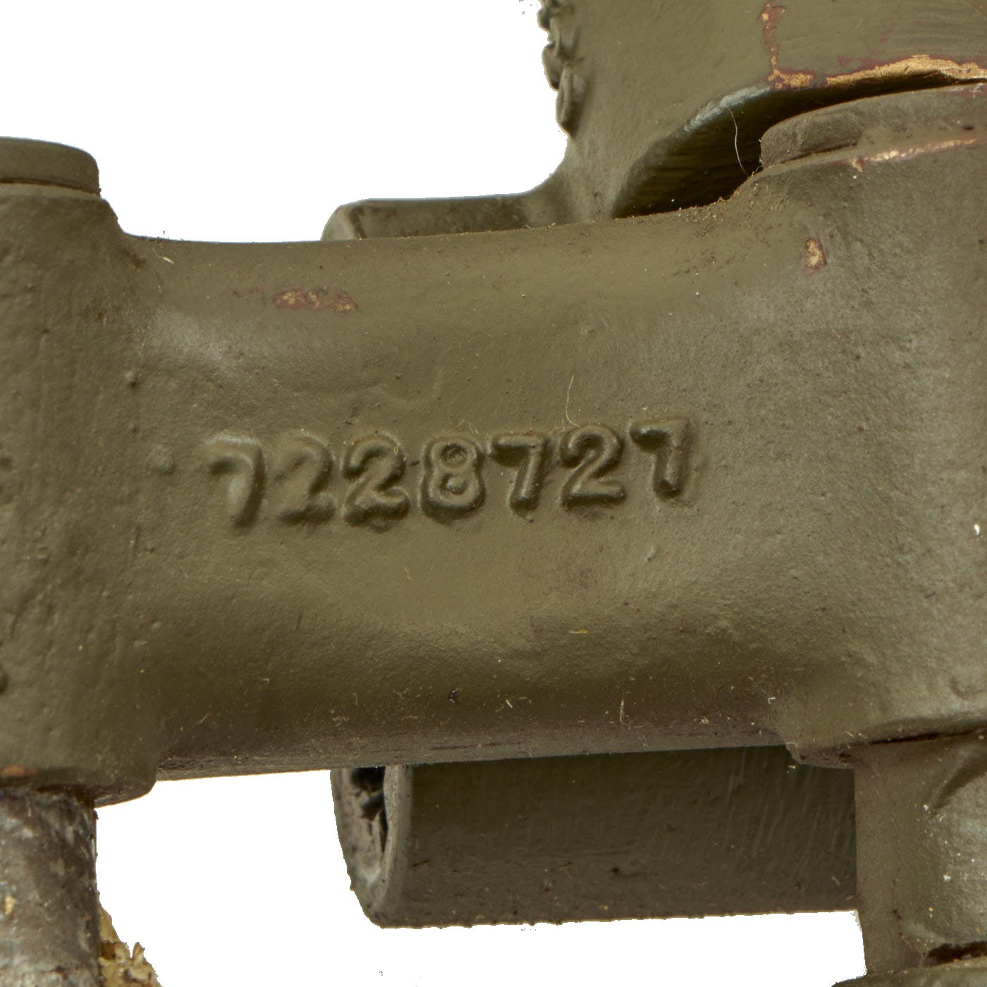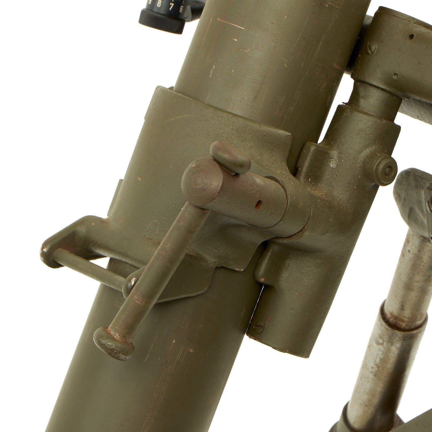 Our non-firing display Mortar is offered in excellent condition. Unlike previous offerings, this has an original tube, demilitarized to BATF specifications, with a bore-width hole in the side and welded-in cross pin. It also features an original adjustable M5 bipod mount and original base plate. The T&E mechanism works perfectly, the leg angle adjustment works correctly.