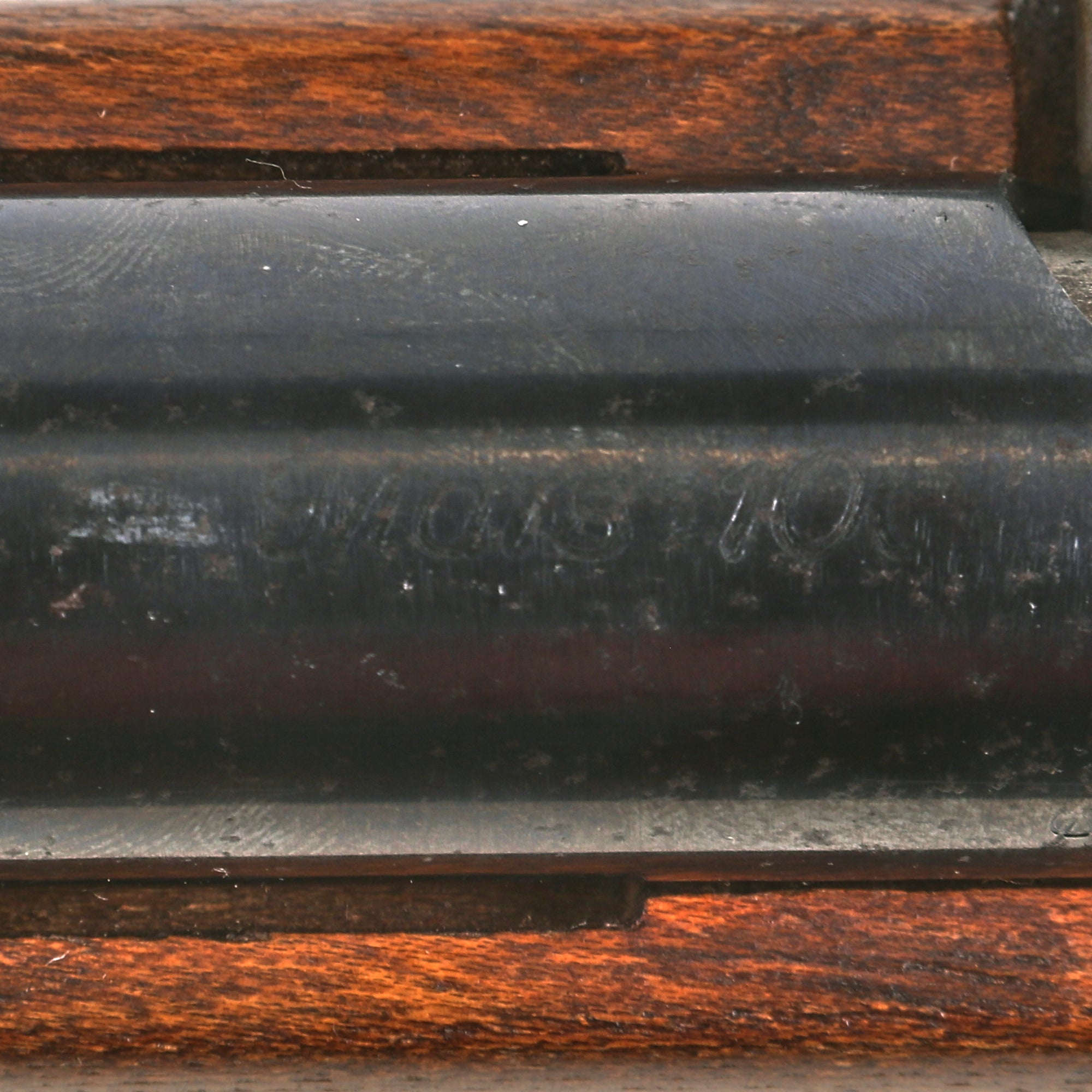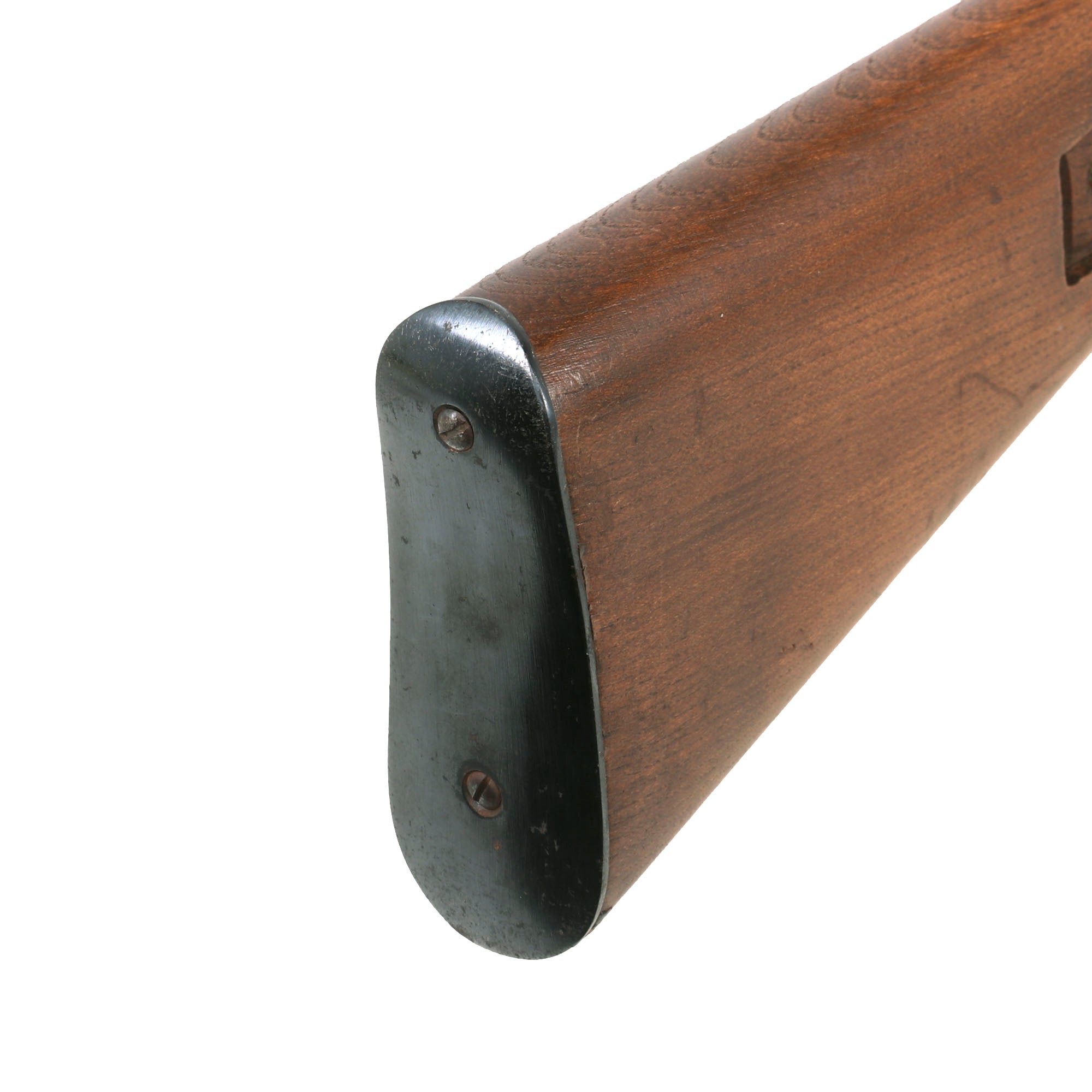 Condition of the air rifle is very good, with much of the original heavy blue finish still present on the barrel and receiver, showing just a bit of wear and oxidation in areas. The trigger, trigger guard, and butt plate are in similar condition, while the barrel bands are painted steel. The "bolt" assembly was originally in the white, and now is stained to a somewhat brown color. The stock shows only light denting and scratches from service and storage, though there is a cracks on the bottom running from both trigger guard securing screws. We have tested the action, and it cycles correctly and dry fires, though we have no way of testing to see if it is still functional, and the trigger sometimes does not hold the rifle cocked. The safety does not appear to function correctly, and attempting to move it will discharge the air rifle.