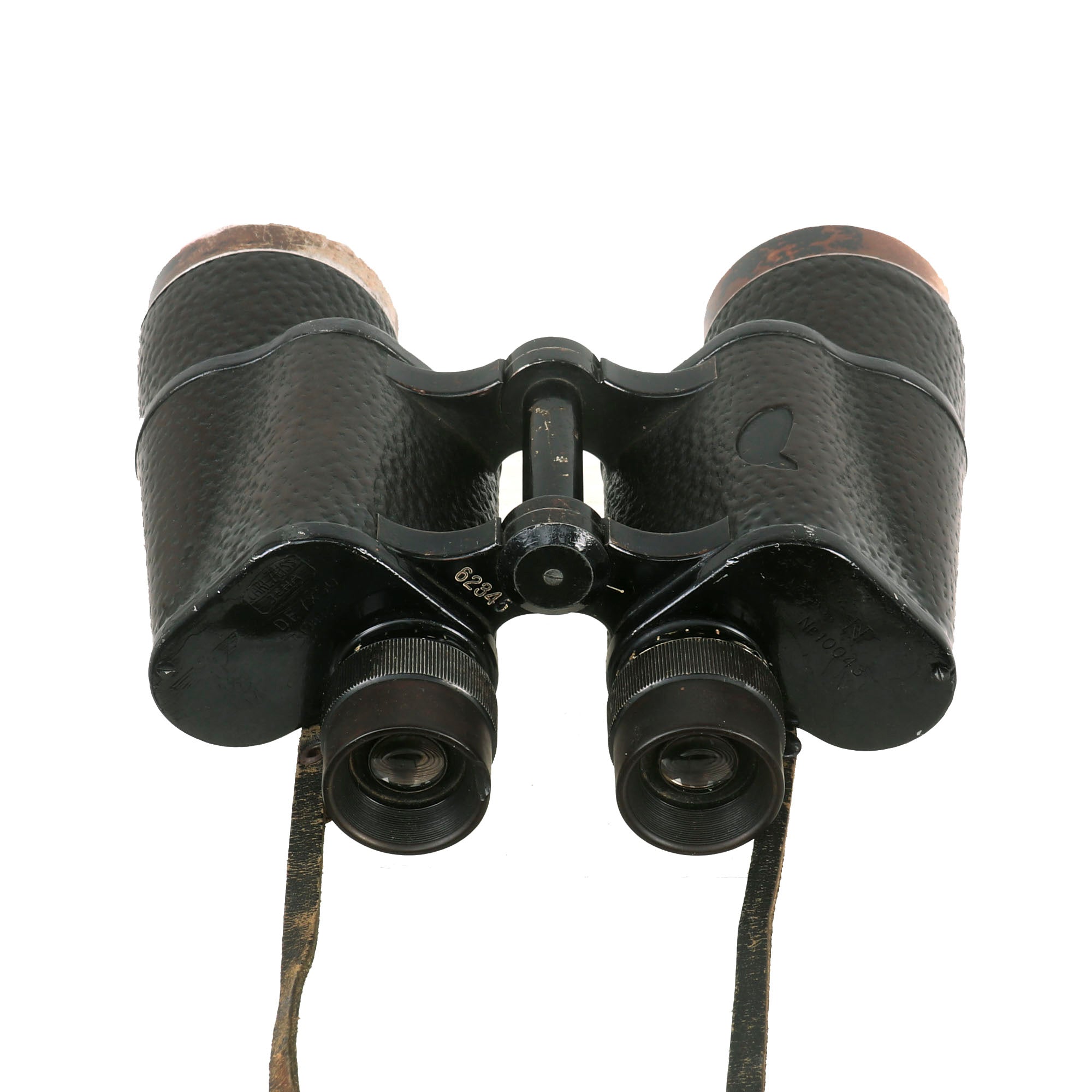 They are also marked with serial number 62345 on the objective end of the hinge. Research shows that the "N" stands for Nordsee (North Sea), and we have seen other examples with this same marking. These were manufactured by Carl Zeiss, Jena, Militärabteilung, a well known maker of optics during both World War I and World War II. These were only issued for Kriegsmarine use and have the Marinewaffenamt Eagle / M proof mark on the rear of the left barrel.