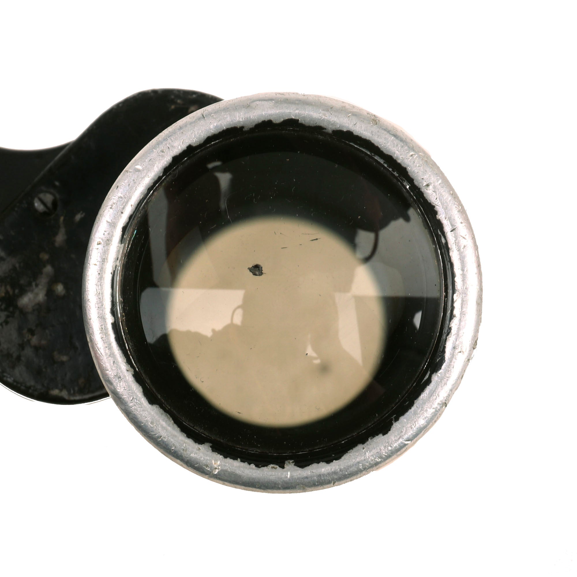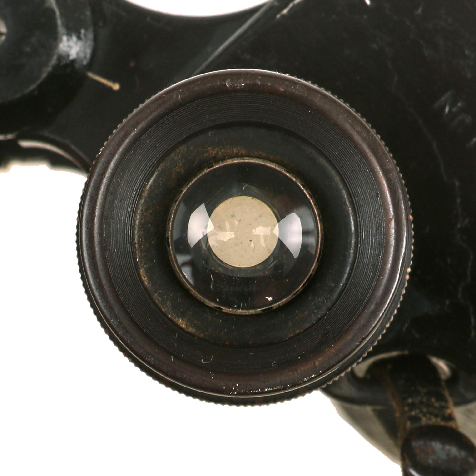 The binoculars are really in great shape, with the optics showing just a bit of haze, and both focus diopters functioning correctly. These do not have a range reticle / graticule in either eyepiece. This set does not have the bakelite eyecups. As with most WWII German binoculars they are non-magnetic, and the body is in great shape, with the textured coating mostly retained, showing just a few areas where it flaked off.