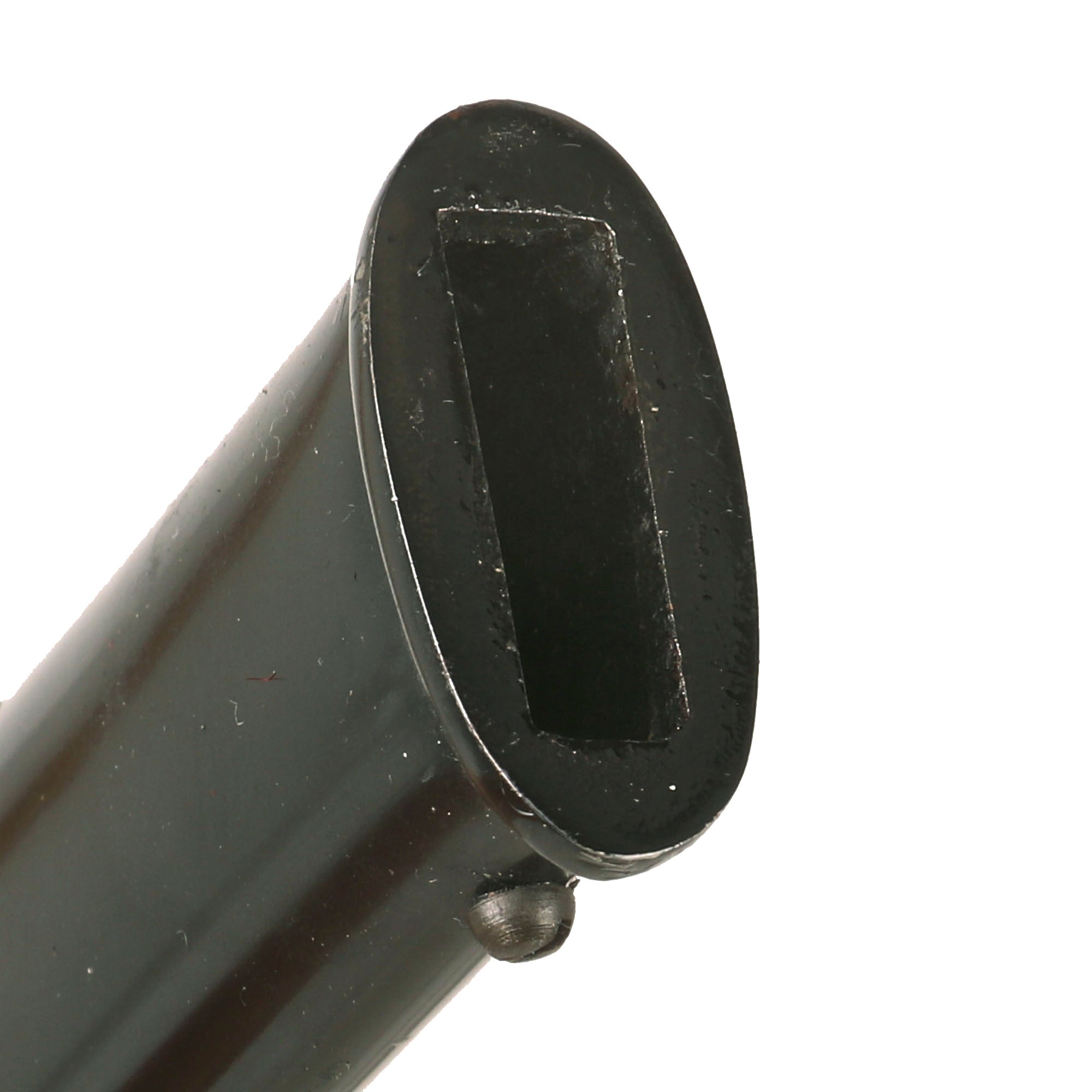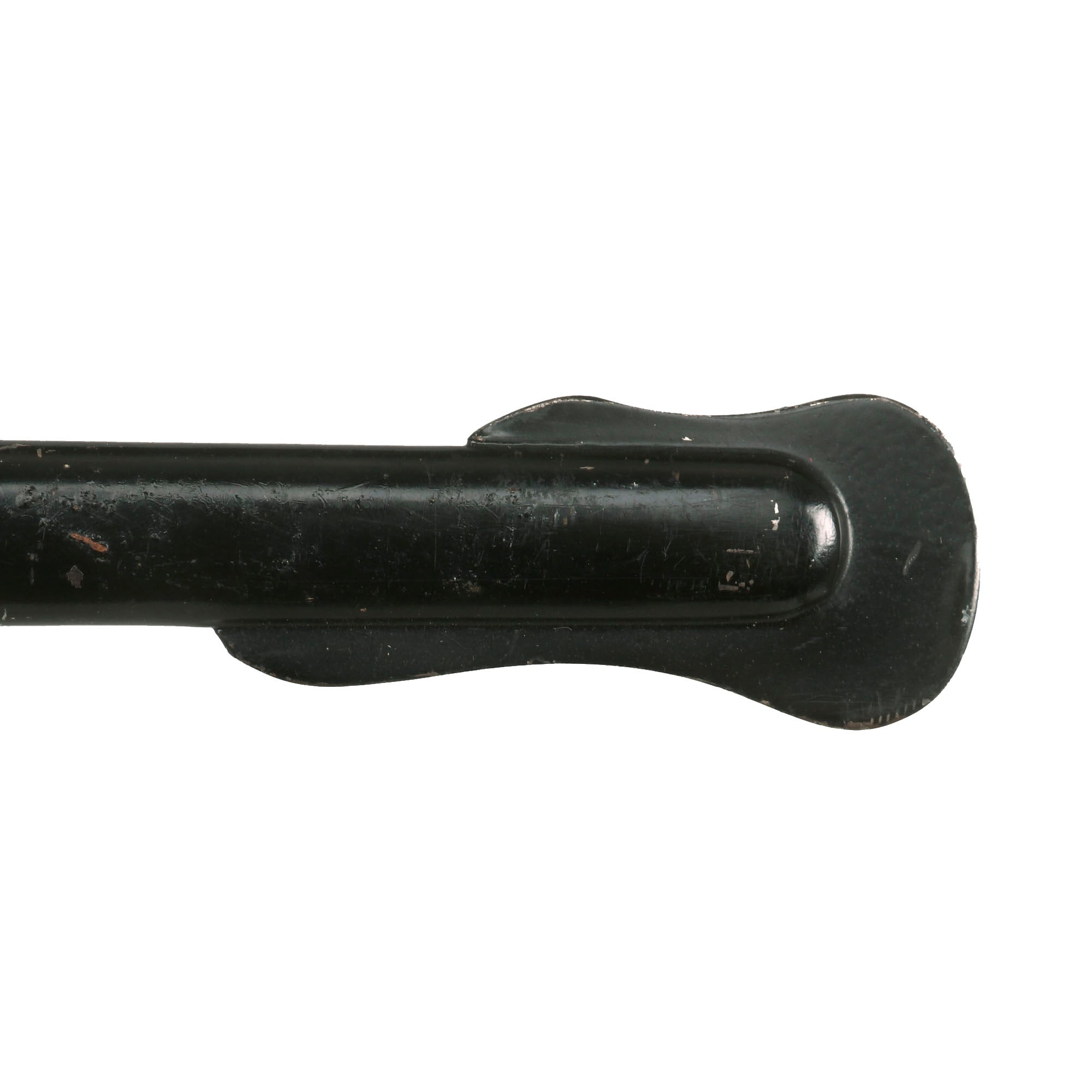 The scabbard of this example still has a very good black enamel finish, it is retained at over 95% with no dents that we can see or feel. It does look like it may have been refinished once at the factory. There is a bit of scuffing and crazing, but overall this is one of the better examples that we have seen. There is some wear near the hanger ring, through to the base metal as is typical.