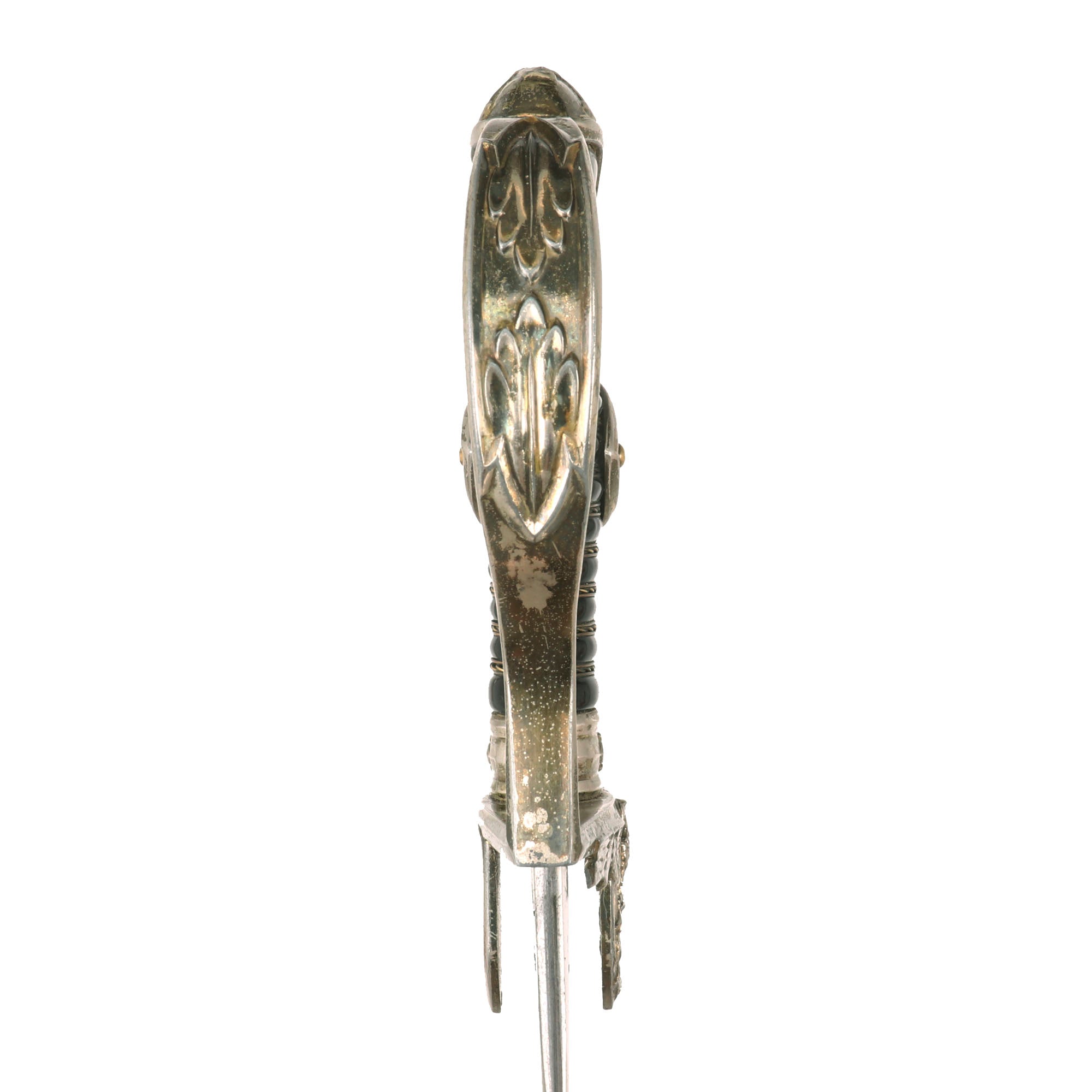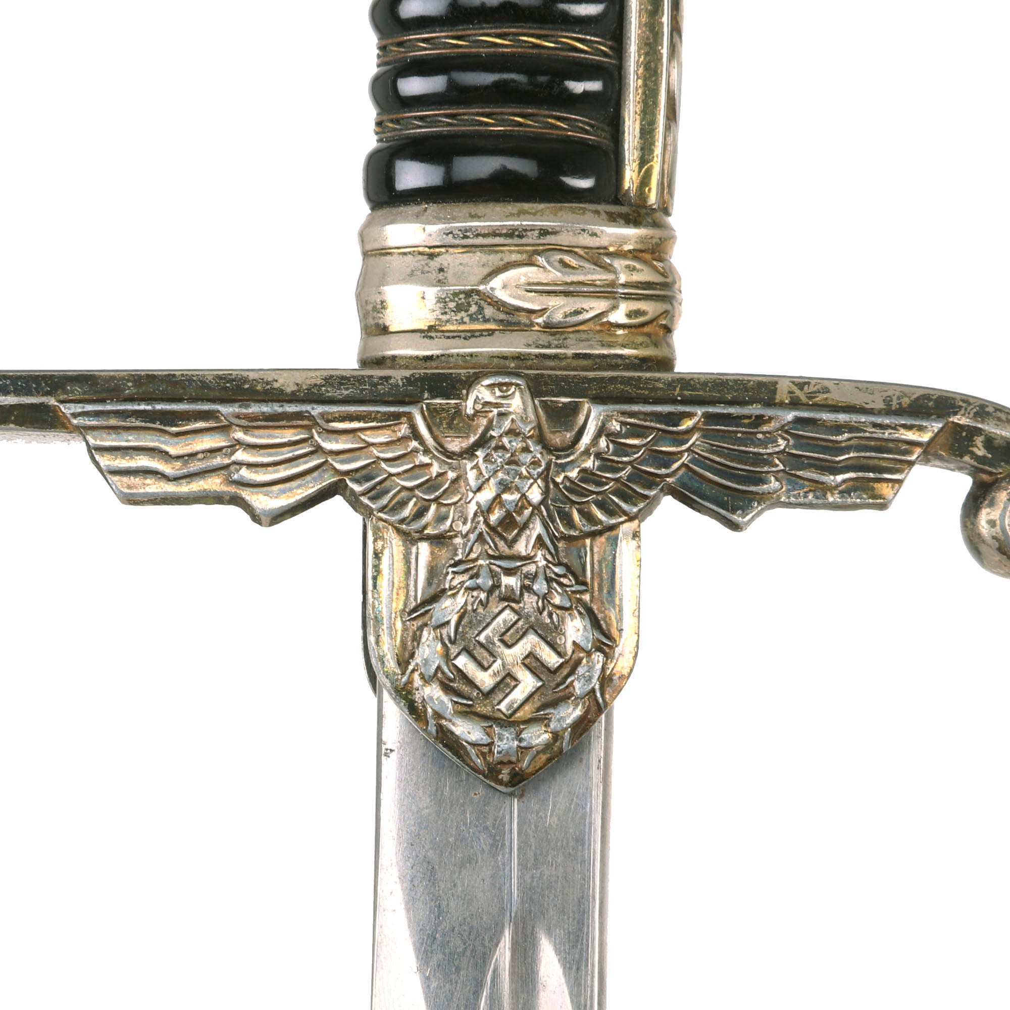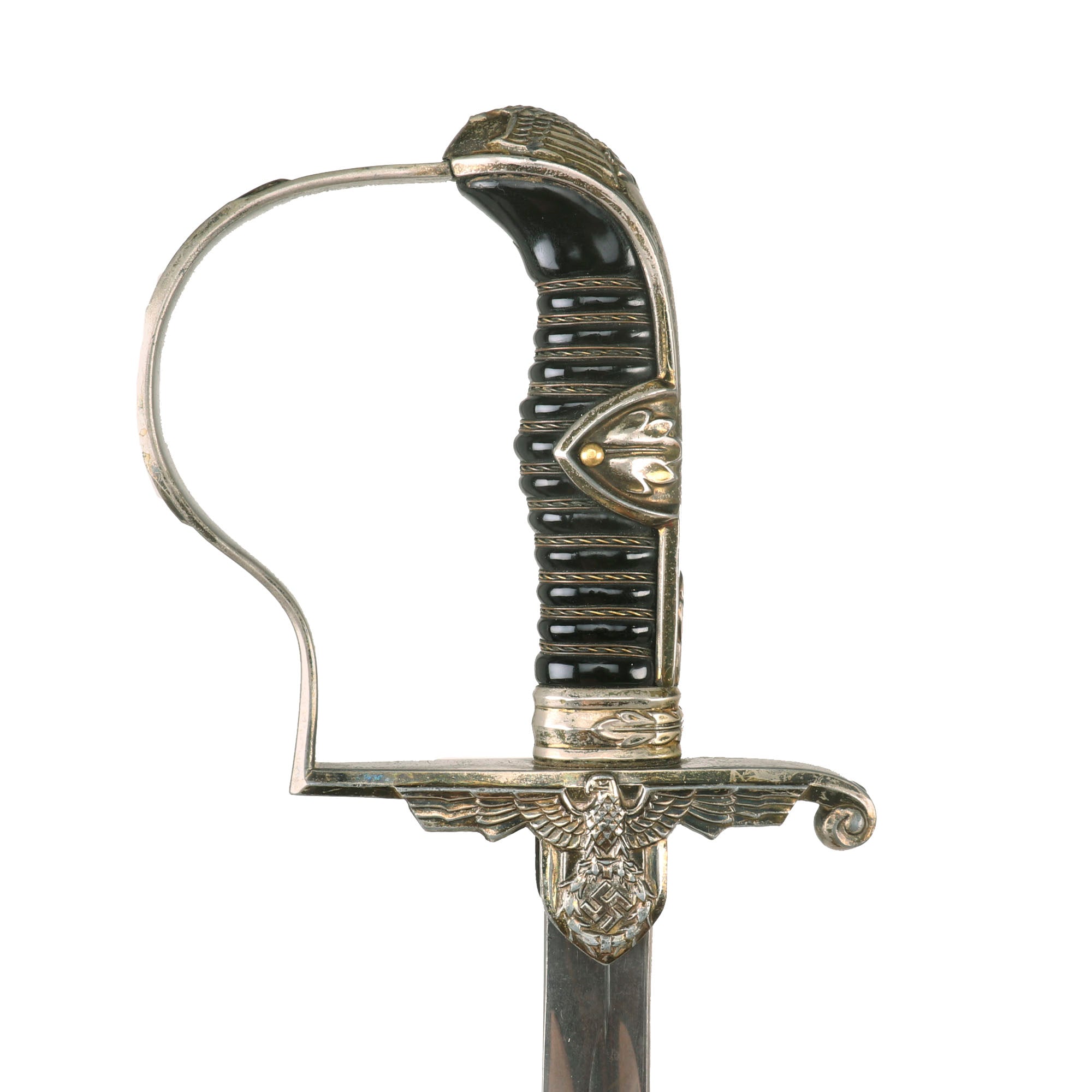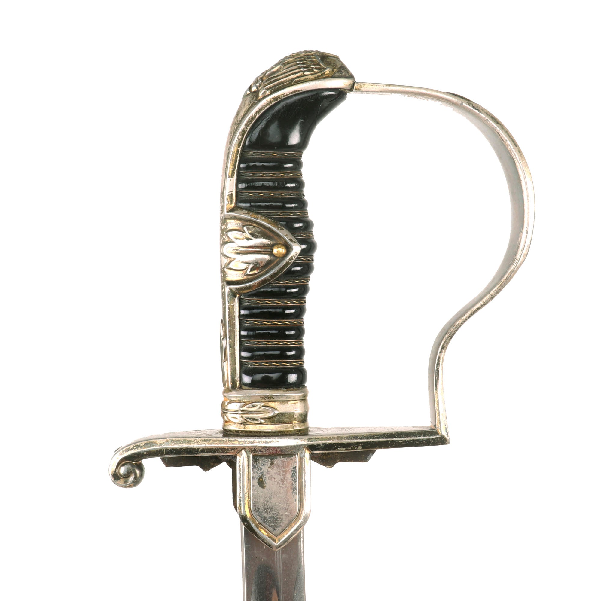Original Item: Only One Available. This is a very nice example of the very desirable "Prinz Eugen" (Prince Eugene) variation of the popular Feldmarschall (Field Marshal) series of German "Dove Head" officer swords. It was made by famed firm Carl Eickhorn of Solingen, the legendary "City of Blades" in western Germany. The Field Marshal series was quite popular, and had a total of nine different variations, named after famous figures in German history, many of which were high ranking military officers. These included the Wrangel, Scharnhorst, Freiherr vom Stein, Roon, Derfflinger, Zieten, and Blücher patterns. The Prinz Eugen and Lützow patterns were added in 1938 and 1939, which are the rarest patterns to find. The Prince Eugen style was very popular among SS officers before their own M36 Officer's degen sword was introduced.