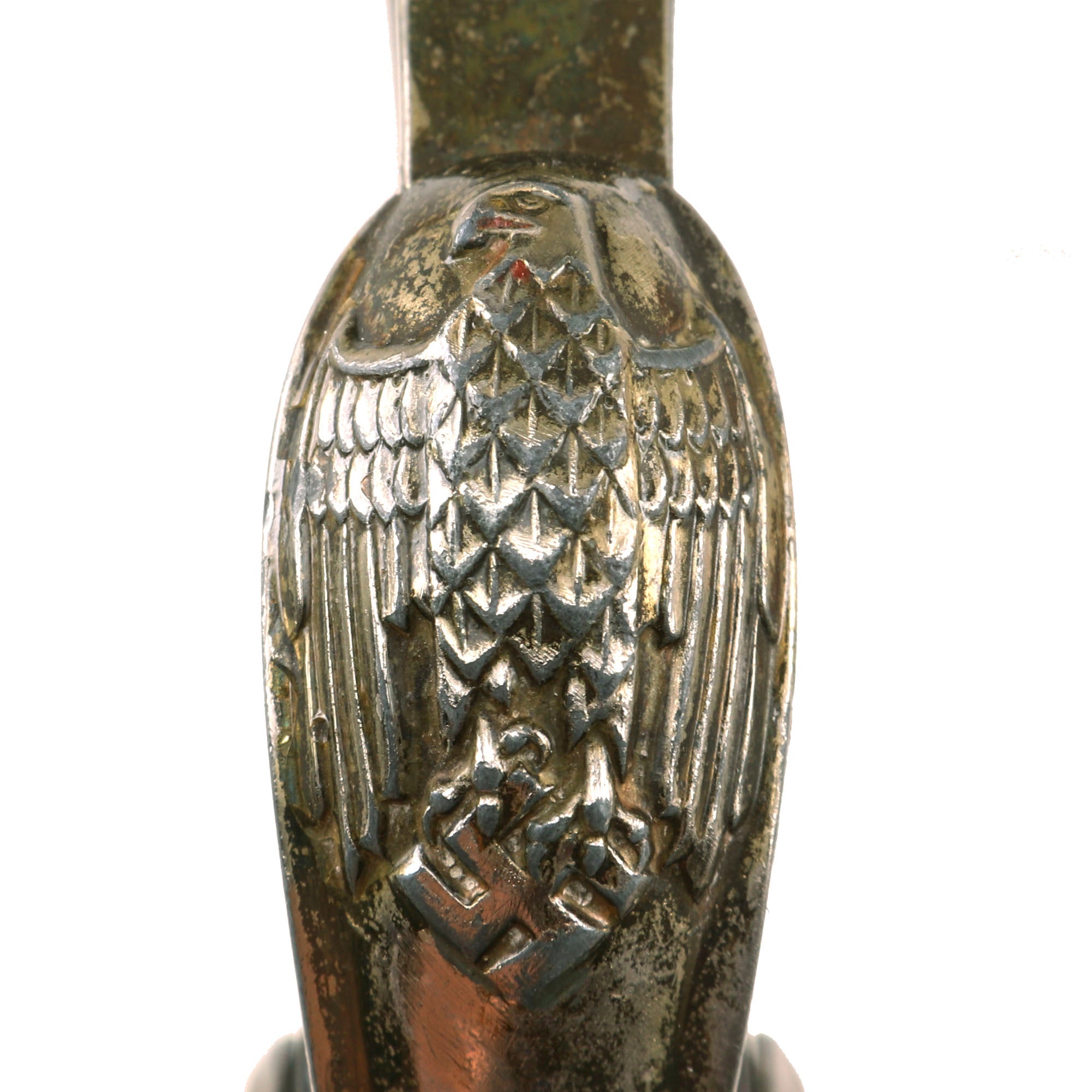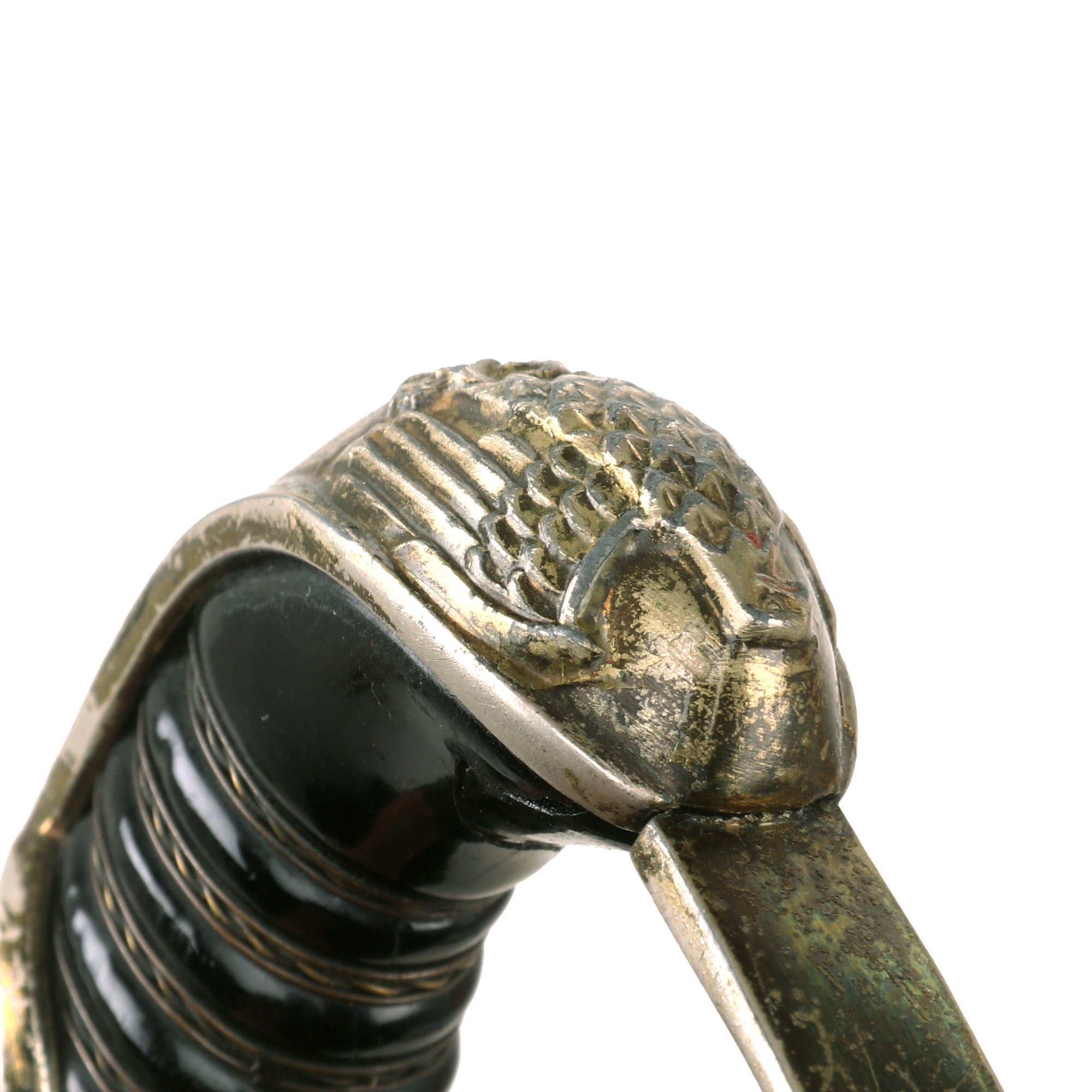 The hilt of the sword is the later war style, made with an aluminum alloy base that was originally brass plated and then gilt. This combination of hilt metals was often susceptible to plating loss, and unfortunately only around 30% of the gilding remains, with areas of oxidized brass visible. The Prinz Eugen design features a less ornate pommel than many others, with simple leaf designs, back strap, "P"-guard and ferrule. The "dove's head" has an NSDAP Reichsadler (National Eagle) on it, and the cross guard has an "SS-Style" open-winged eagle which looks to the viewer's left. This art-deco eagle has fine crispness to his eye, breast feathering and raised out swas (hook cross) within a wreath.