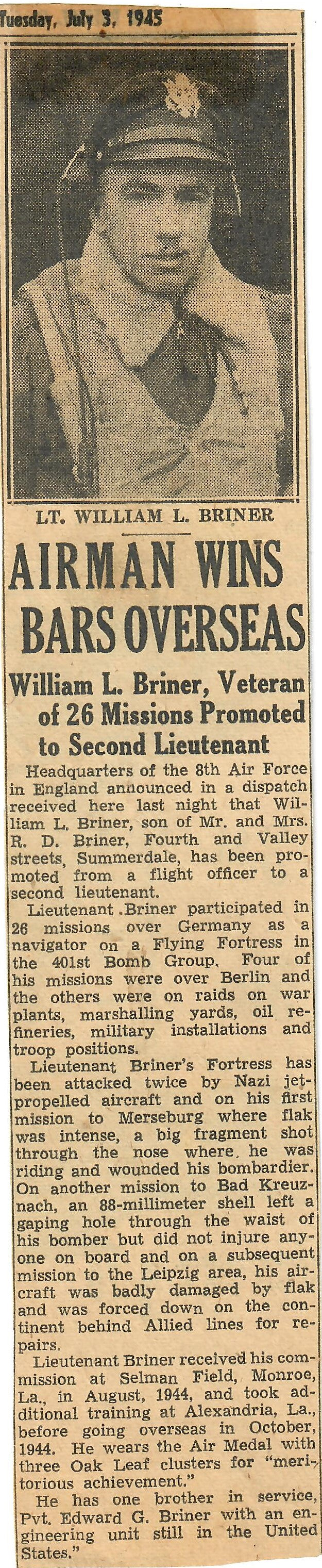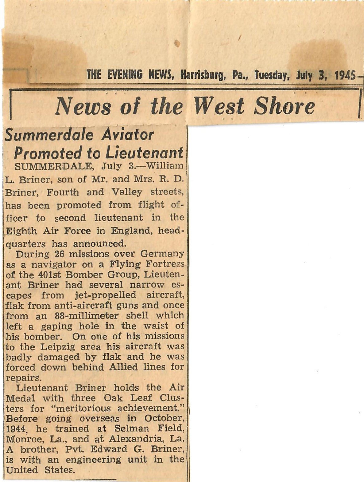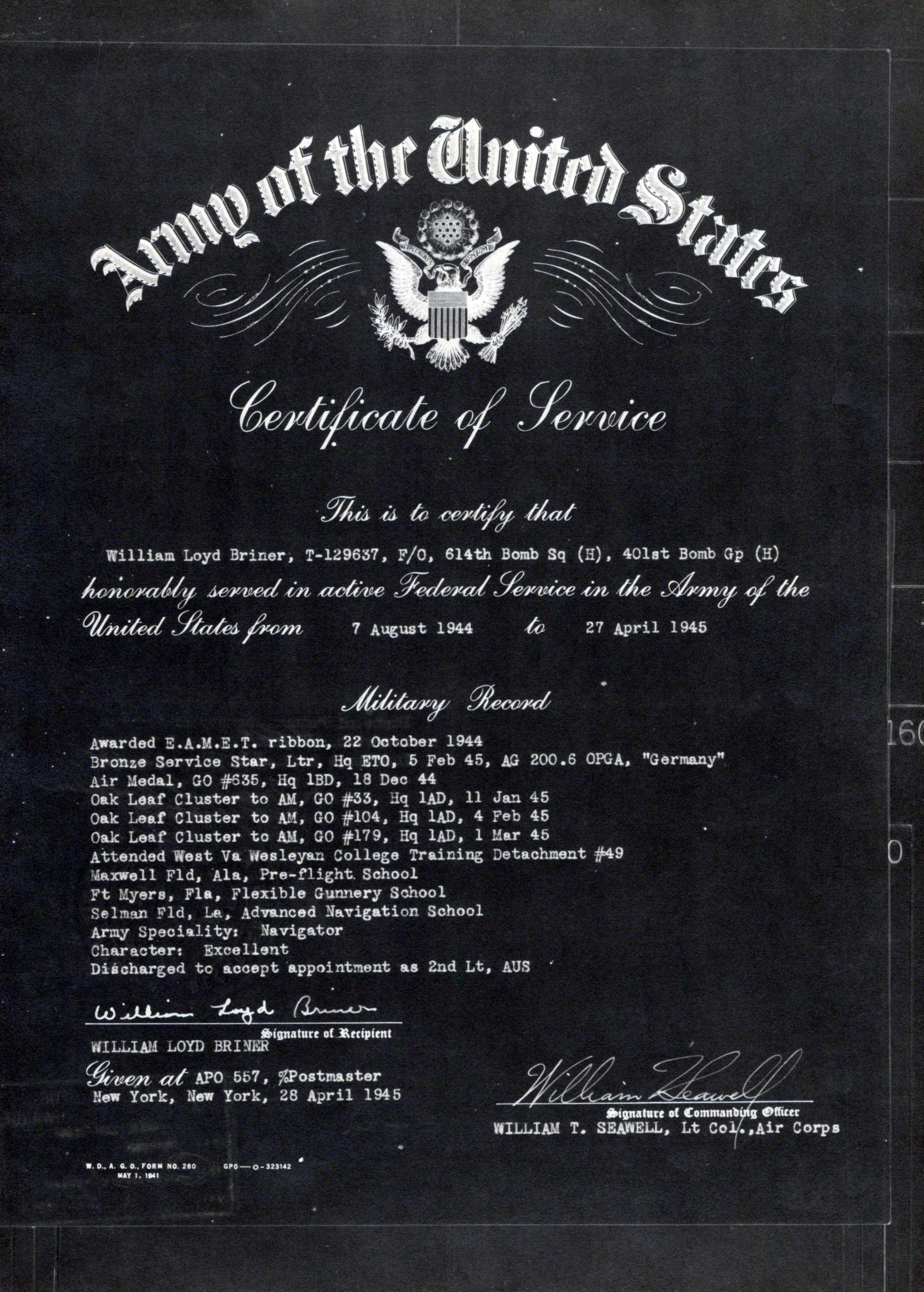 William Lloyd Briner was born on April 14th, 1924 in Mechanicsburg, Pennsylvania. He spent over a year training at a flight school before officially entering active duty on August 7th, 1944 as a Navigator. He departed for Europe on October 23rd, 1944 and returned stateside on July 20th, 1945, being separated from service on September 30th, 1945. He passed away on December 16th, 1990 at his home in Harrisburg, Pennsylvania.