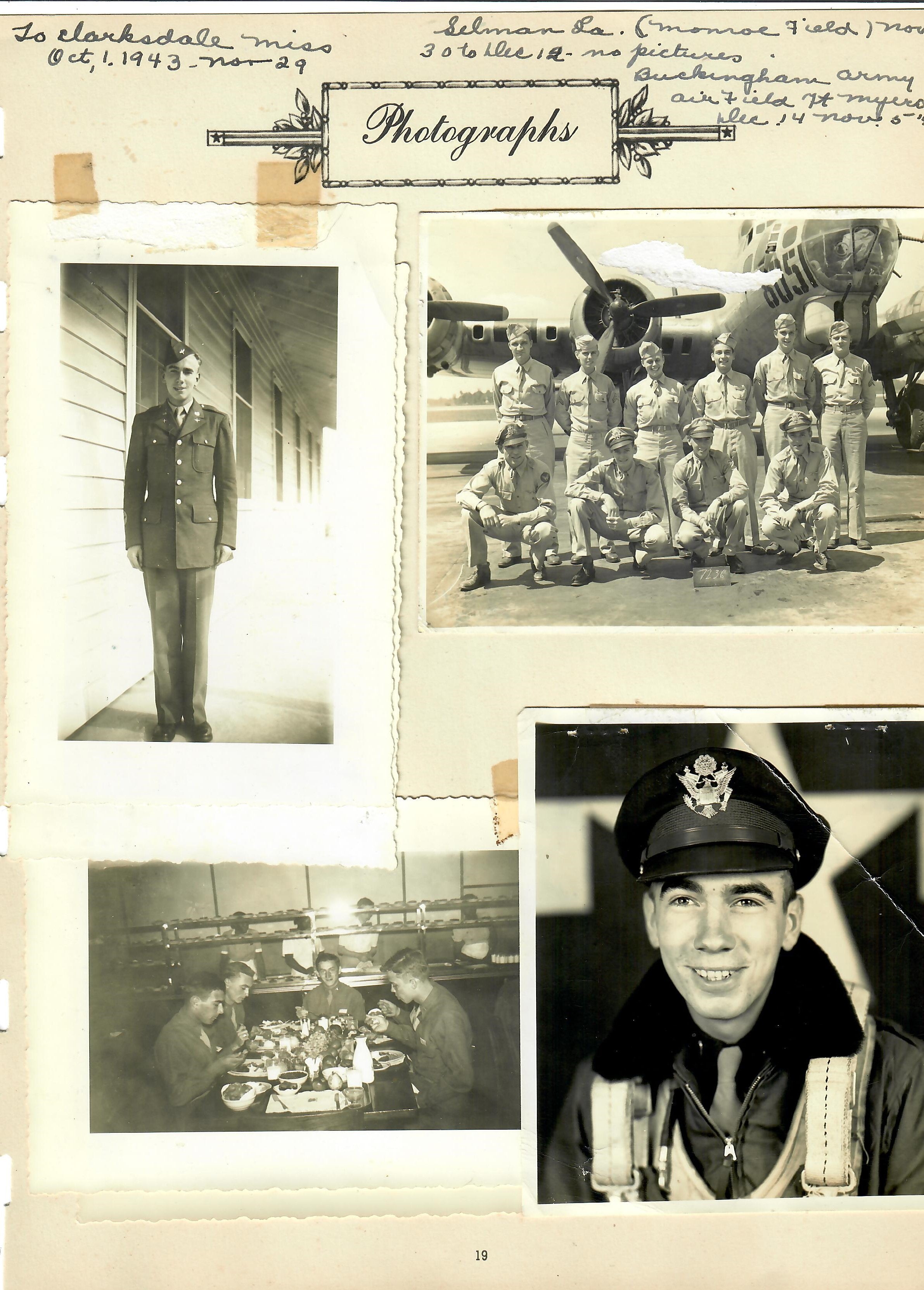 - A second Riker case which displays his Pilot Log from training in 1943, with several pages filled, his address book in which he took down names and addresses of friends he met overseas, 4 more photos of him, a second address book filled with names and addresses, a small piece of glass with a note reading Miami Florida Bill 1943, and his nametag from his Bomb Group’s veterans organization.