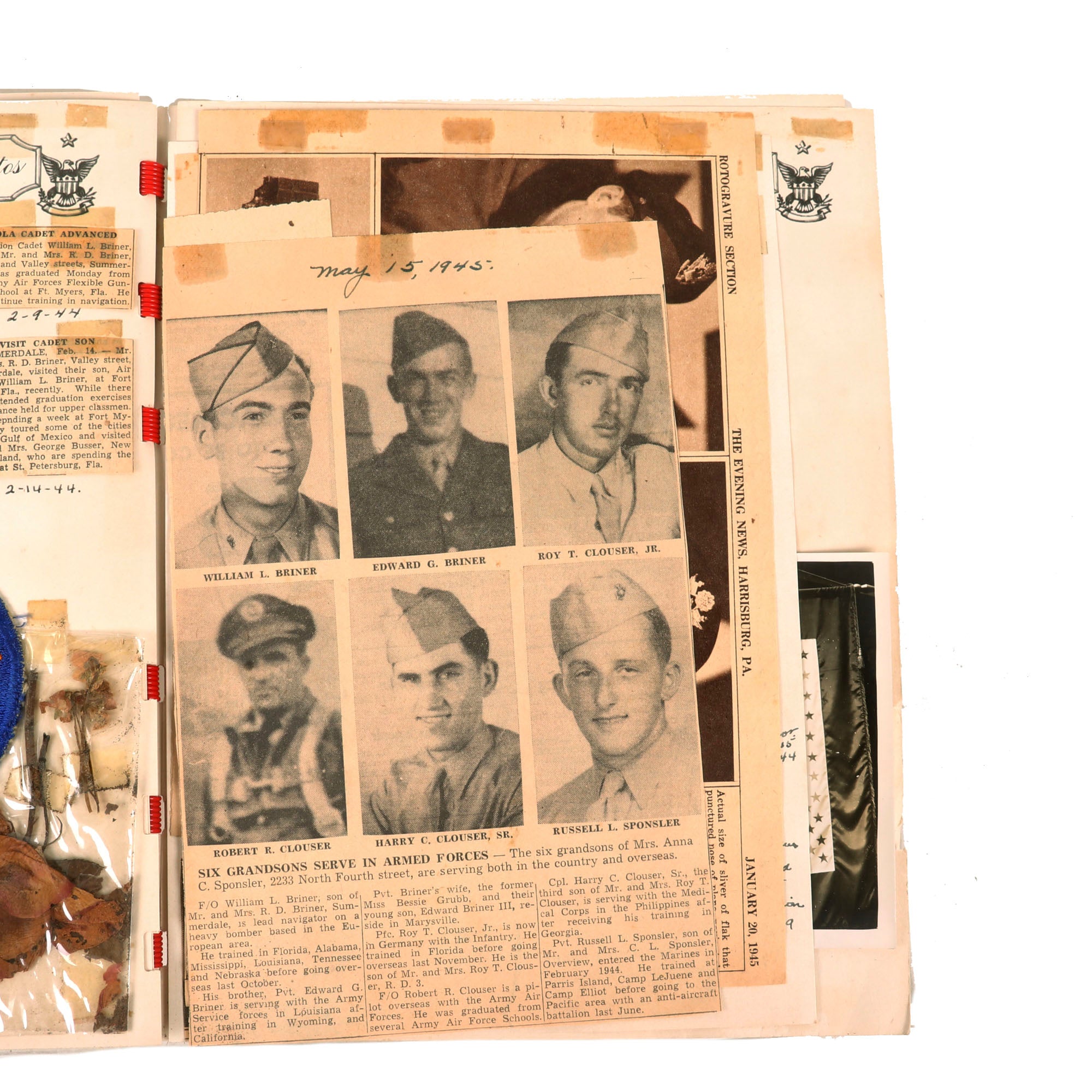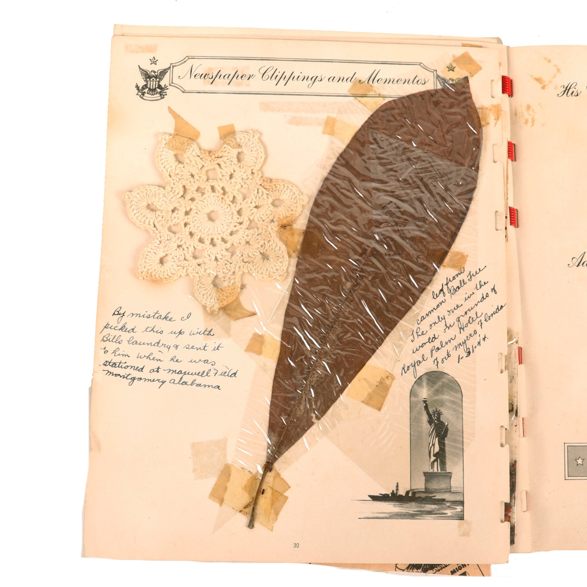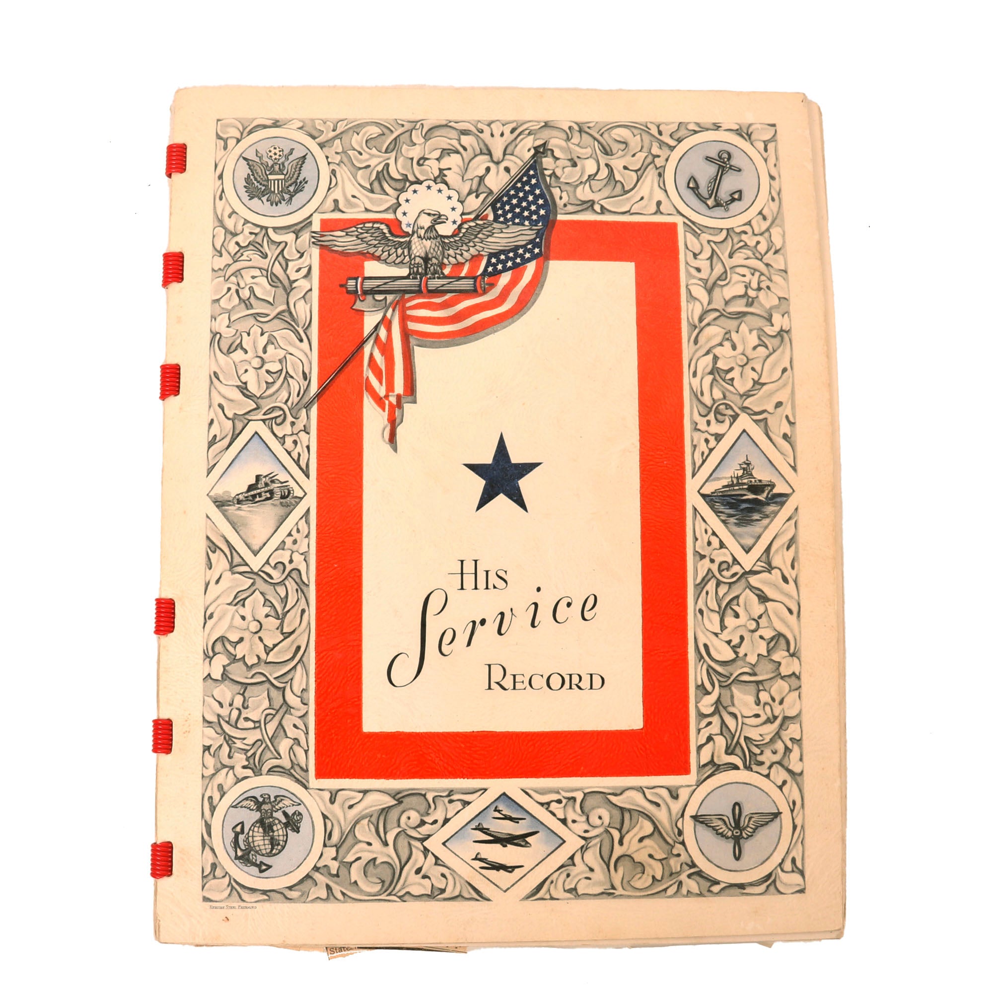 -”His Service Record” A book sold to families of soldiers to be filled with ephemera and information about their service. This example is FILLED with information as well as photographs and dozens of original newspaper clippings with mentions and photographs of Briner, as well as souvenirs he pasted in near the end including a large leaf and roses, a patch, and more. Over 30 original photos with an AMAZING photo of him and his father wearing his World War I uniform!!!! This service record is filled as much as it could be!