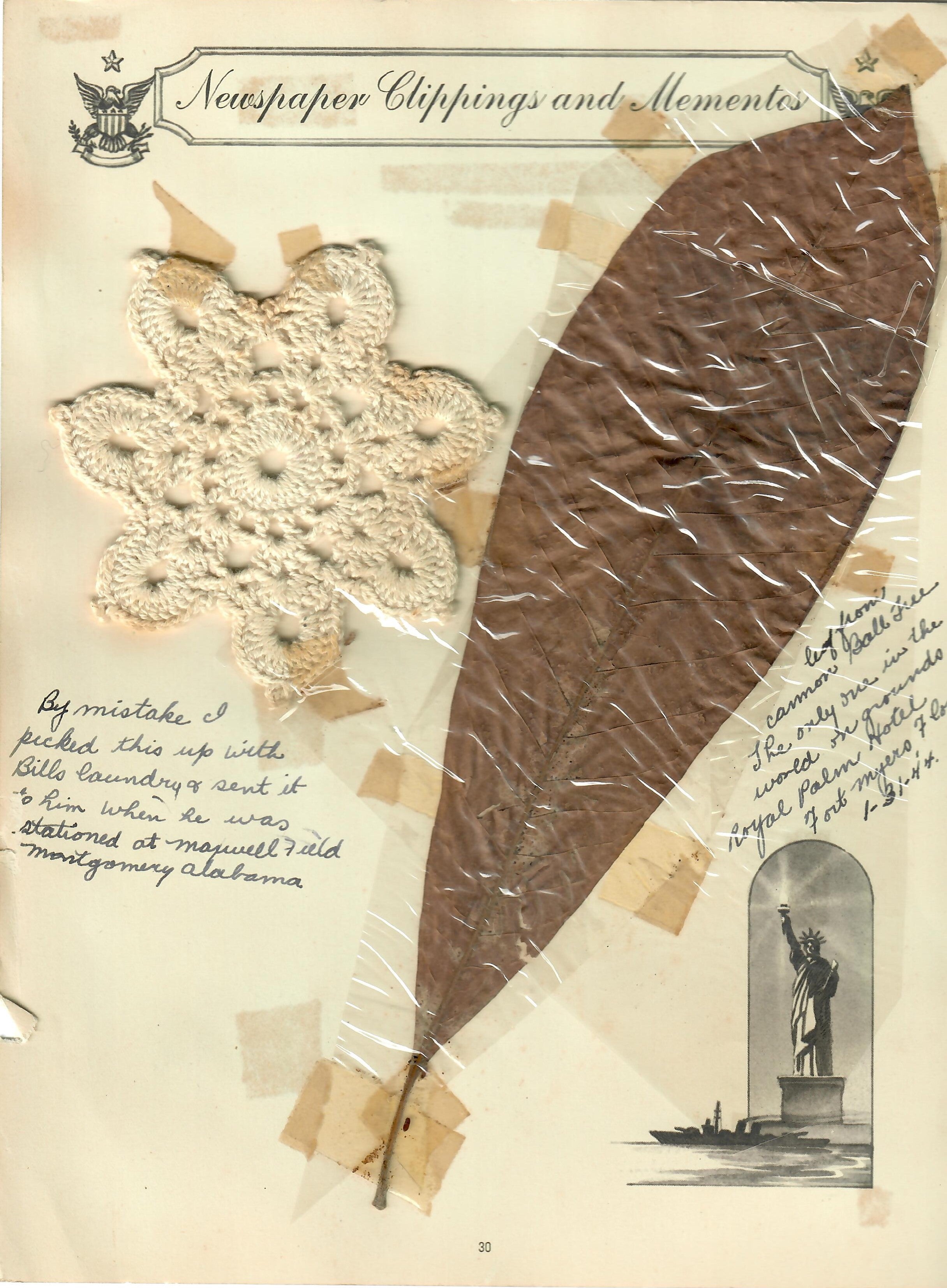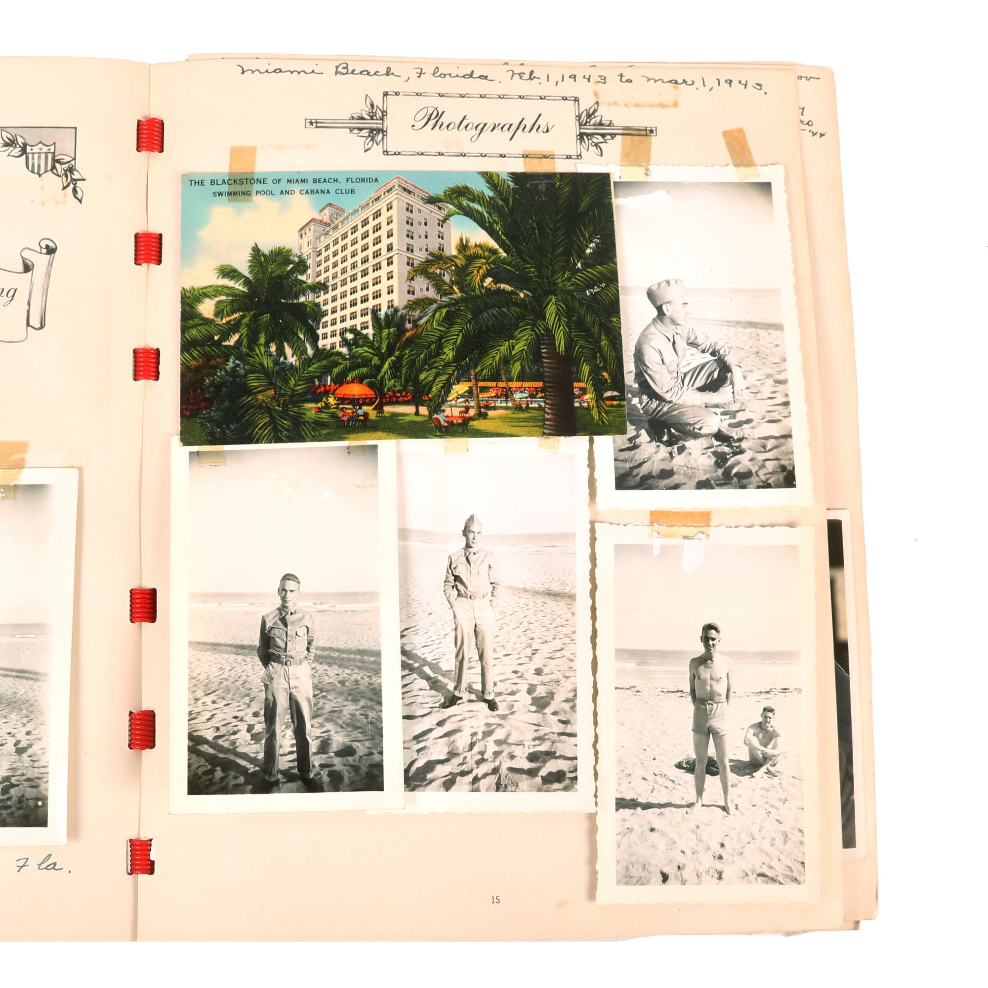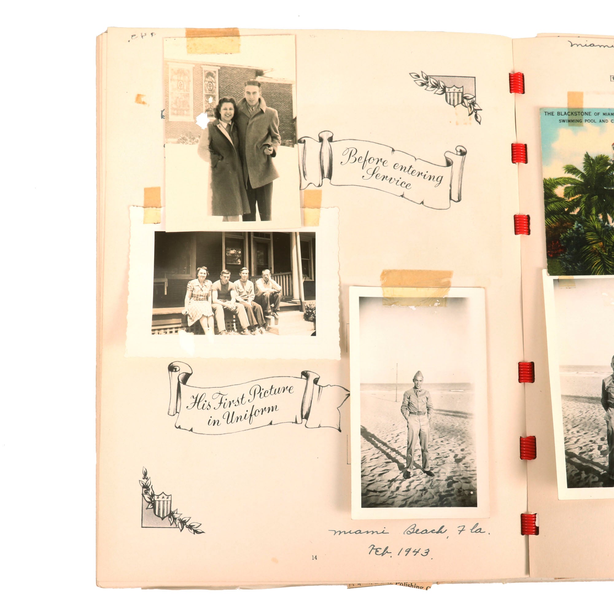 -”His Service Record” A book sold to families of soldiers to be filled with ephemera and information about their service. This example is FILLED with information as well as photographs and dozens of original newspaper clippings with mentions and photographs of Briner, as well as souvenirs he pasted in near the end including a large leaf and roses, a patch, and more. Over 30 original photos with an AMAZING photo of him and his father wearing his World War I uniform!!!! This service record is filled as much as it could be!