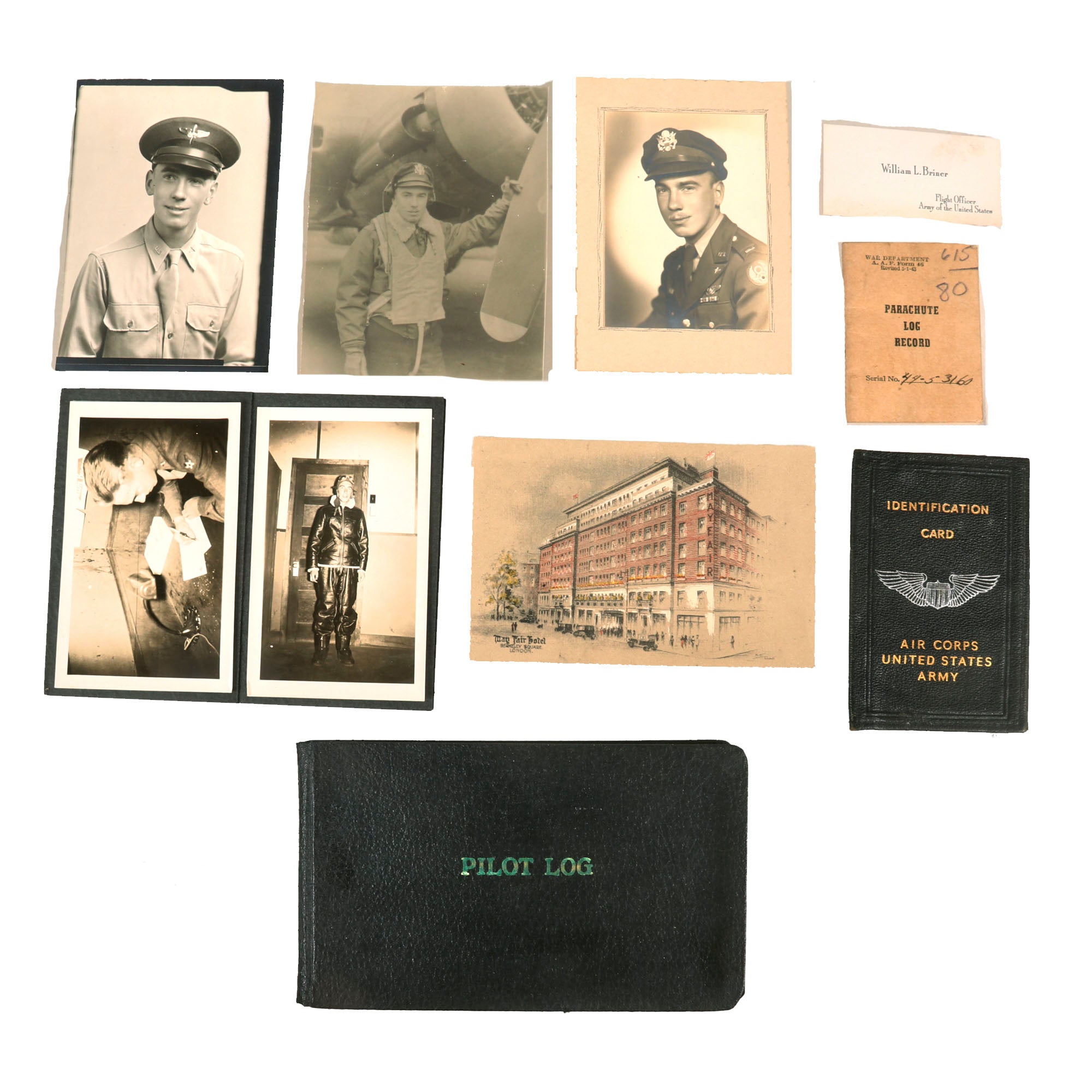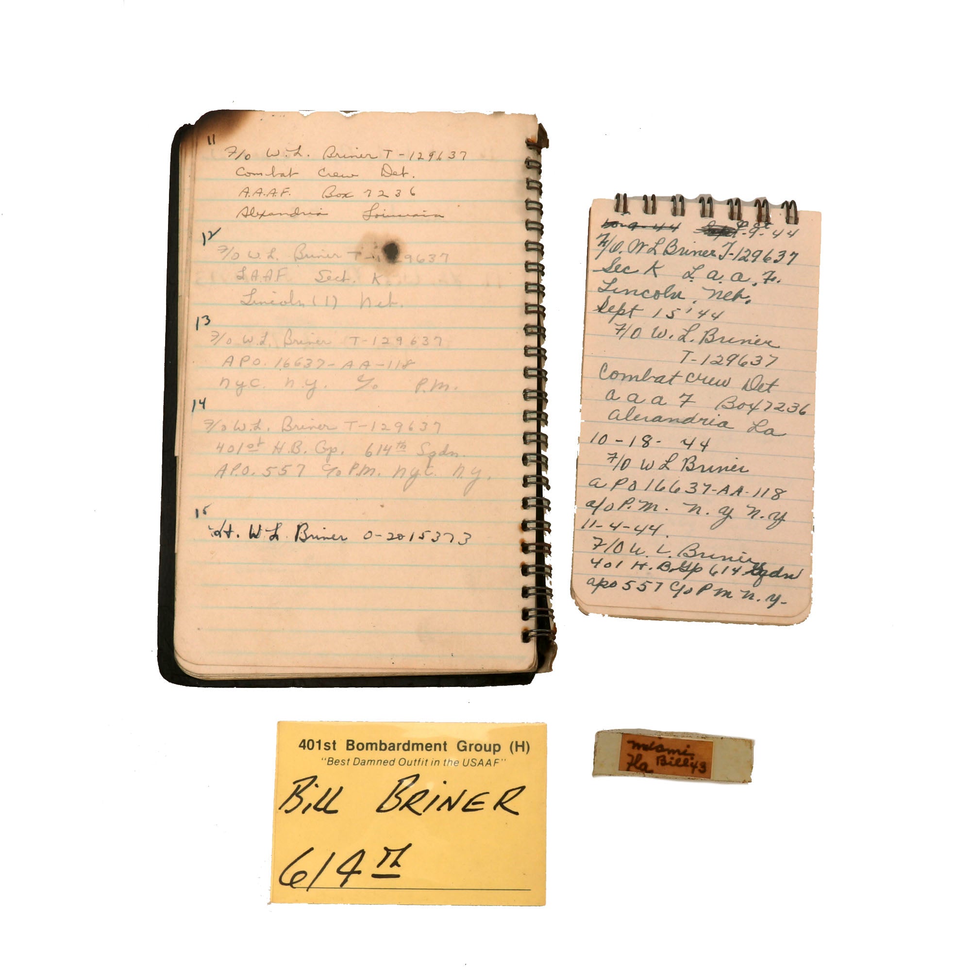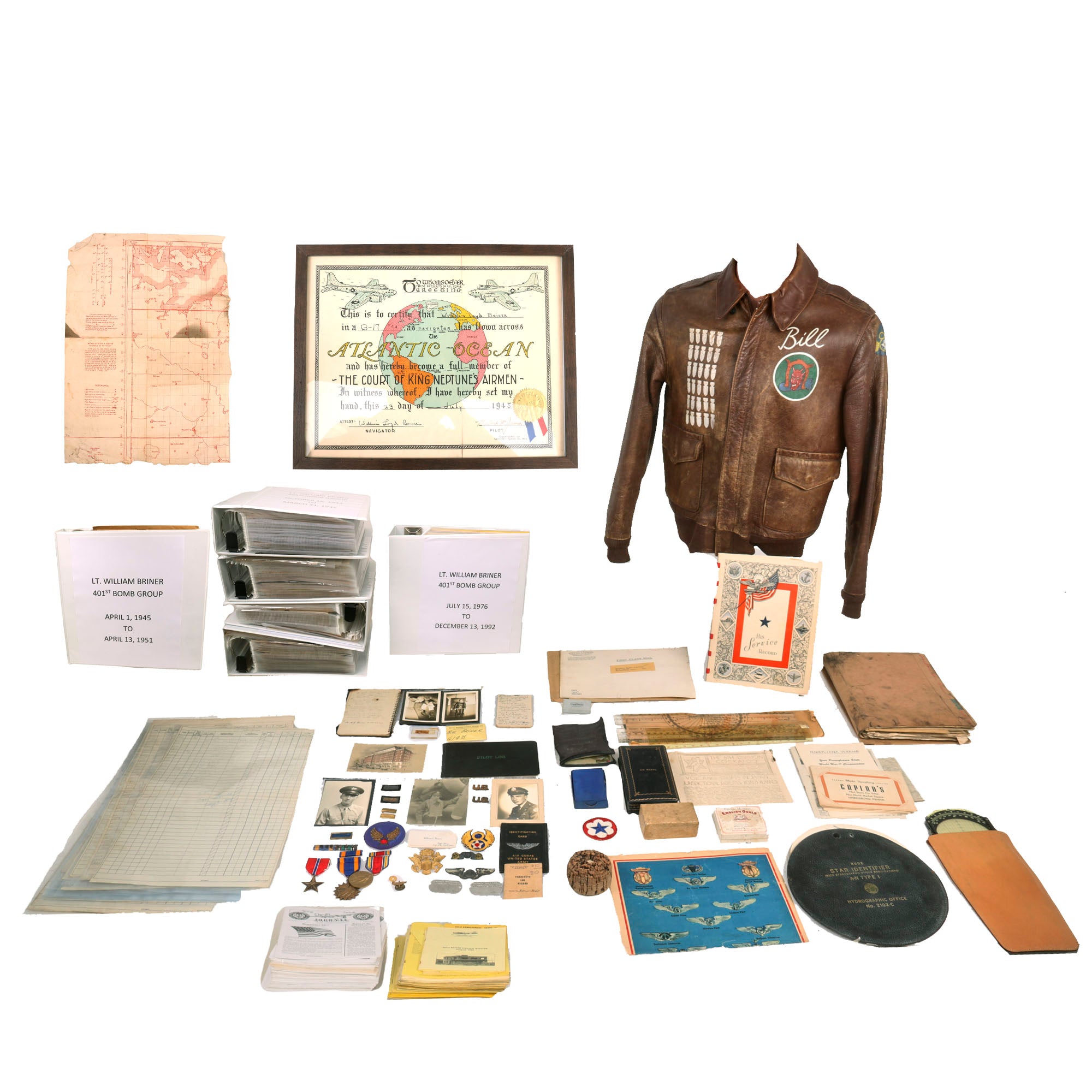 Original Grouping. One-of-a-Kind. This is a phenomenal & extensive A2 Flight Jacket grouping of Navigator Lieutenant William "Bill" Lloyd Briner who was a member of the crew on the Boeing B-17 Flying Fortress "Gamblers’ Choice (Serial # 43-38330) , 614th Bomb Squadron, 401st Bombardment Group, 8th Air Force. Briner flew 35 documented missions between October 23rd, 1944 and the end of the War in Europe in May, 1945. He received numerous awards including the Air medal on 12/18/1944 and three Oak Clusters before the end of the war.