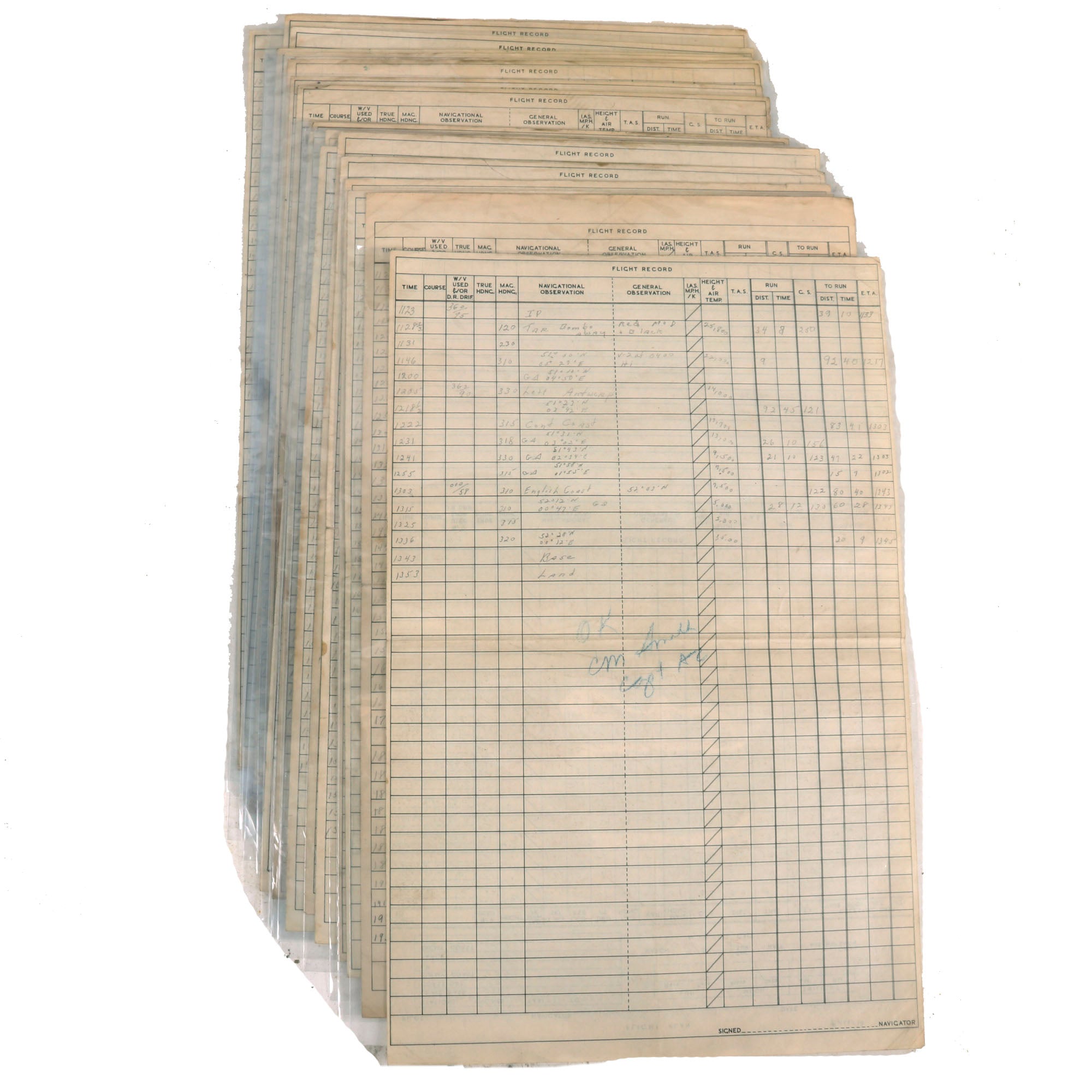 - 22 Original Flight Plans used by Briner each measuring 11¼ x 17½” and stored in plastic sleeves, dating from November 1944 to February 1945, with the names of the locations bombed noted at the top. These are all filled out and are unbelievable pieces of ephemera in their own right. Along with this is a fragment of map around the same size which was used to write a long letter on the back to his parents.