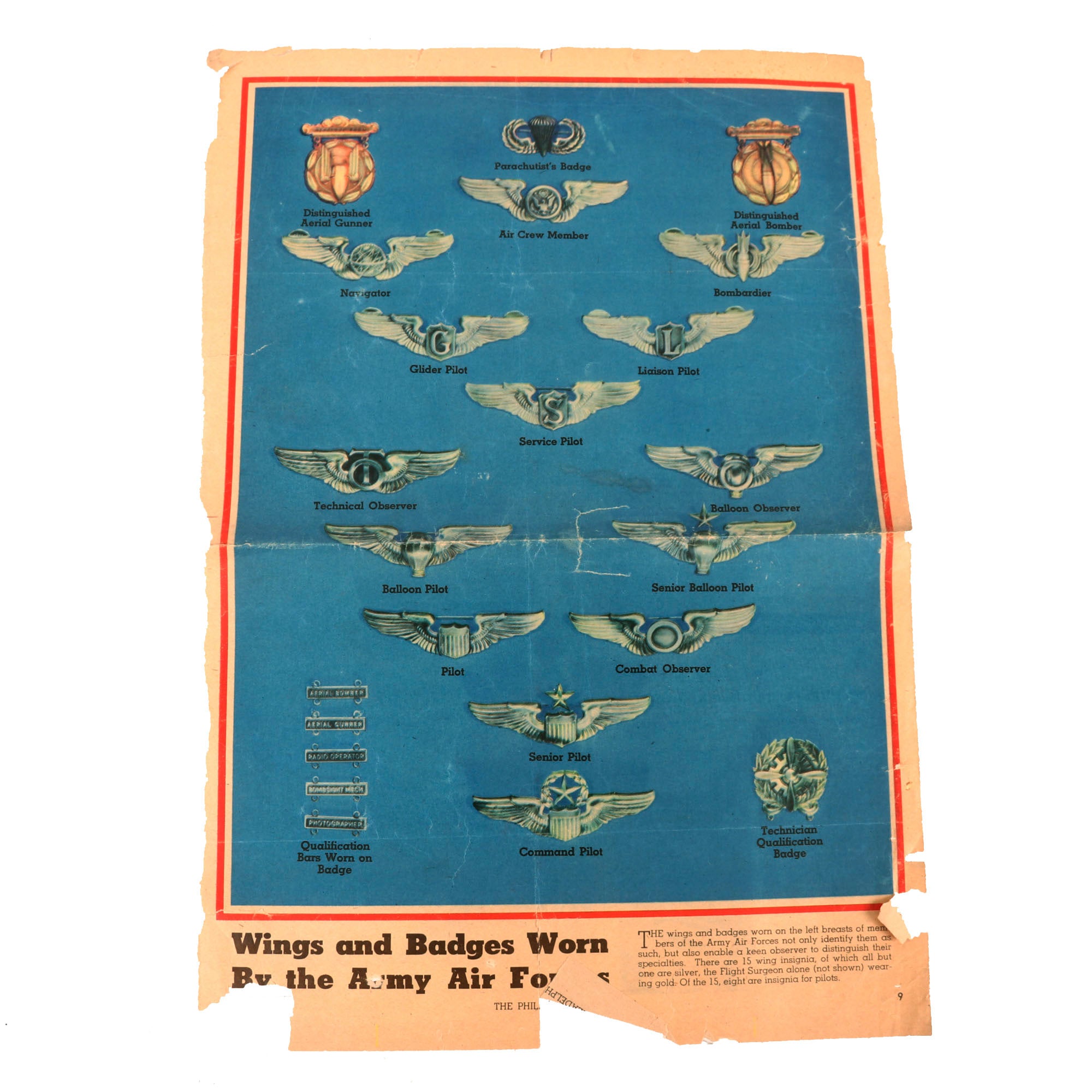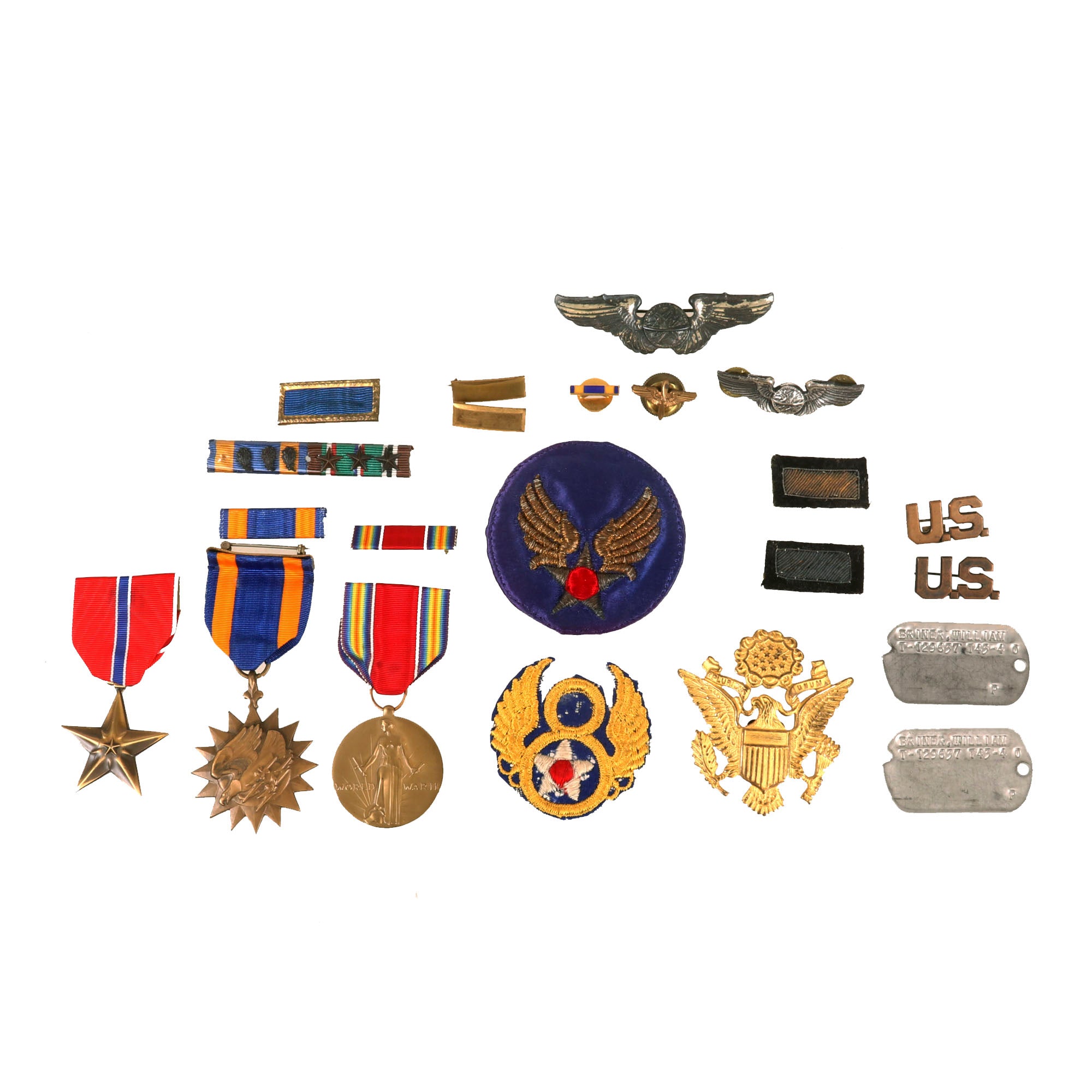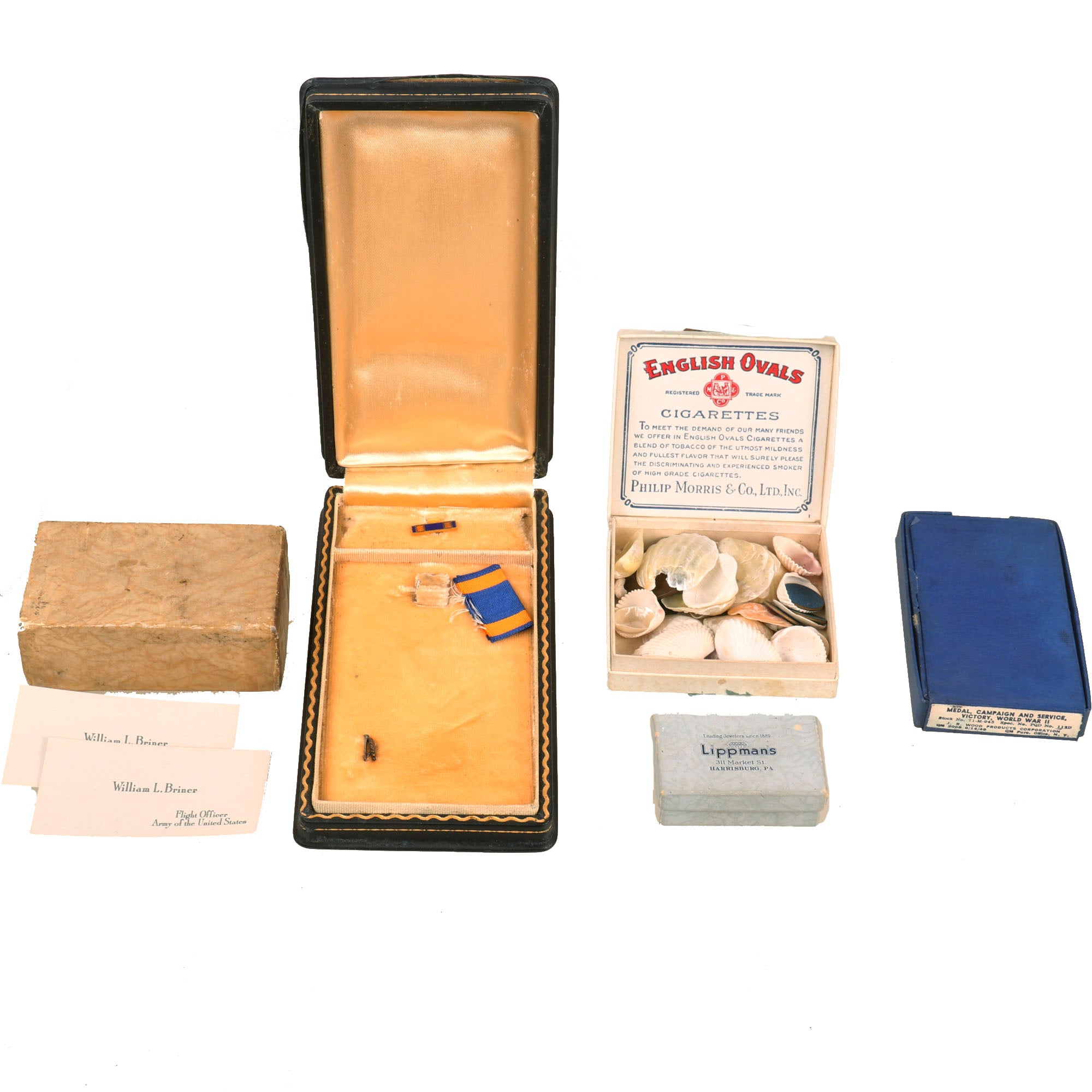 - A Riker case which displays 3 photographs of Briner in uniform, his Lieutenant’s bars & US Insignia, a theater-made AAF patch, a cut-out 8th Air Force patch, his Presidential Unit Citation ribbon, his 2-spot ribbon bar with an Air Medal with 3 Oak Leaf Clusters and his European African Middle Eastern Campaign medal with 3 campaign stars, his Bronze Star Medal (unengraved), his Air Medal (unengraved), his US WWII Victory Medal, his Navigator Wings and a smaller pin of them, his two dog tags, a parachute log record filled out, and one of his “Calling Cards”.