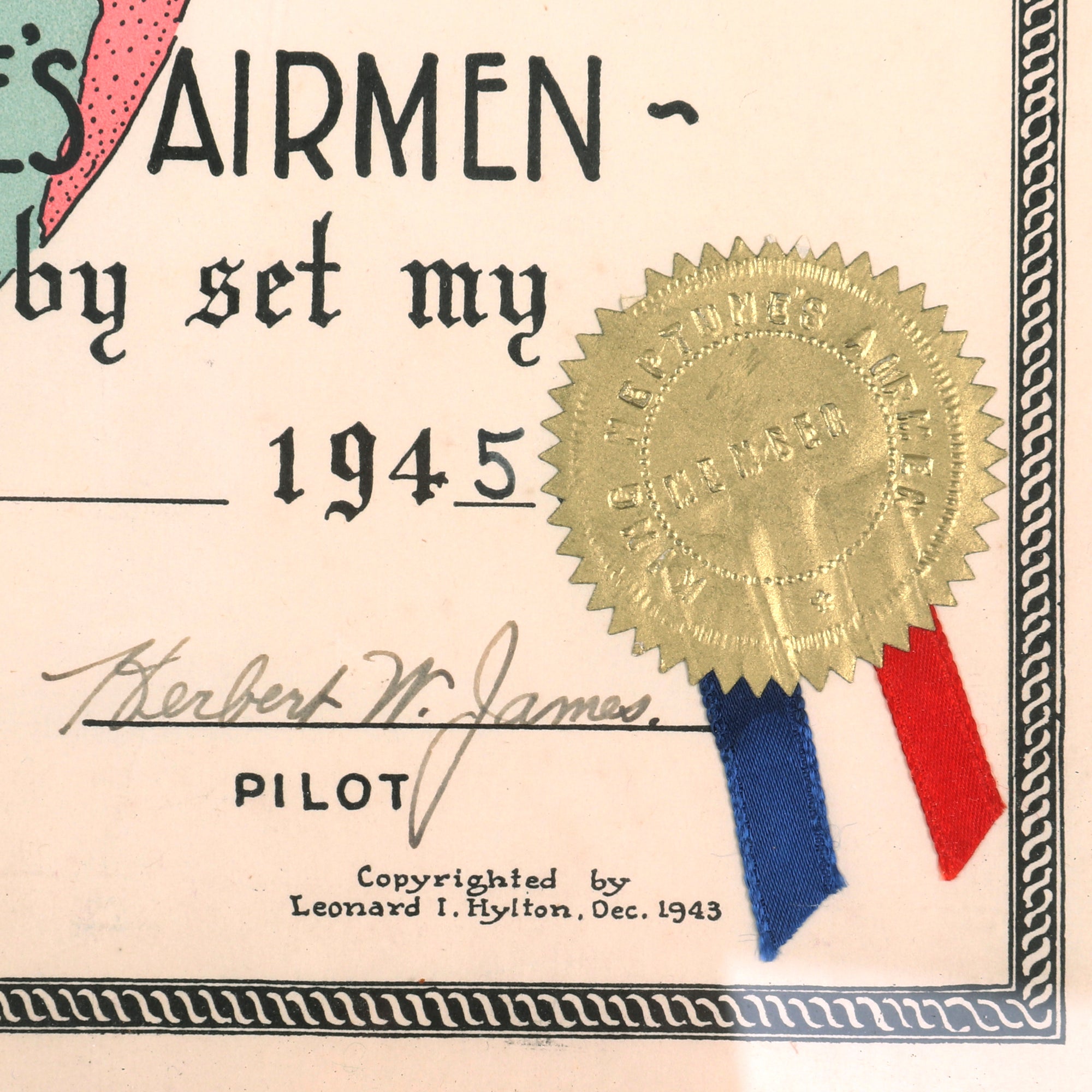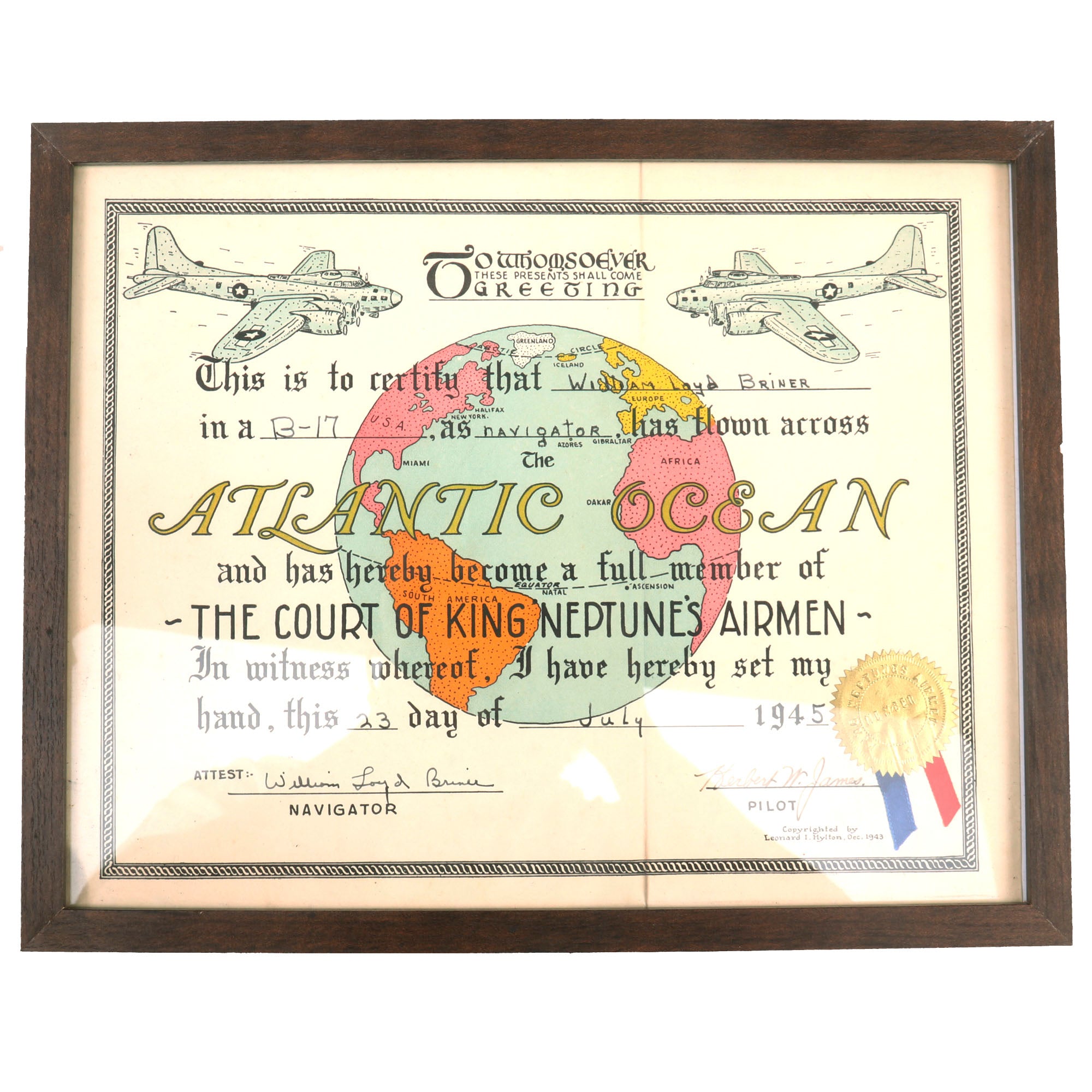 - Framed “The Court of King Neptune’s Airmen” Certificate measuring 11⅞ x 14⅞”. This certificate was awarded after Briner flew across the Atlantic for the first time with his crew, a great piece of AAF culture signed on July 23rd, 1945.