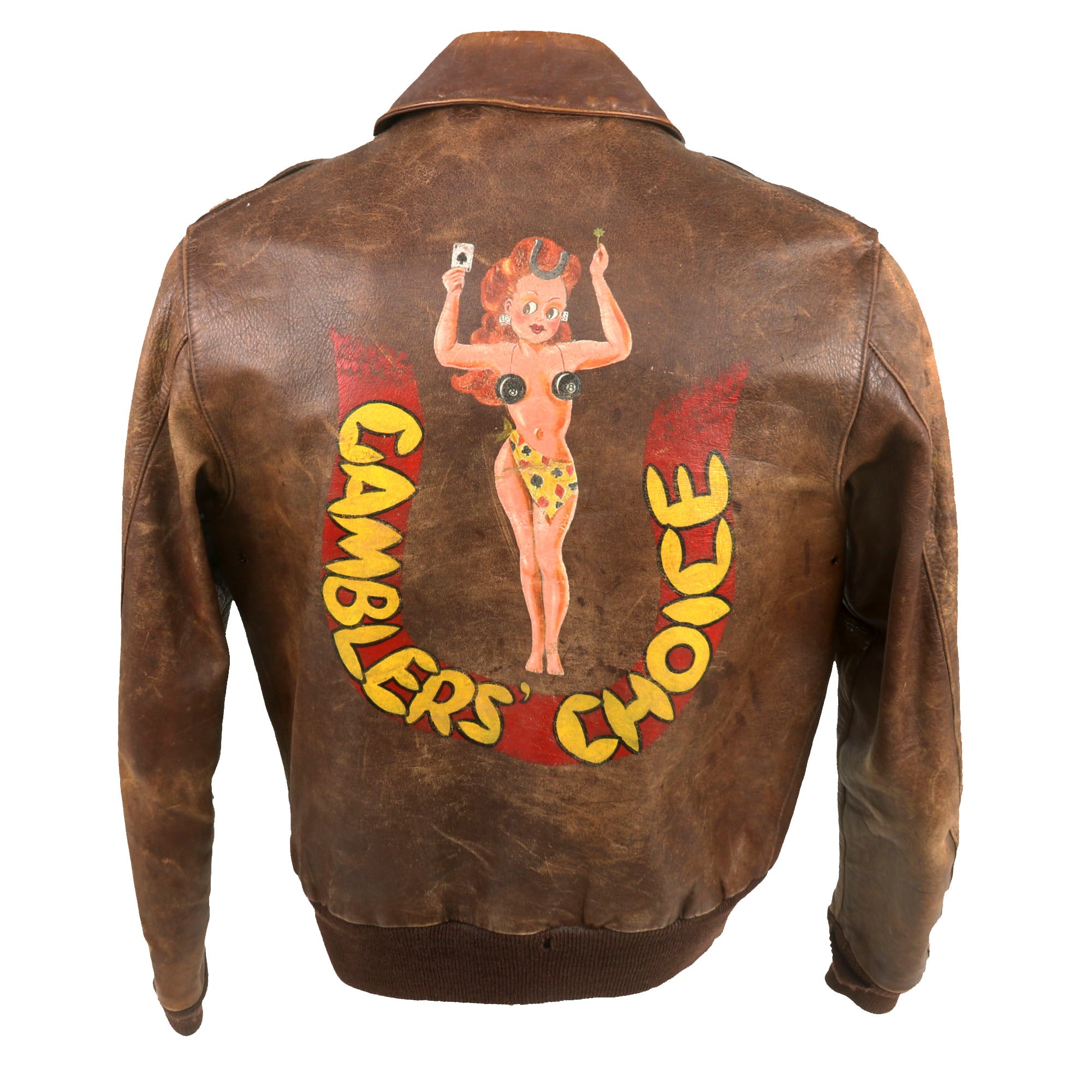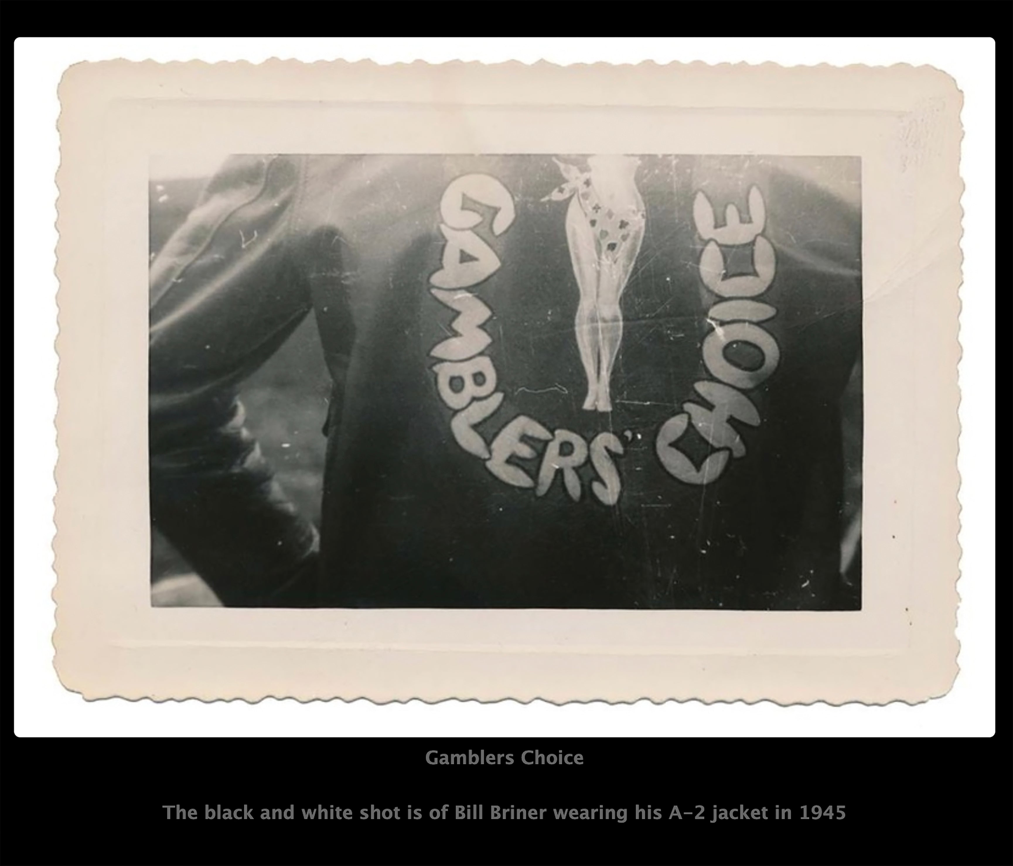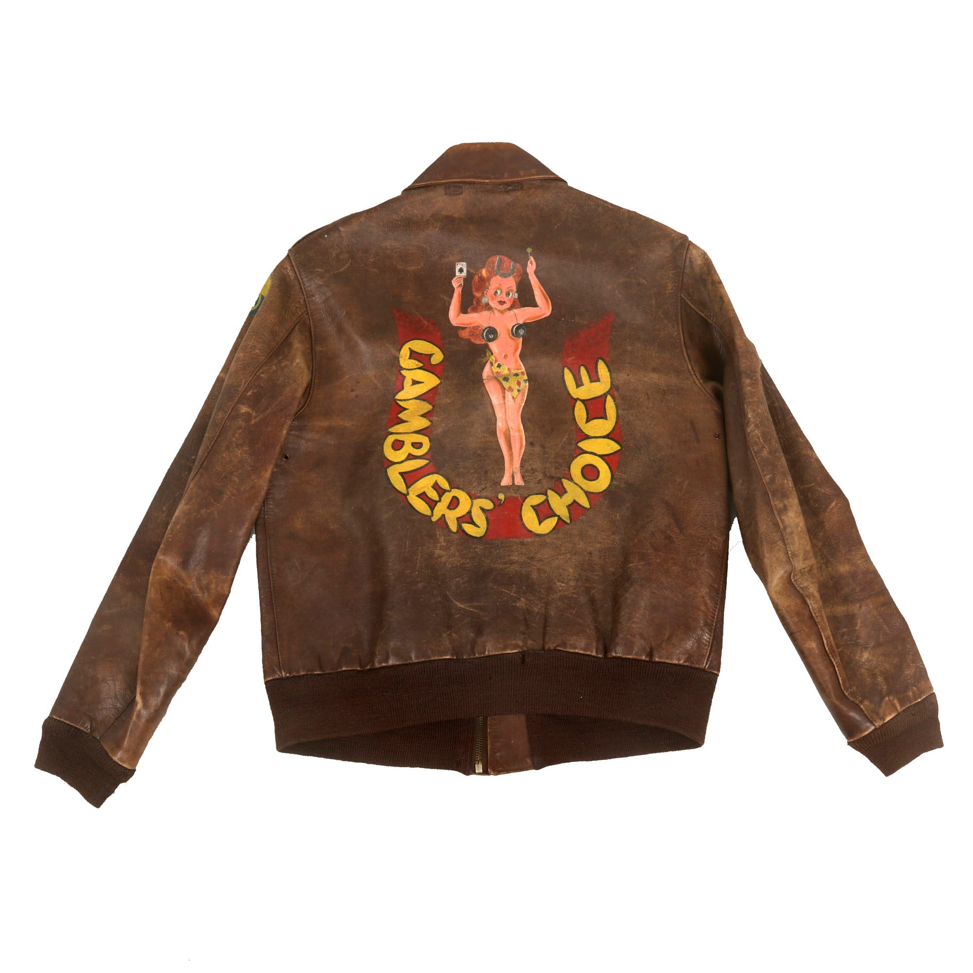 The highlight of this group is of course the extraordinary A2 jacket, which is in amazing shape with the paint so miraculously intact. Briner’s name, Bill, is painted on the front left of the jacket above his painted squadron patch, which is very well retained. The patch for the 614th Bomb Squadron depicted the devil’s head between a winged horseshoe with a bomb under his head, on a green background with a white border. On the right side of the front are 30 painted bombs indicating the 30 bombardment missions Briner flew on. The left shoulder has the painted insignia of the 8th Air Force, and the shoulder boards each bear leather 2nd Lieutenant bars. On the back of the jacket is the painted nose art of Briner’s B-17, “Gamblers’ Choice”, depicting a red-headed woman wearing a horseshoe on her head, a bra of 8 Balls, a pair of dice earrings, a loincloth bearing hearts, spades, diamonds, and clubs, and golding an Ace of Spades card and a 4-leaf clover. Around her on a red horseshoe-shaped banner is painted in yellow, GAMBLERS’ CHOICE. The tag on the interior of the jacket reads: