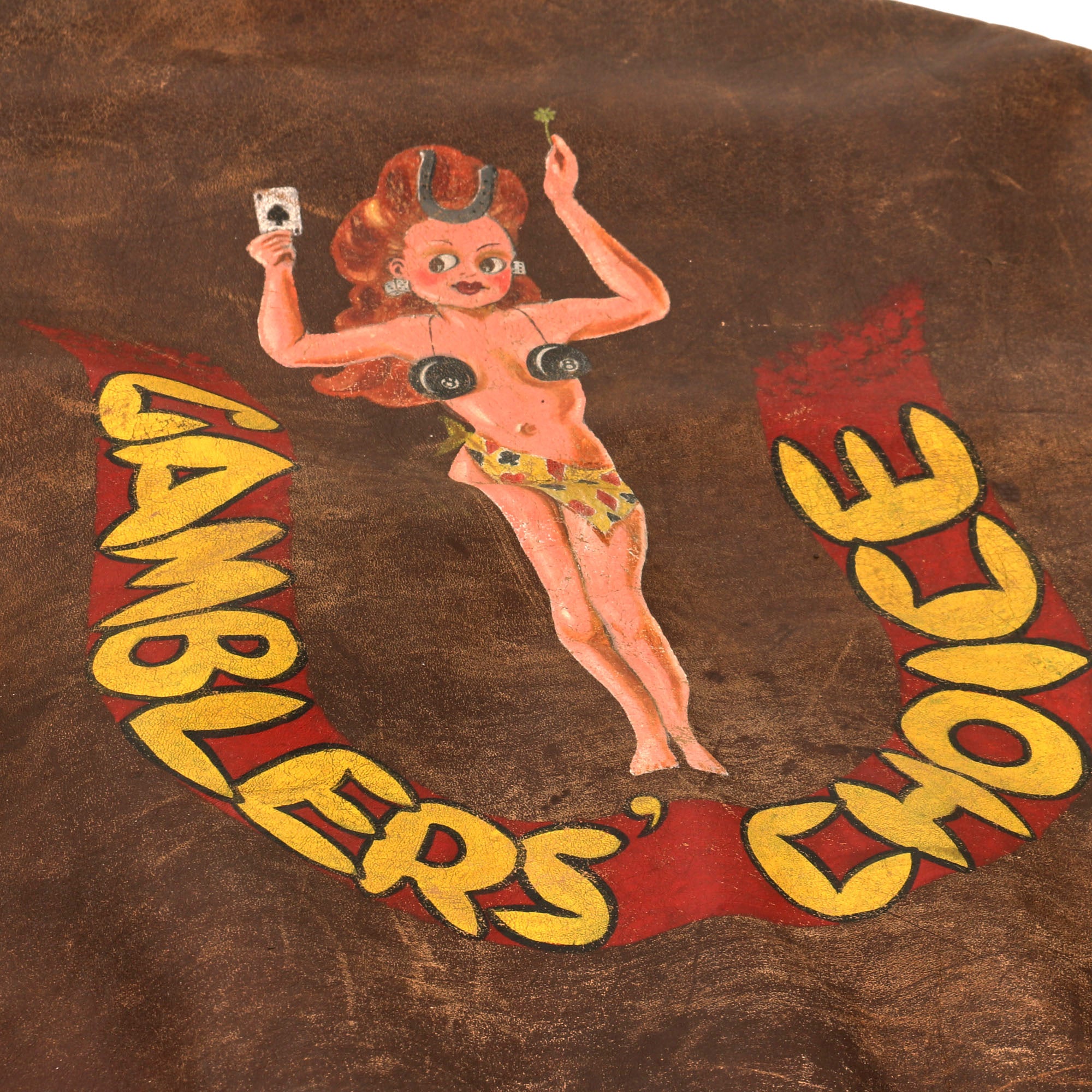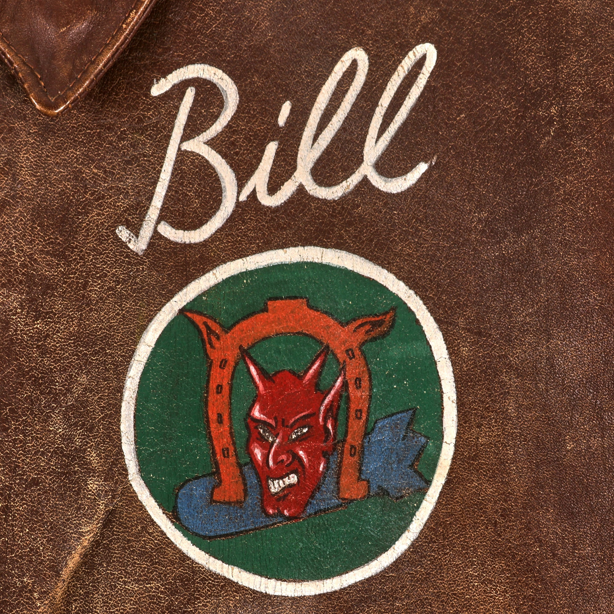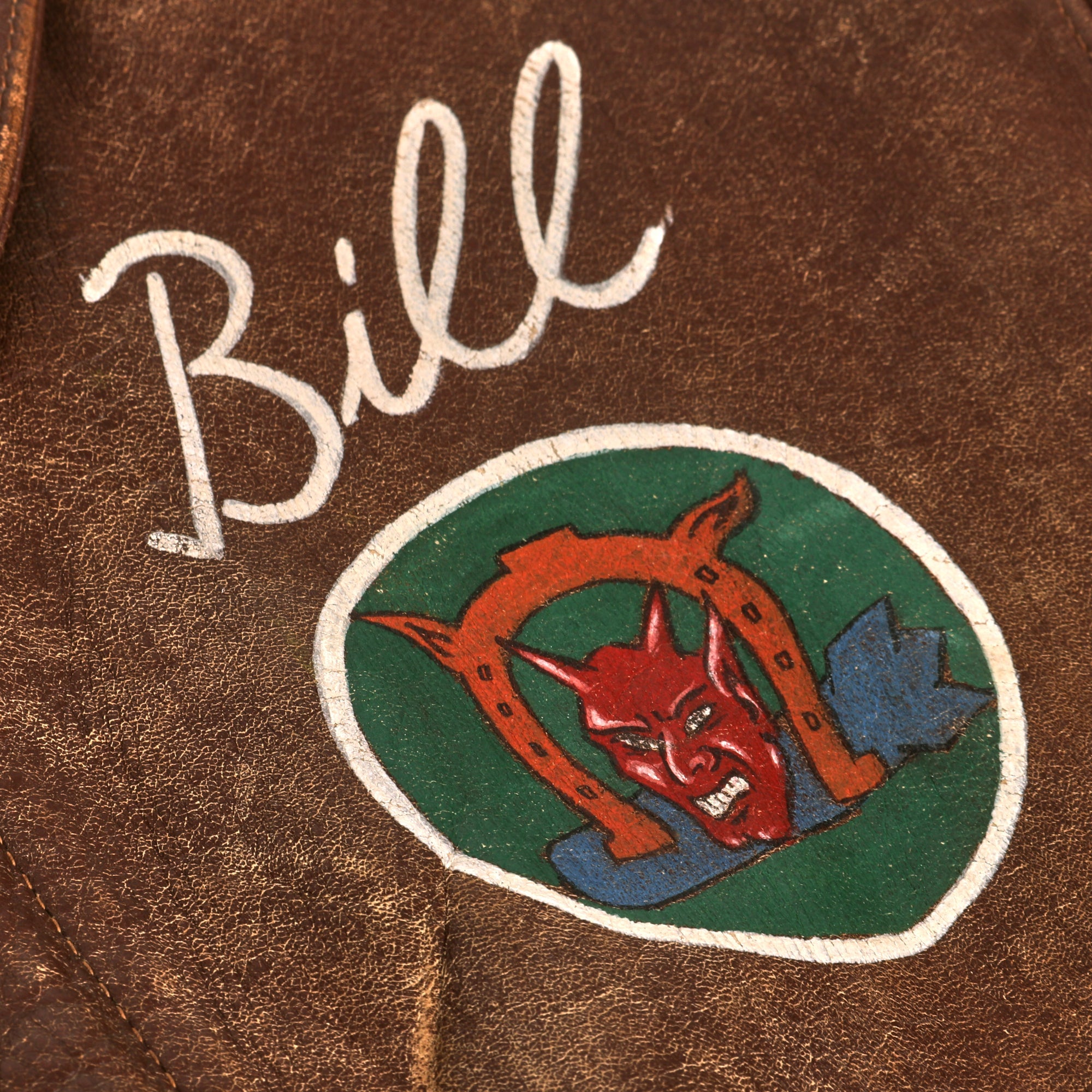 The highlight of this group is of course the extraordinary A2 jacket, which is in amazing shape with the paint so miraculously intact. Briner’s name, Bill, is painted on the front left of the jacket above his painted squadron patch, which is very well retained. The patch for the 614th Bomb Squadron depicted the devil’s head between a winged horseshoe with a bomb under his head, on a green background with a white border. On the right side of the front are 30 painted bombs indicating the 30 bombardment missions Briner flew on. The left shoulder has the painted insignia of the 8th Air Force, and the shoulder boards each bear leather 2nd Lieutenant bars. On the back of the jacket is the painted nose art of Briner’s B-17, “Gamblers’ Choice”, depicting a red-headed woman wearing a horseshoe on her head, a bra of 8 Balls, a pair of dice earrings, a loincloth bearing hearts, spades, diamonds, and clubs, and golding an Ace of Spades card and a 4-leaf clover. Around her on a red horseshoe-shaped banner is painted in yellow, GAMBLERS’ CHOICE. The tag on the interior of the jacket reads: