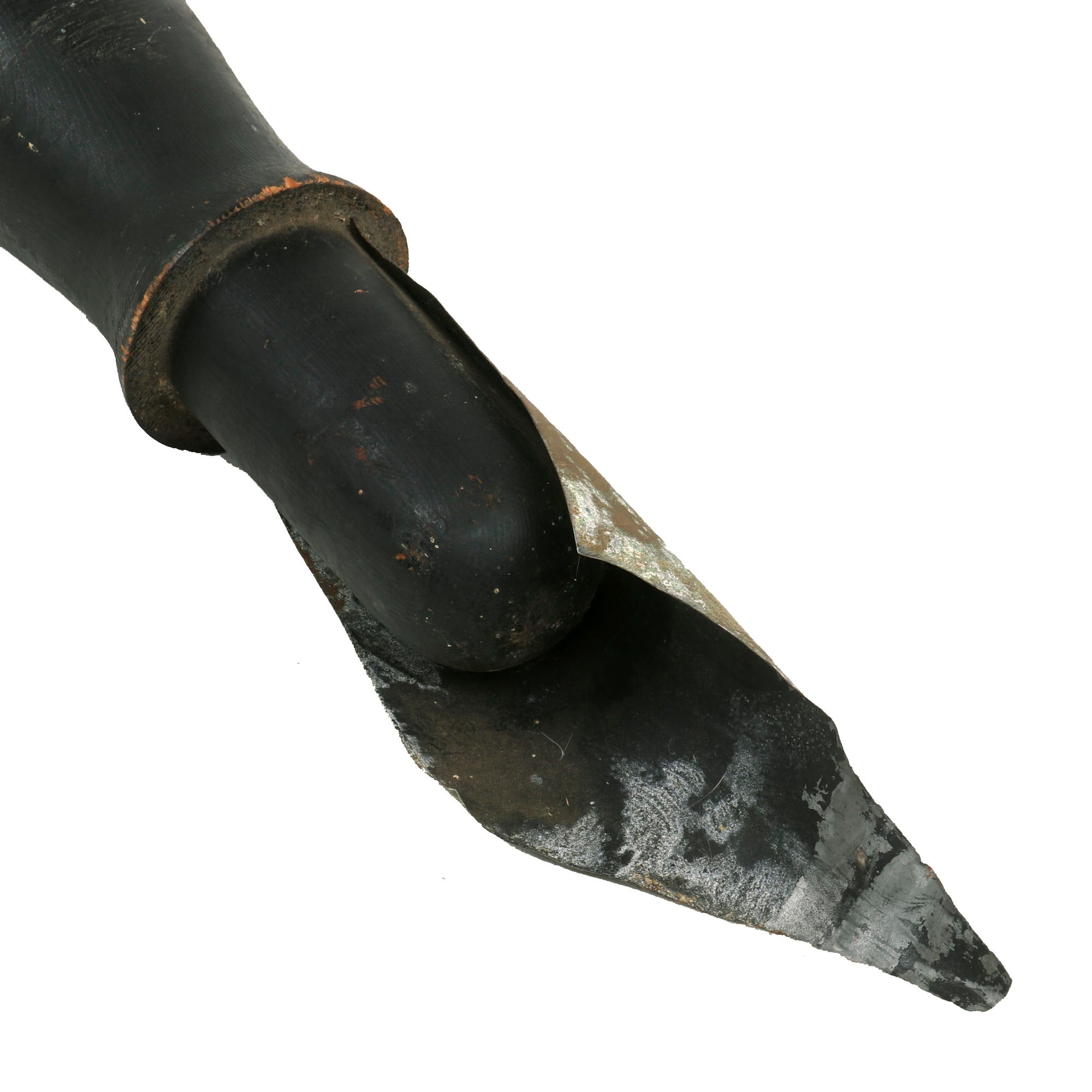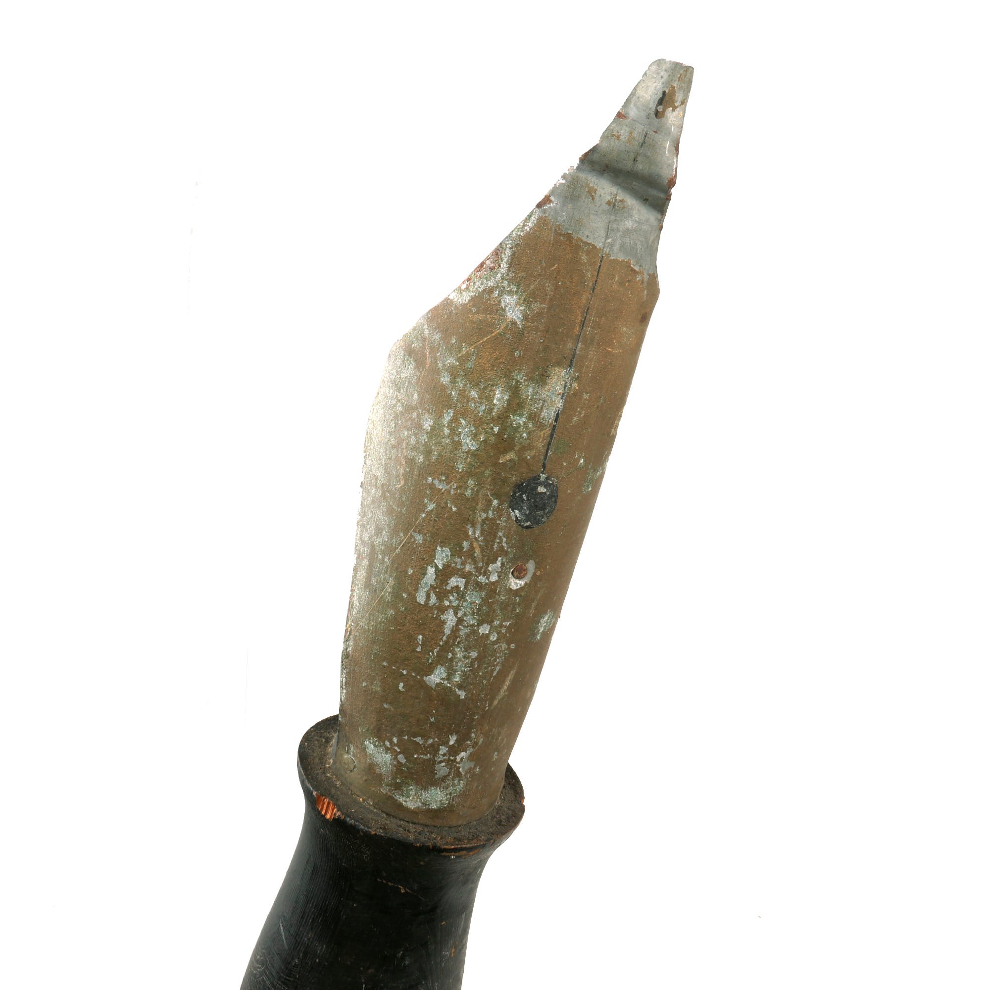 The pen appears to be modeled after a Parker 1928 Duofold, the exact model of pen used by MacArthur to sign the surrender documents on September 2nd, 1945. It measures roughly 65” in total, the entire body and cap being constructed of wood with the nib being constructed of steel. It is painted silver with a gold band near the end of the cap, and black near and around the nib. The nib itself was painted to mimic the indents it would have. The nib has unfortunately suffered some dents and is no longer straight, having been hit several times on its tip, bending the metal and stripping some of the paint. This however is the only serious flaw the piece has. There are a great deal of scuffs and marks creating a patina for the pen, which do not delineate from the focus. Its thickest region has a diameter of roughly 5”. There is also a small piece of wood on the cap clasp that is cracked and very loose, but still attached. Please exercise caution when handling!