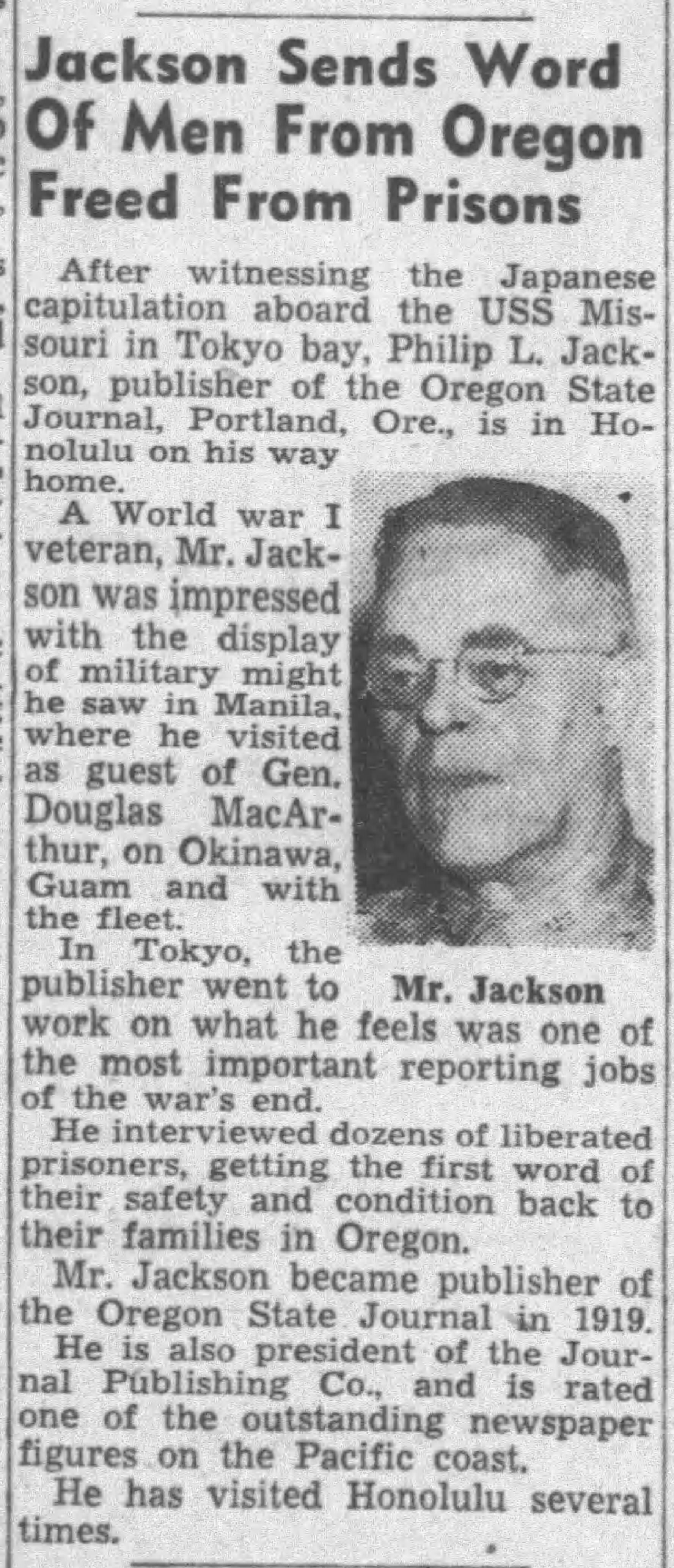 Following this, Jackson began on what he felt was one of the most important reporting jobs of the war’s end, he interviewed dozens of liberated prisoners, getting first word of their safety and condition back to their families in Oregon. After returning to the United States, Jackson returned to the Oregon State Journal, where he served as publisher until his death from a heart attack on February 14th, 1953 at the age of 59.
