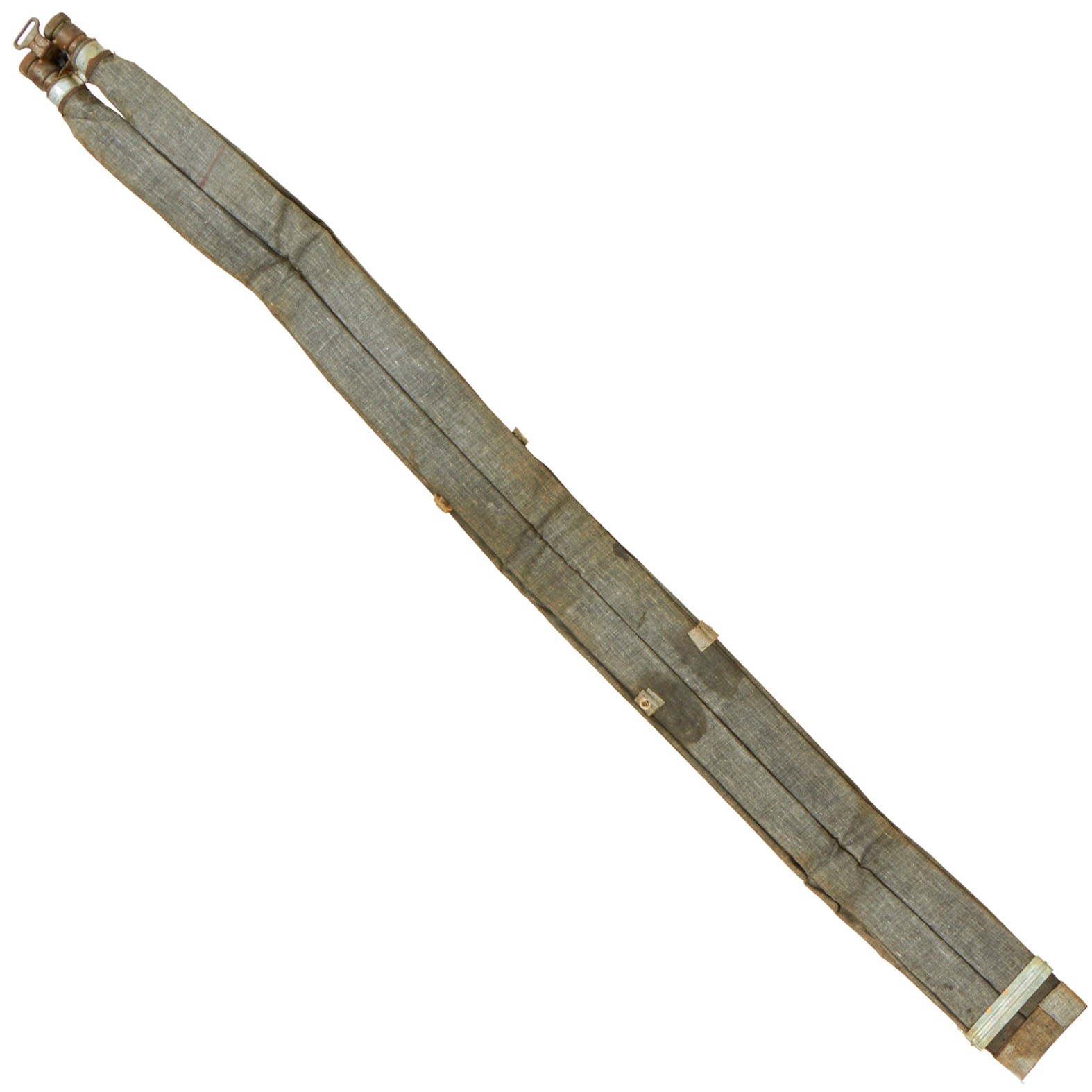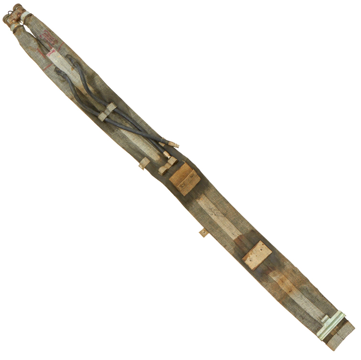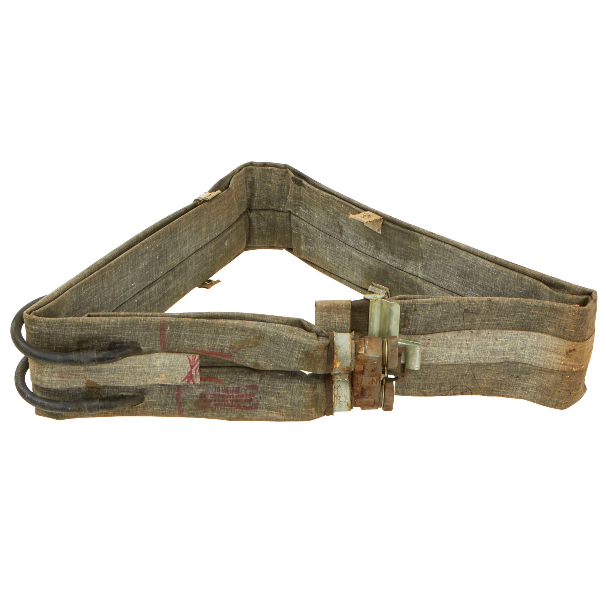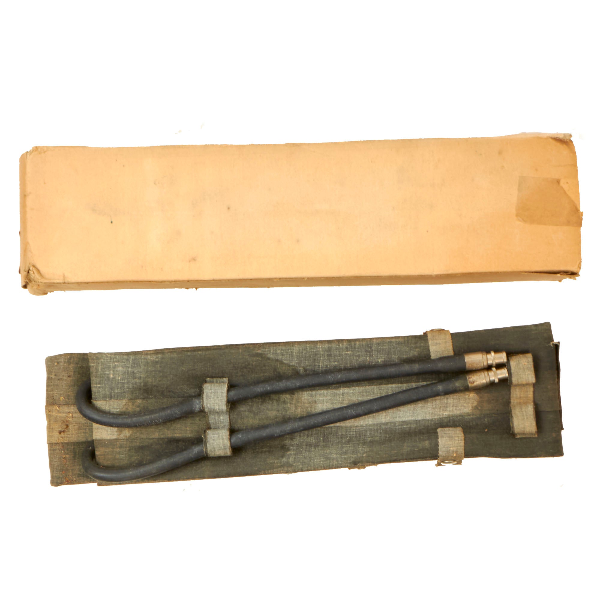 Original Item: Only One Available. The M1926 inflatable flotation belt was used as a life preserver by assault troops during amphibious actions and beach landings. The belt was inflated by squeezing two switches located inside the belt, which activated two CO2 bottles. If the CO2 bottles failed, the belt could still be inflated by blowing into the rubber tubes, which have valves on the ends. This example comes in its original box, which measures 18 x 5 x 2½”.