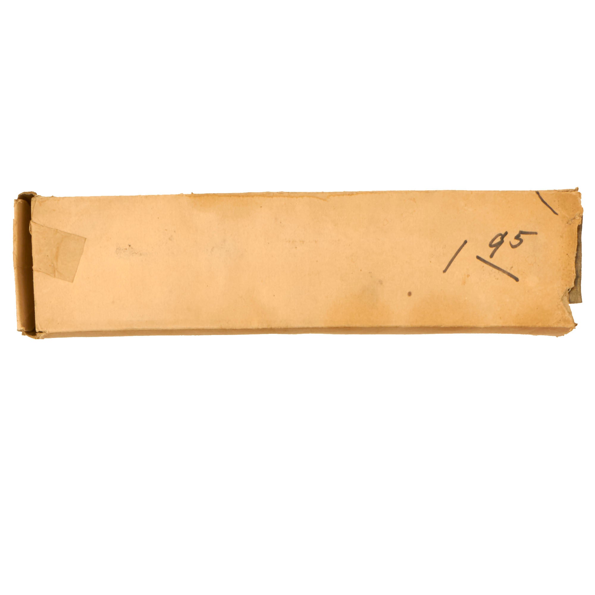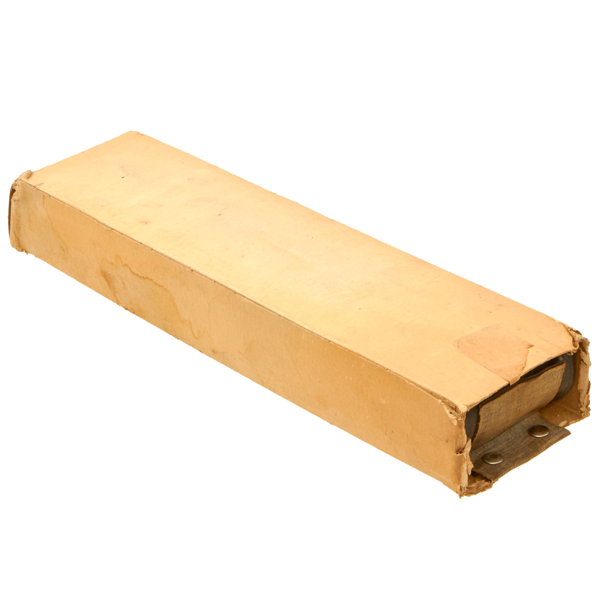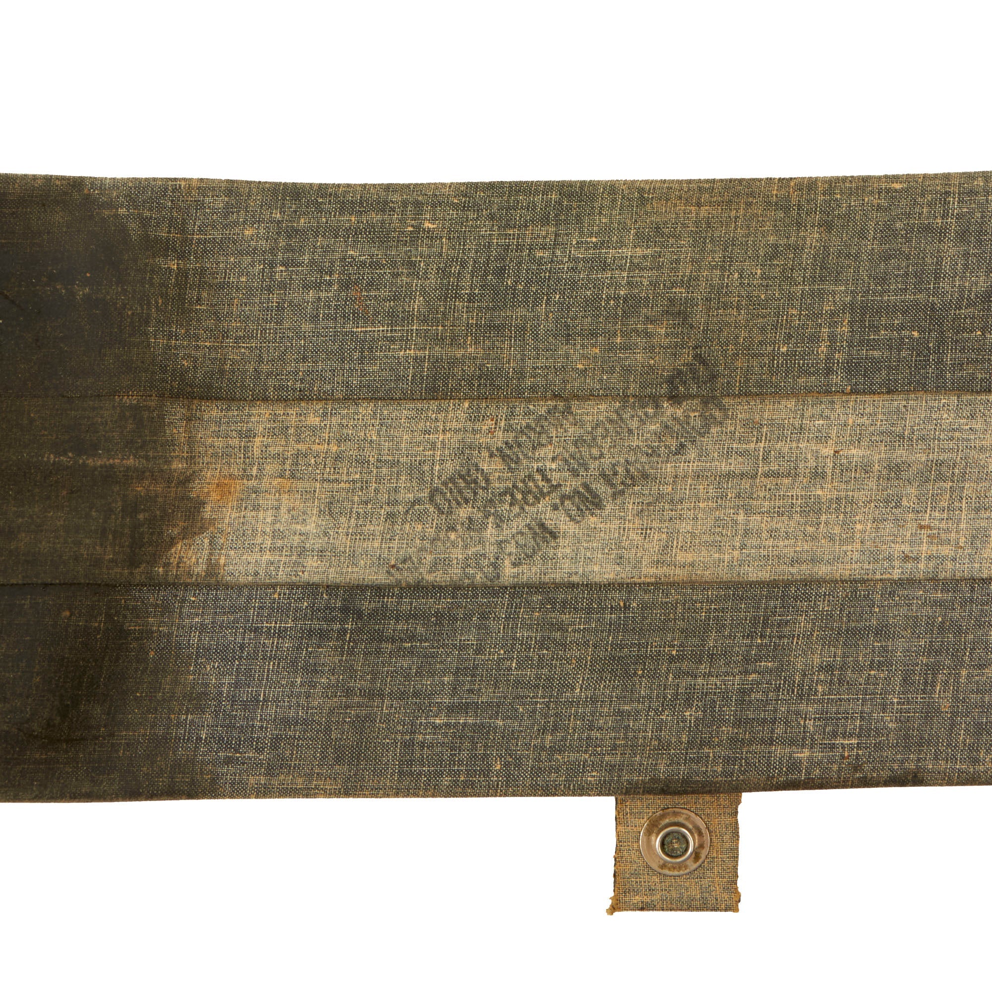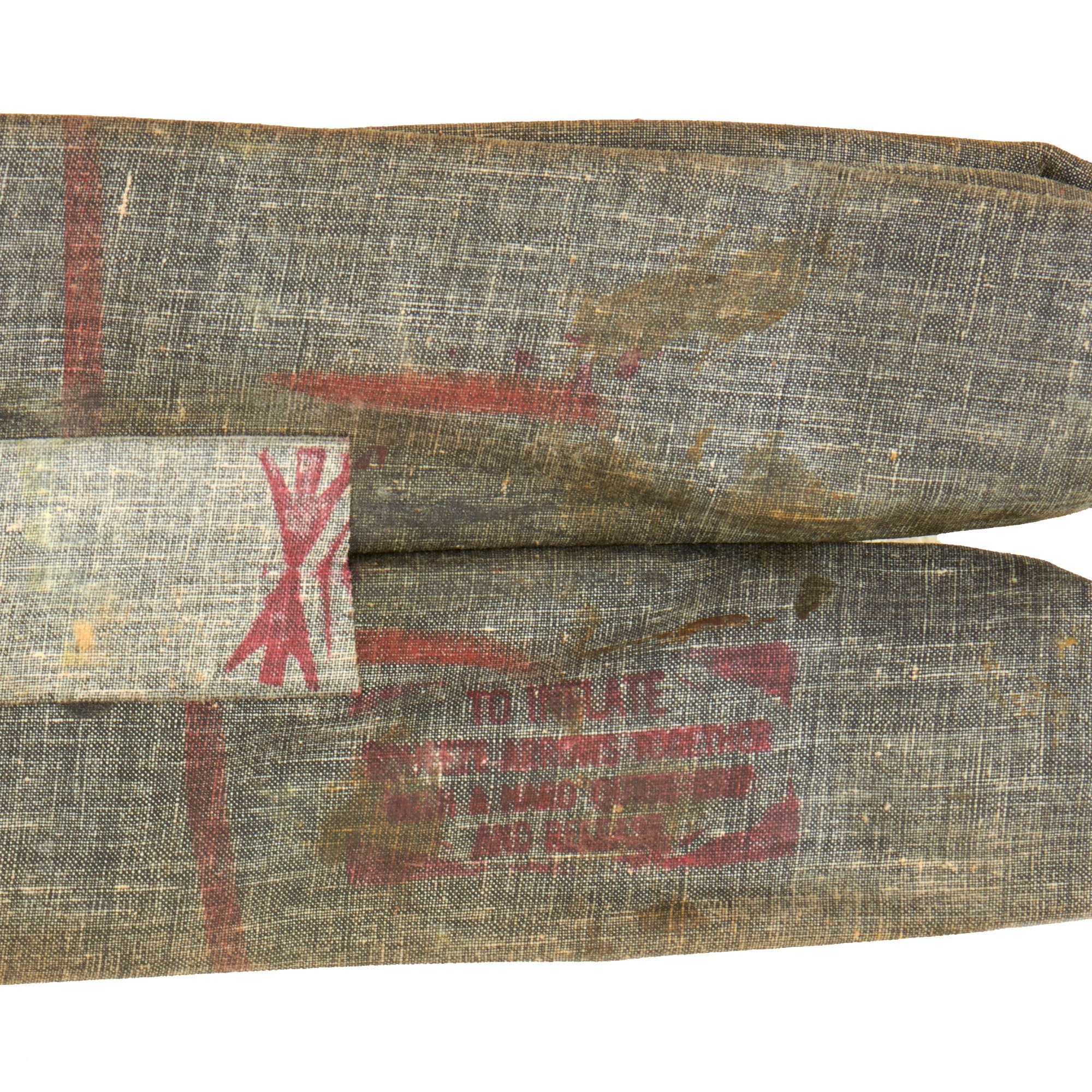 The belt measures approximately 55" long and 4.5" wide uninflated. Offered in good condition, this is a solid used example of a hard to find Life Preserver in its original box, one made before the D-Day invasion that made them so famous.