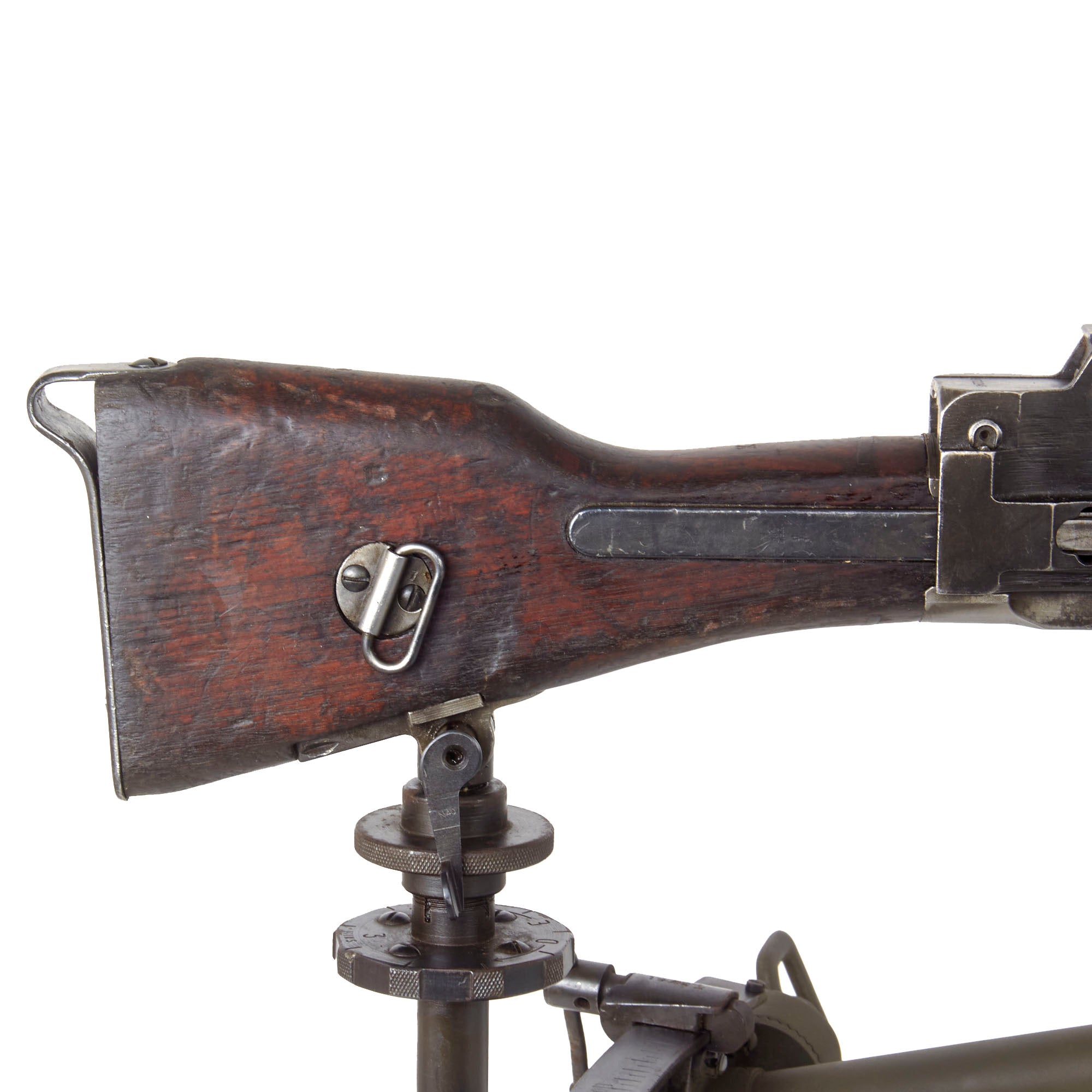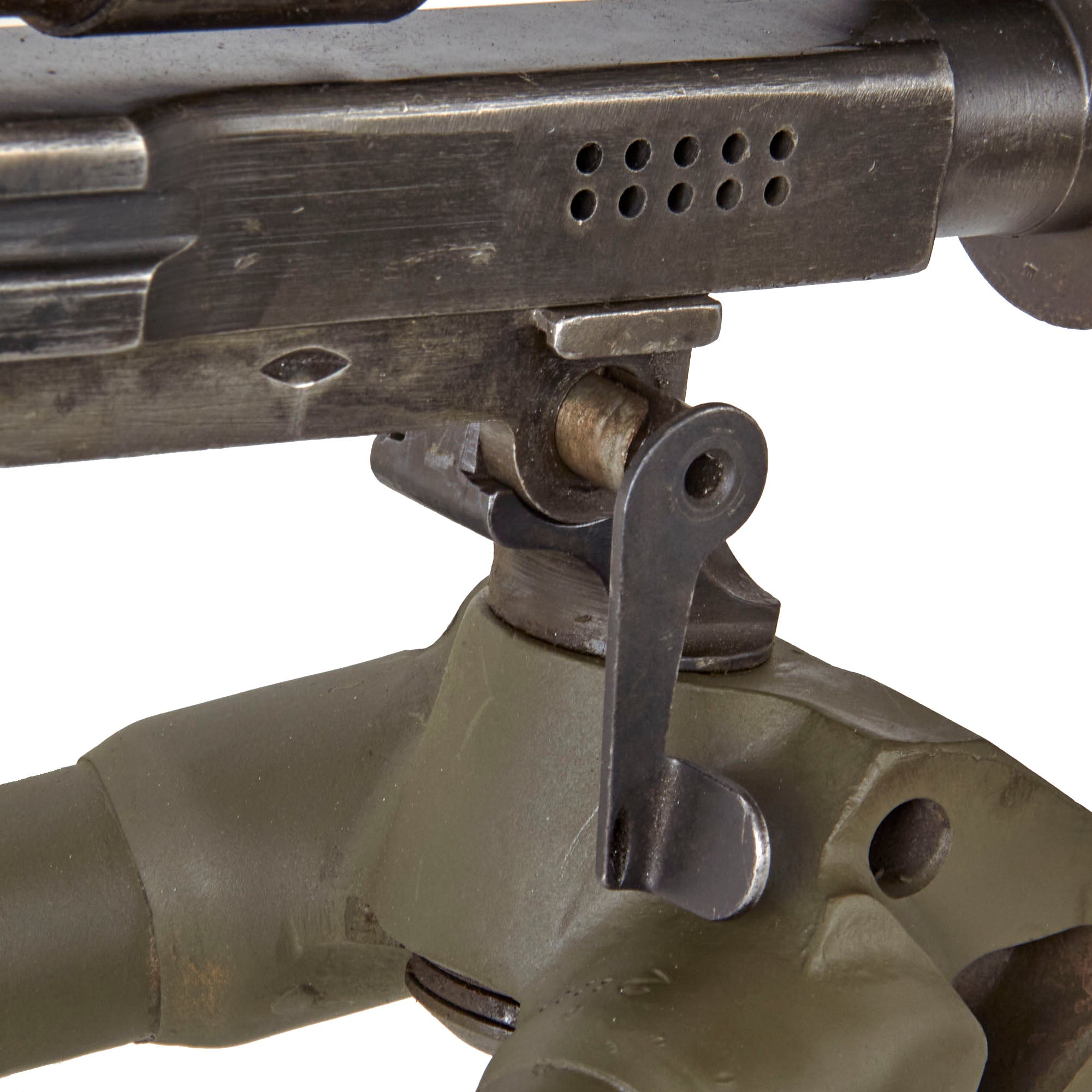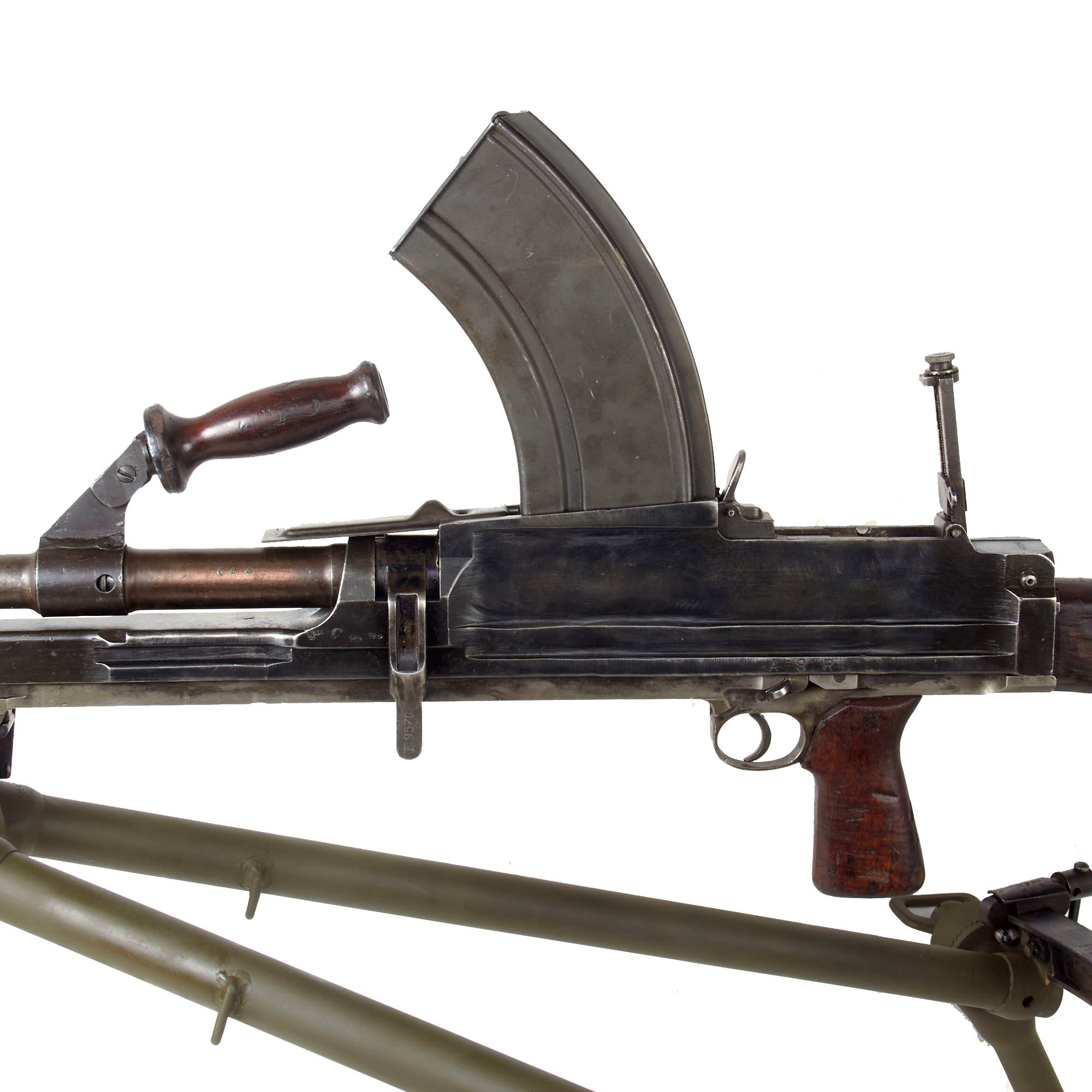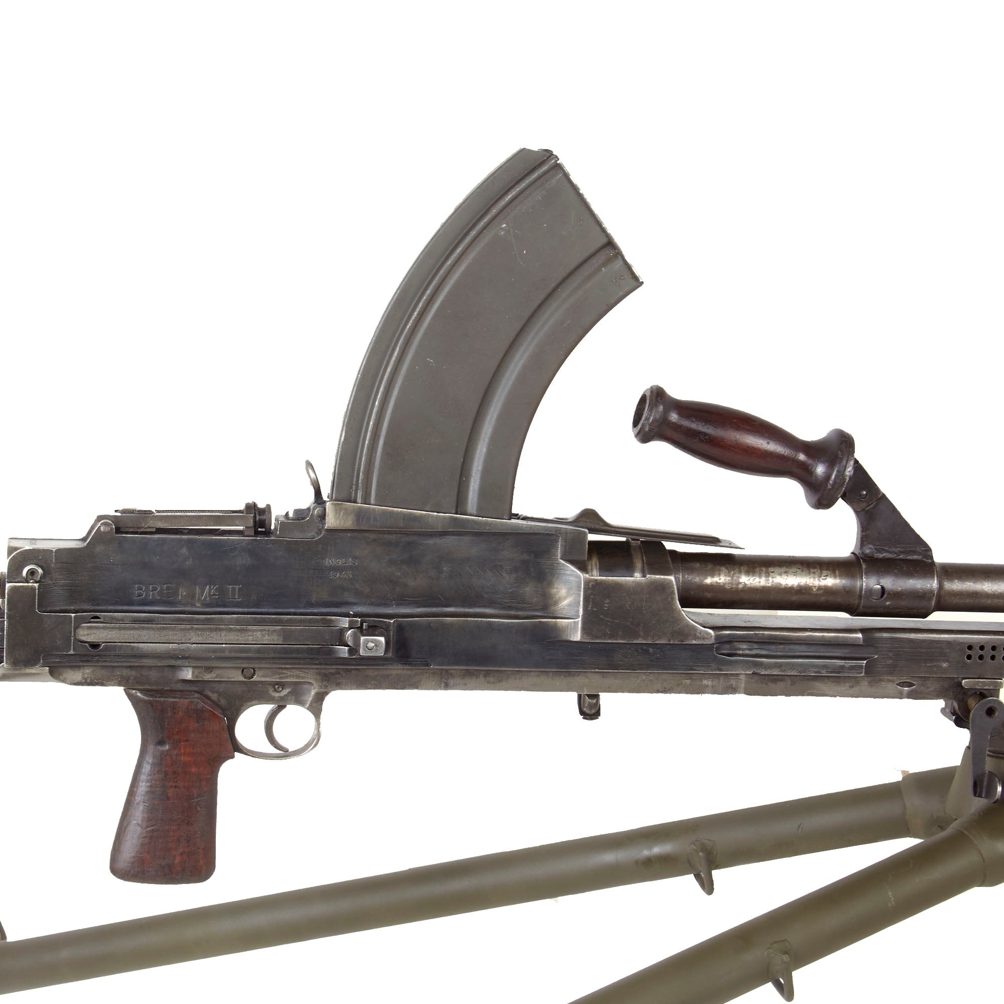Original Item: Only One Available. This is a great deactivated display example of the iconic Bren MkII Light Machine gun, as used by British forces during WWII, complete with an original wartime issue Bren Tripod mount. It was built from all original parts on an original BATF compliant non-firing display receiver, making it a 100% legal Display Machine gun. This receiver was created by using portions of the original torch cut receiver, including the barrel bushing, combined with some new made steel portions. It has properly had a 25% section of the total length completely replaced entirely with solid steel bar stock. Meaning a 1/4 length section of the display receiver is solid steel, making this totally legal to own without a license of any kind. Every part on this display gun is original WWII manufacture other than 25% of the receiver replaced by solid steel (as required by BATF). Additionally many of the deactivated internal components were welded in place inside the receiver to increase the display potential.