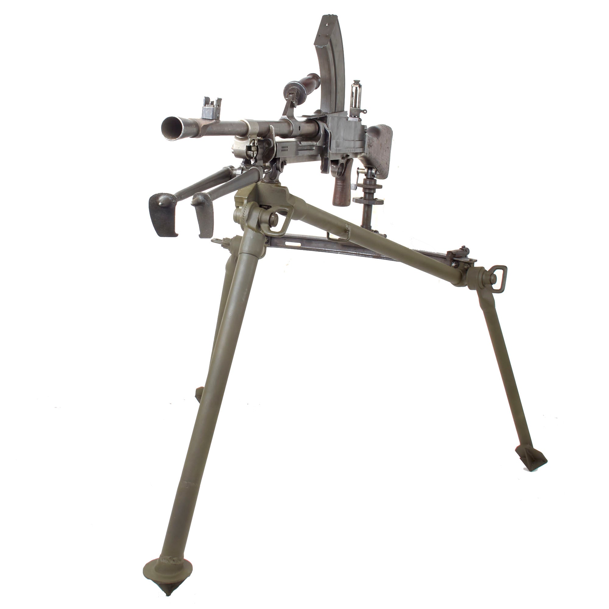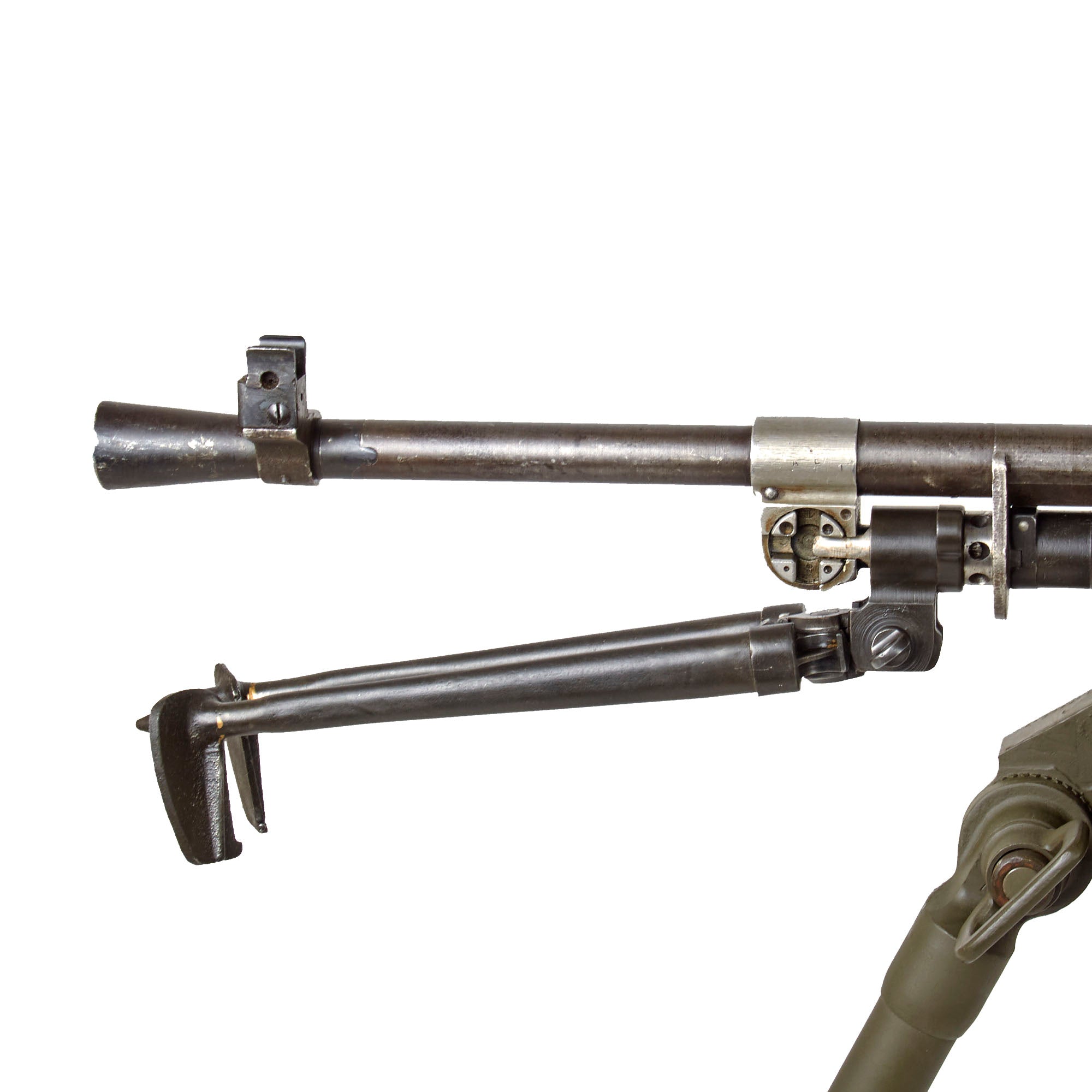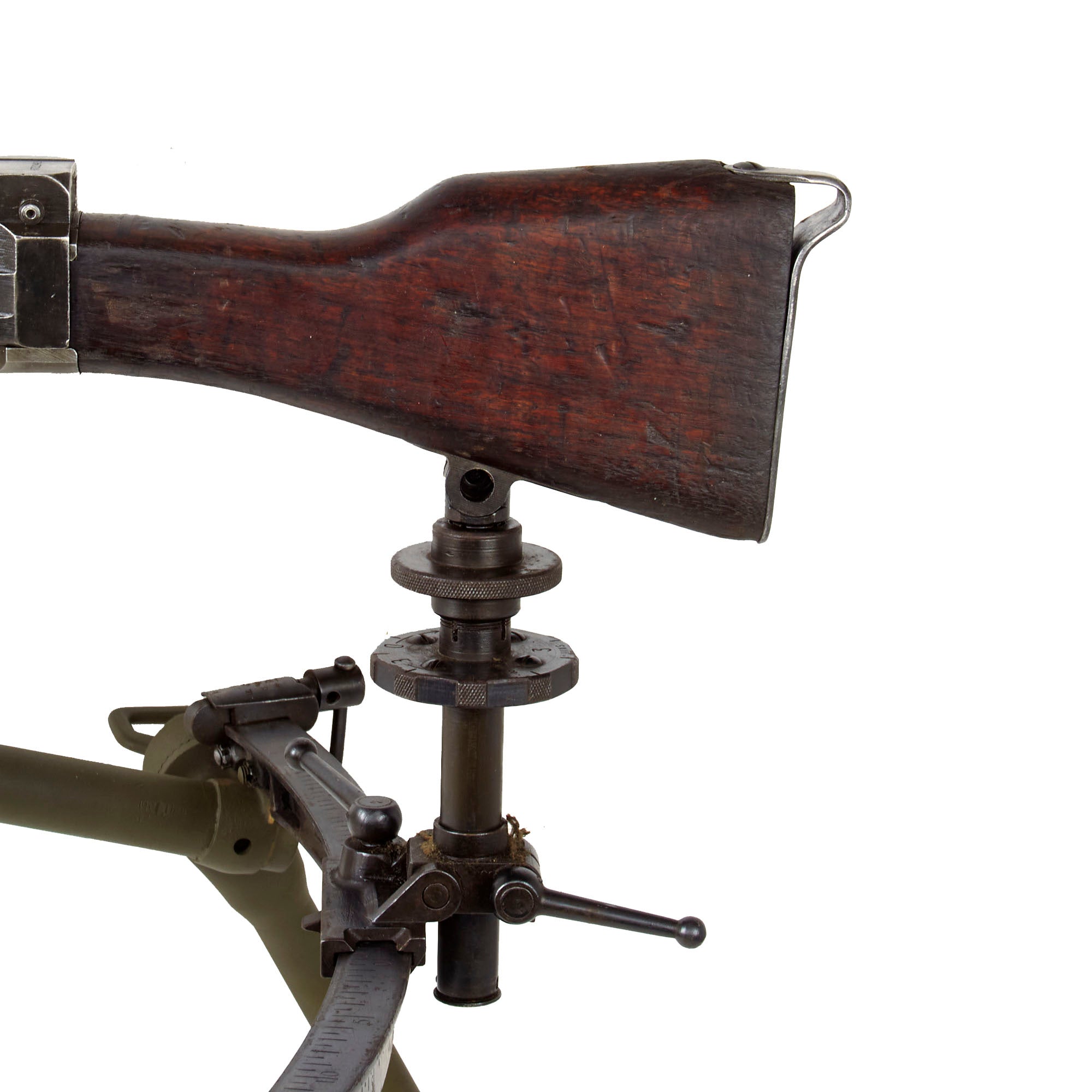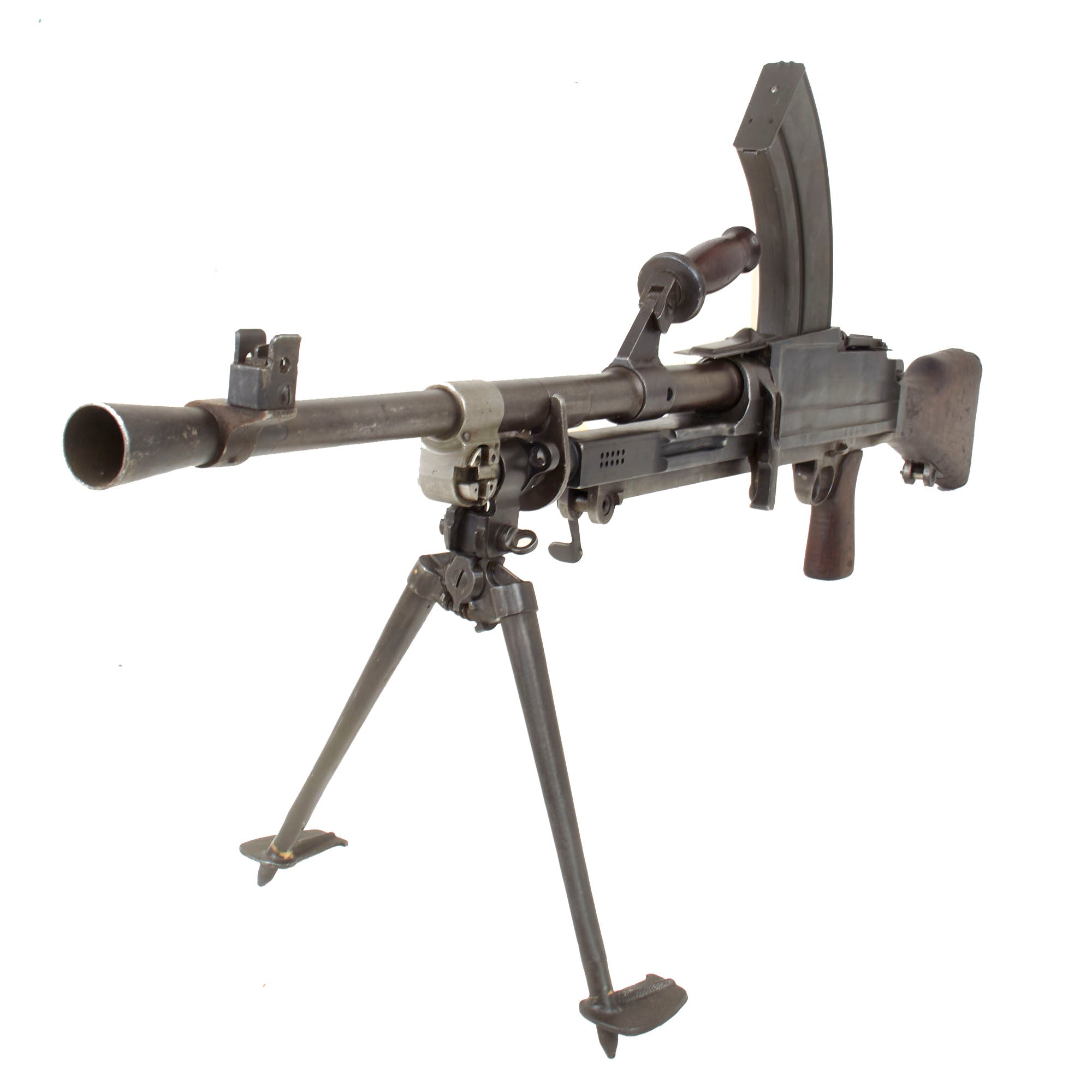 Original Item: Only One Available. This is a great deactivated display example of the iconic Bren MkII Light Machine gun, as used by British forces during WWII, complete with an original wartime issue Bren Tripod mount. It was built from all original parts on an original BATF compliant non-firing display receiver, making it a 100% legal Display Machine gun. This receiver was created by using portions of the original torch cut receiver, including the barrel bushing, combined with some new made steel portions. It has properly had a 25% section of the total length completely replaced entirely with solid steel bar stock. Meaning a 1/4 length section of the display receiver is solid steel, making this totally legal to own without a license of any kind. Every part on this display gun is original WWII manufacture other than 25% of the receiver replaced by solid steel (as required by BATF). Additionally many of the deactivated internal components were welded in place inside the receiver to increase the display potential.