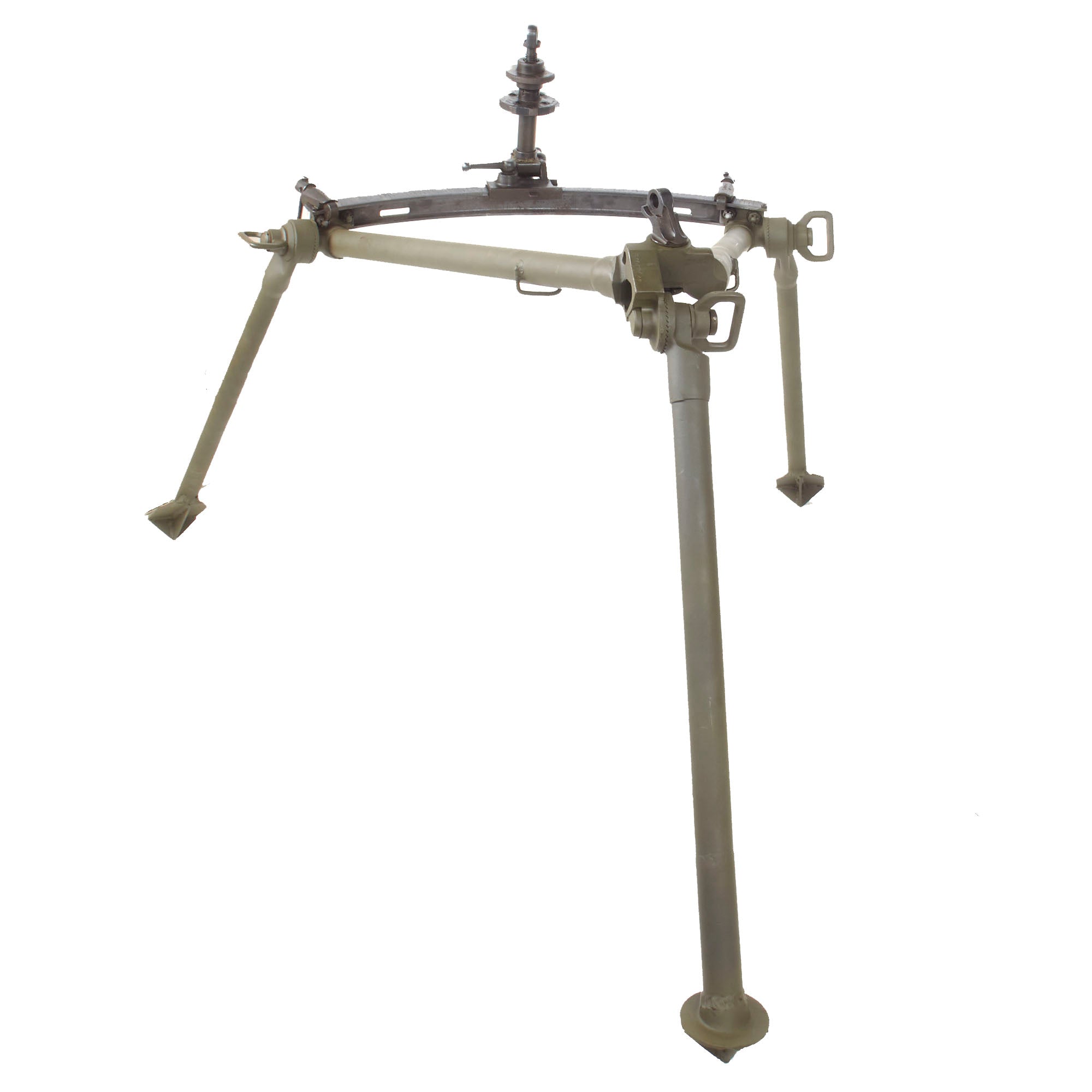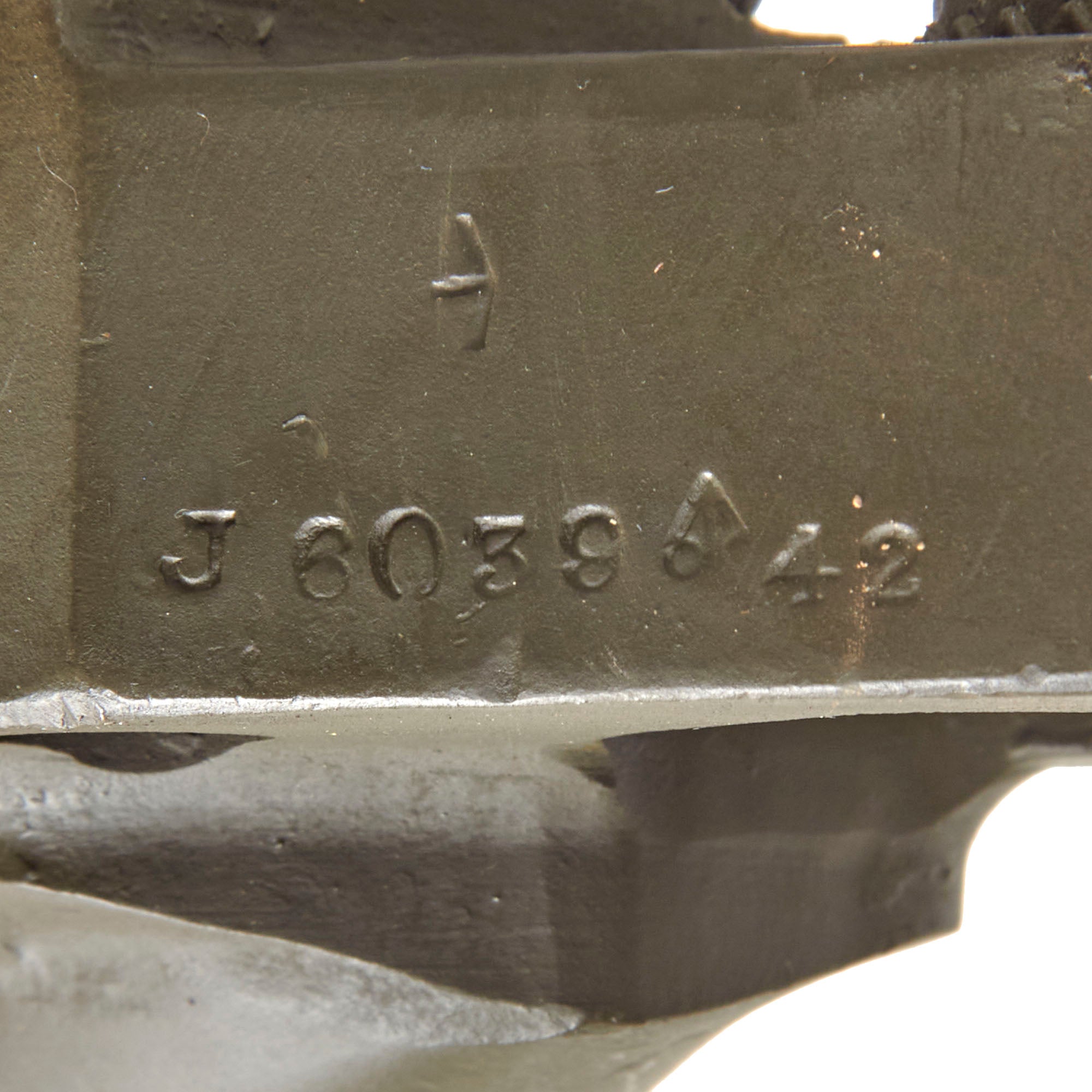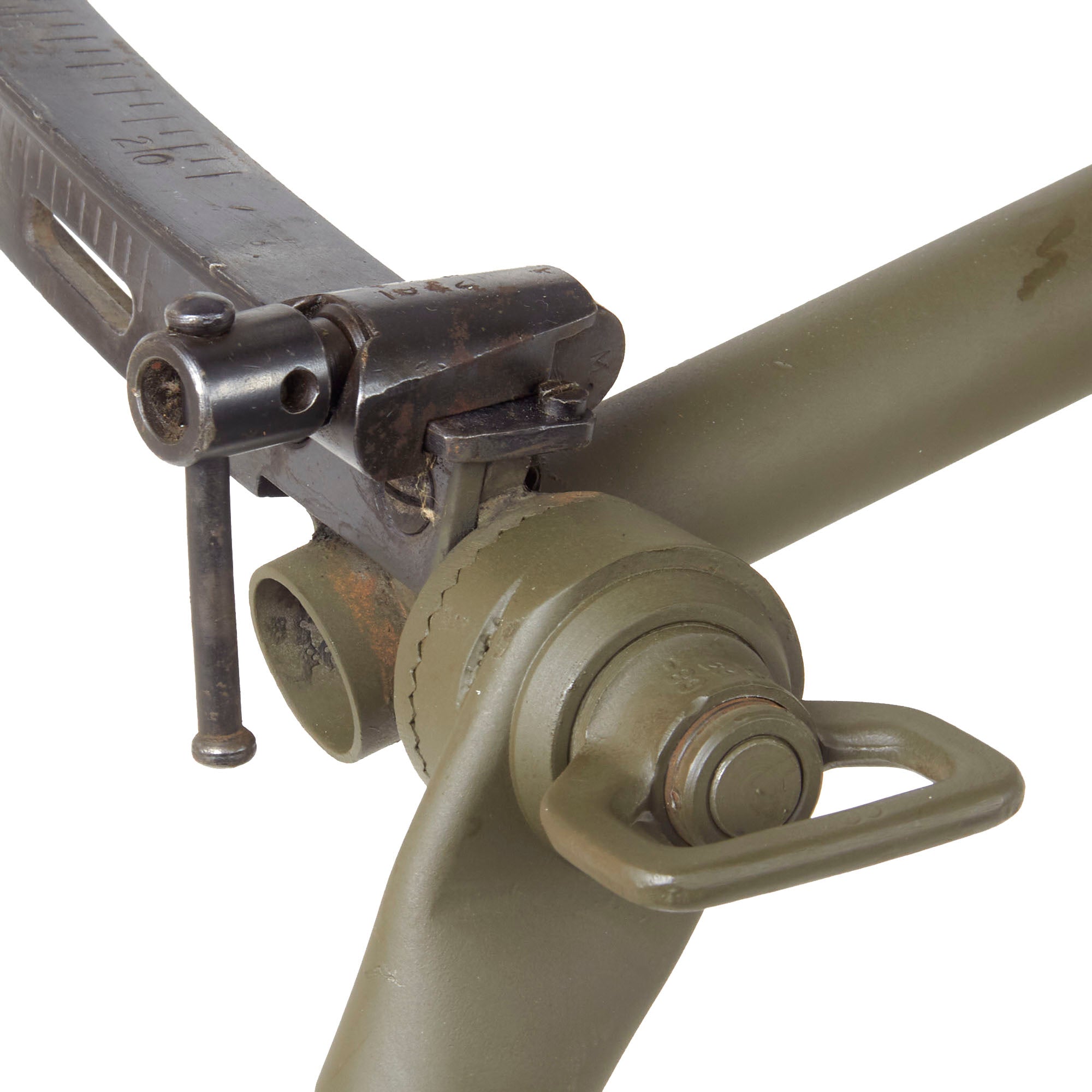 The included tripod is a lovely Post-Dunkirk MkII type, which was not designed to be used for Anti-Aircraft use. It does not have the third leg, nor a dovetail on the front attachment point where the leg or an SMLE could attach. It also does not have the fitting on the front leg for the gun either. It is well marked, with several broad arrow markings, as well as serial number J 6039 and a date of 42 stamped where the front leg would have attached on the early version. It is fully functional, with all legs being able to be extended and locked into place. It has the rear T&E fully functional as well, and the traversal stops on the traverse bar are both present and moveable. It looks to have been repainted OD green at some point, and really looks smart!