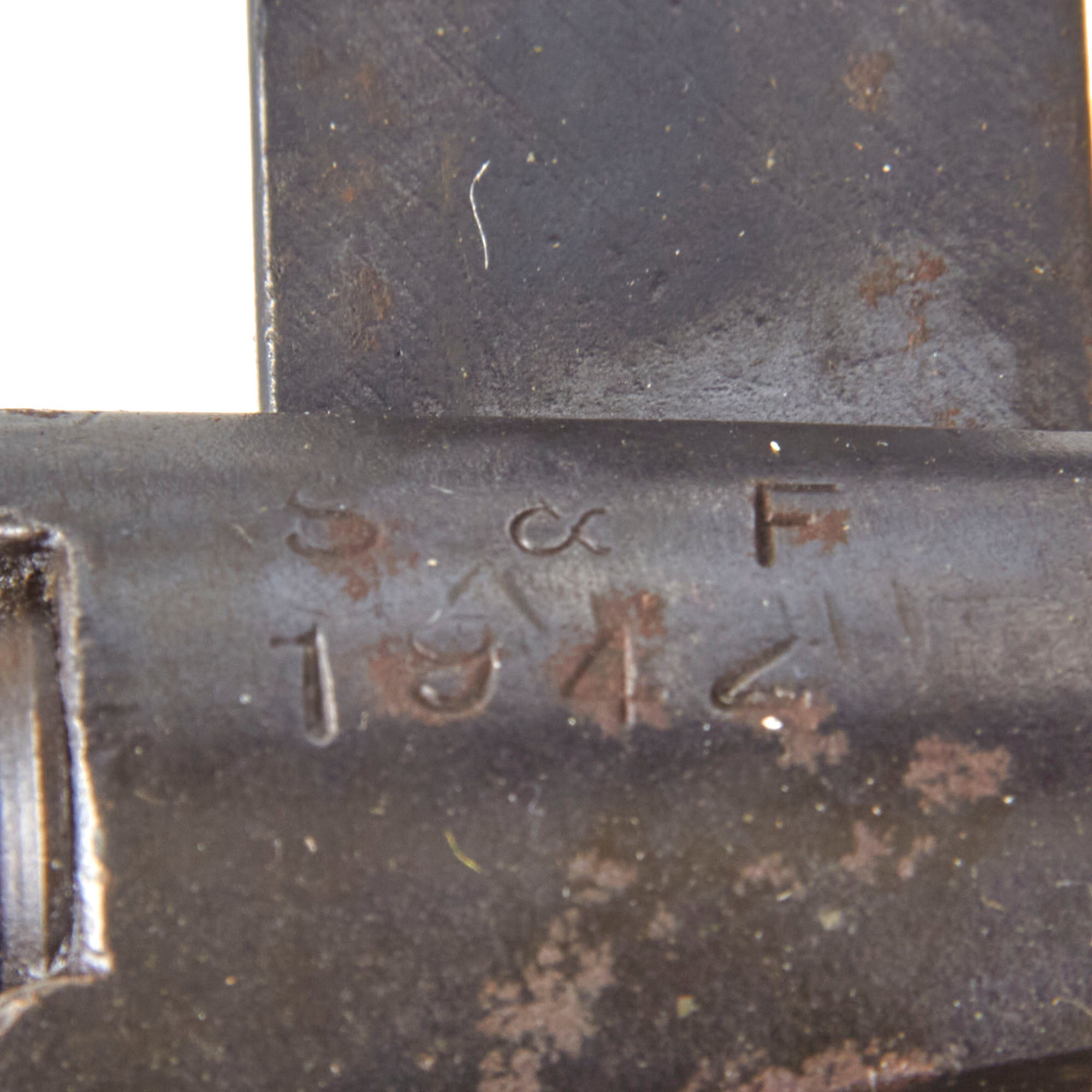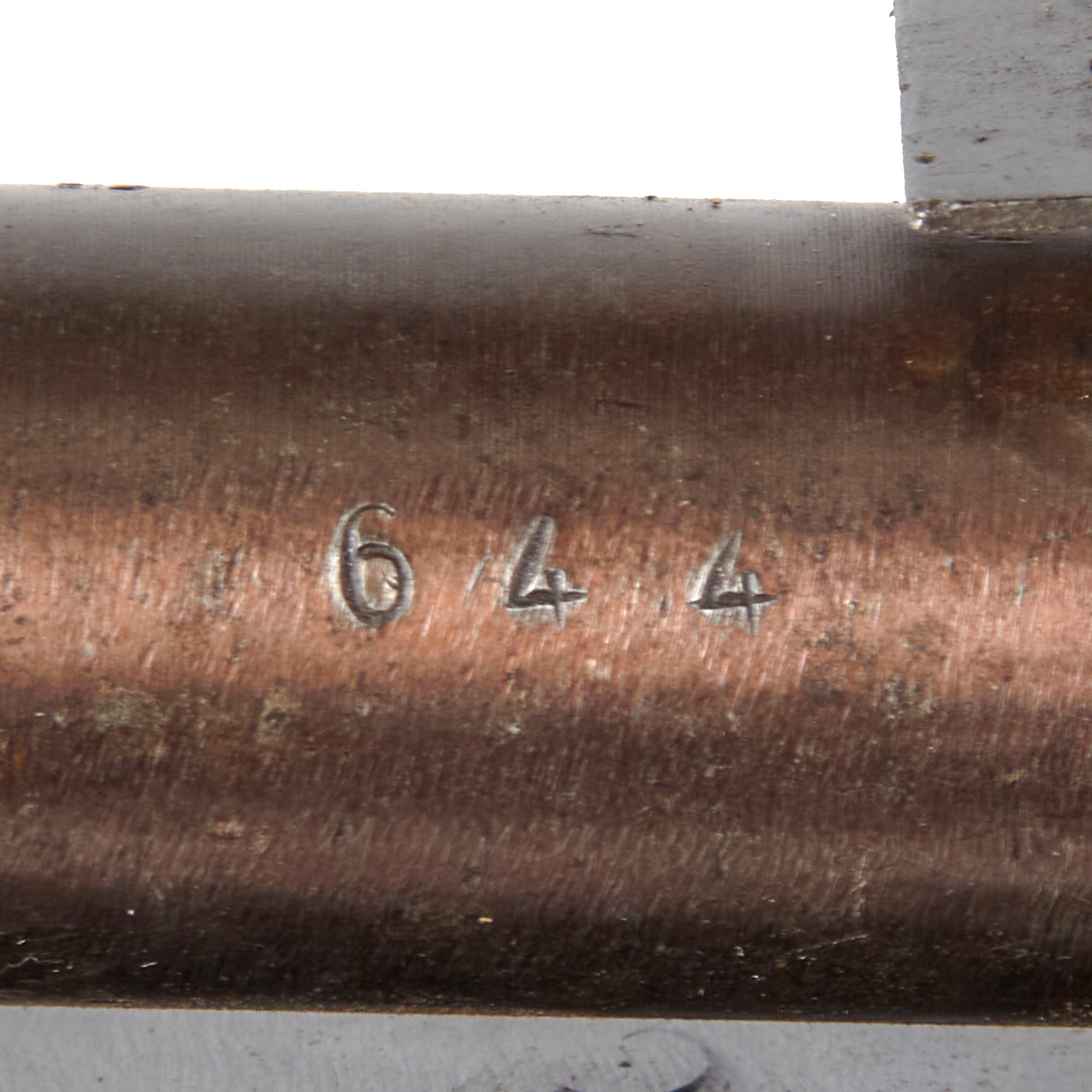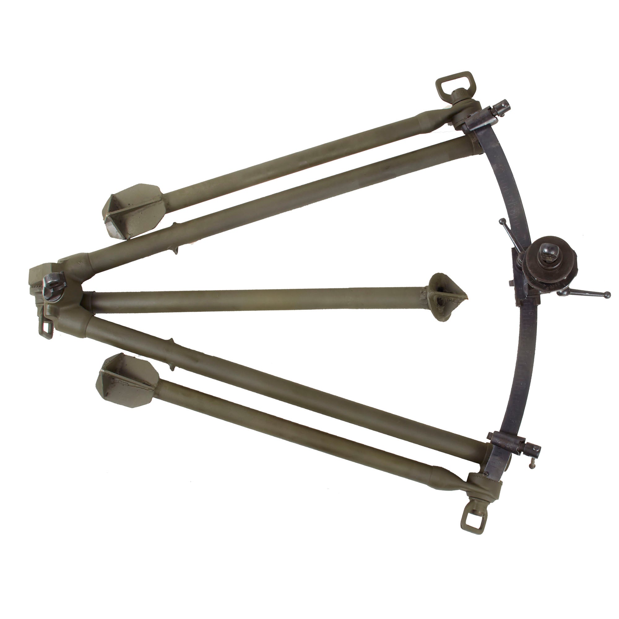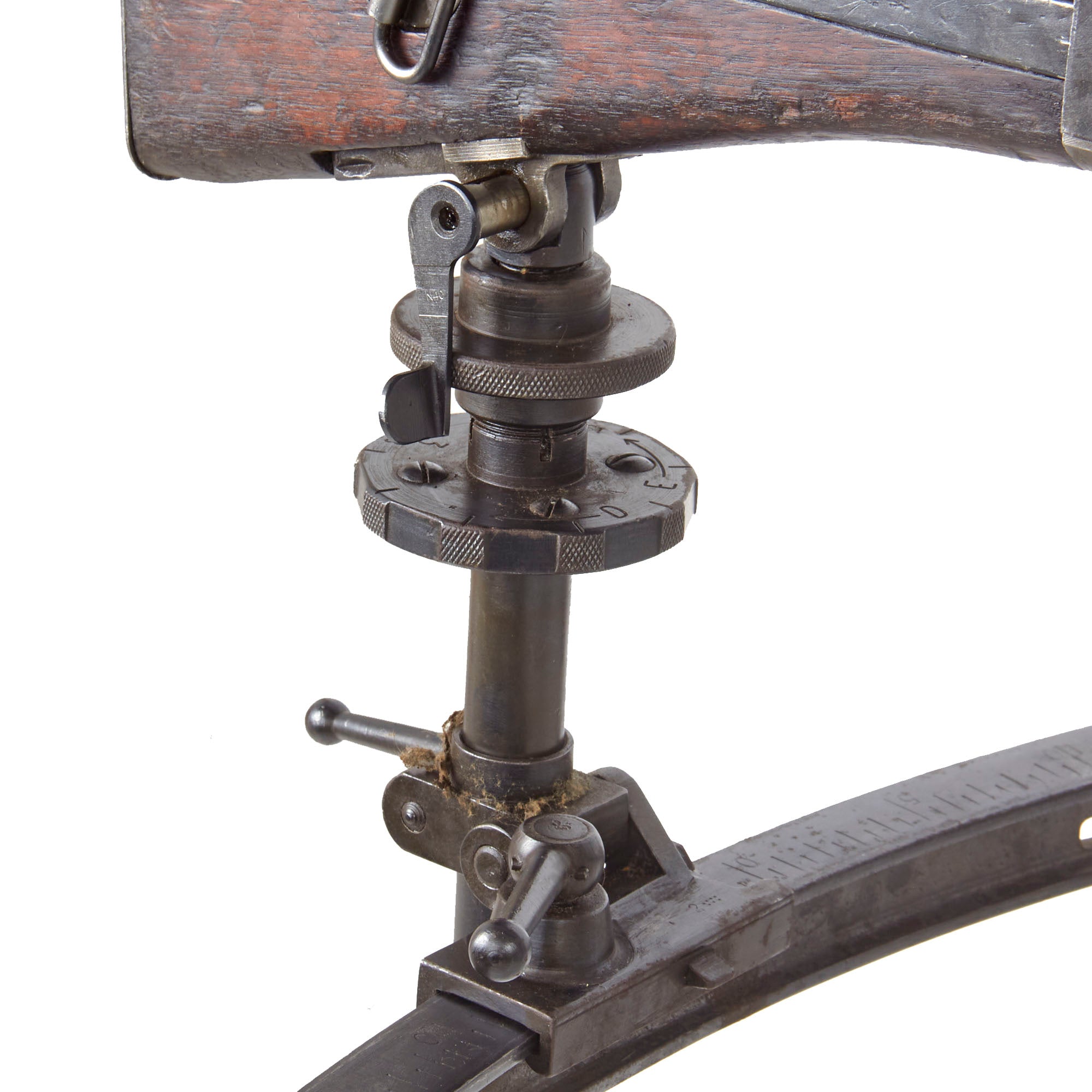 The included tripod is a lovely Post-Dunkirk MkII type, which was not designed to be used for Anti-Aircraft use. It does not have the third leg, nor a dovetail on the front attachment point where the leg or an SMLE could attach. It also does not have the fitting on the front leg for the gun either. It is well marked, with several broad arrow markings, as well as serial number J 6039 and a date of 42 stamped where the front leg would have attached on the early version. It is fully functional, with all legs being able to be extended and locked into place. It has the rear T&E fully functional as well, and the traversal stops on the traverse bar are both present and moveable. It looks to have been repainted OD green at some point, and really looks smart!