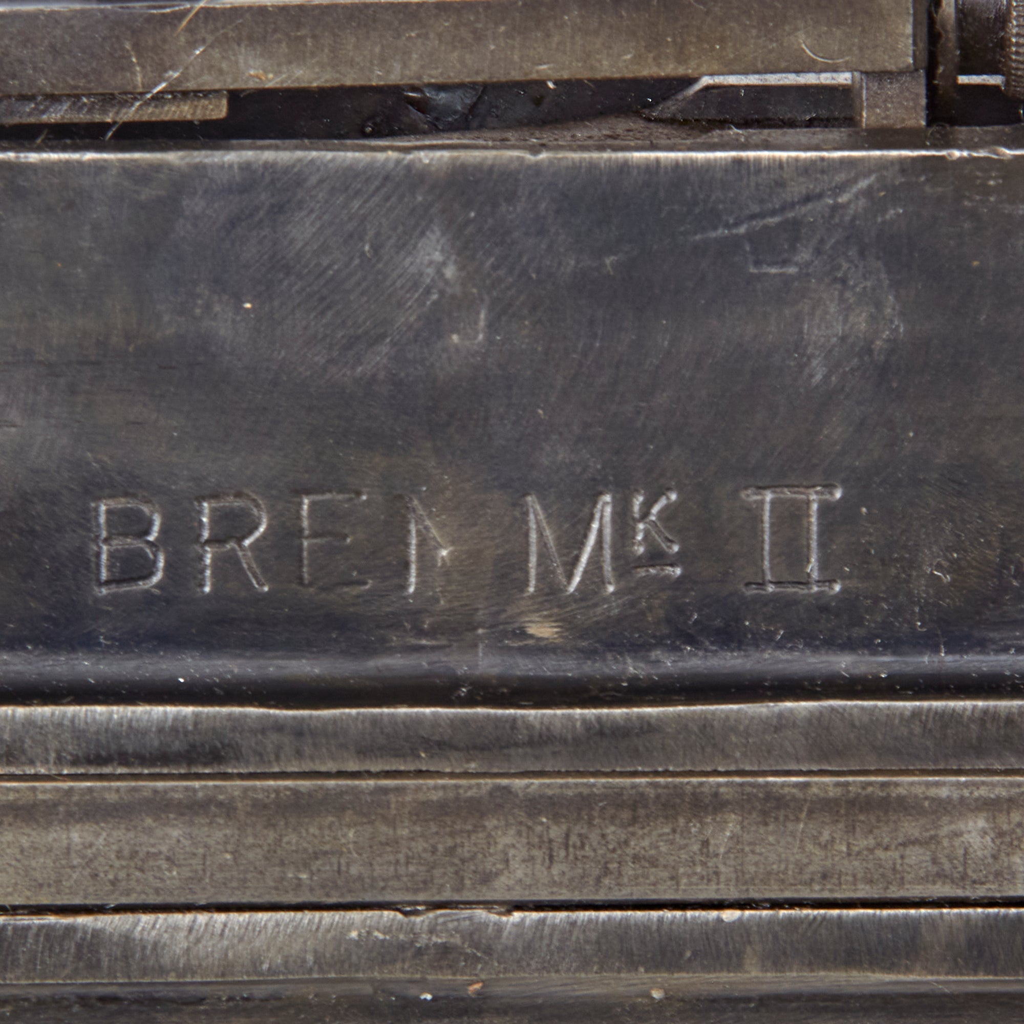 This display gun has the correct MkII receiver, with a ladder sight attached to the rear, and the correct "high ears" on the front of the gas tube. The butt stock is the correct simplified version, with a sling swivel on the side, and a flat butt plate with a small shoulder rest at the top. The lower frame is the shorter MkII type, which stops after front tripod mounting location, and the receiver is fitted with the correct MkII pattern cocking handle. It comes with an original WW2 Bren magazine, which will be deactivated where required.