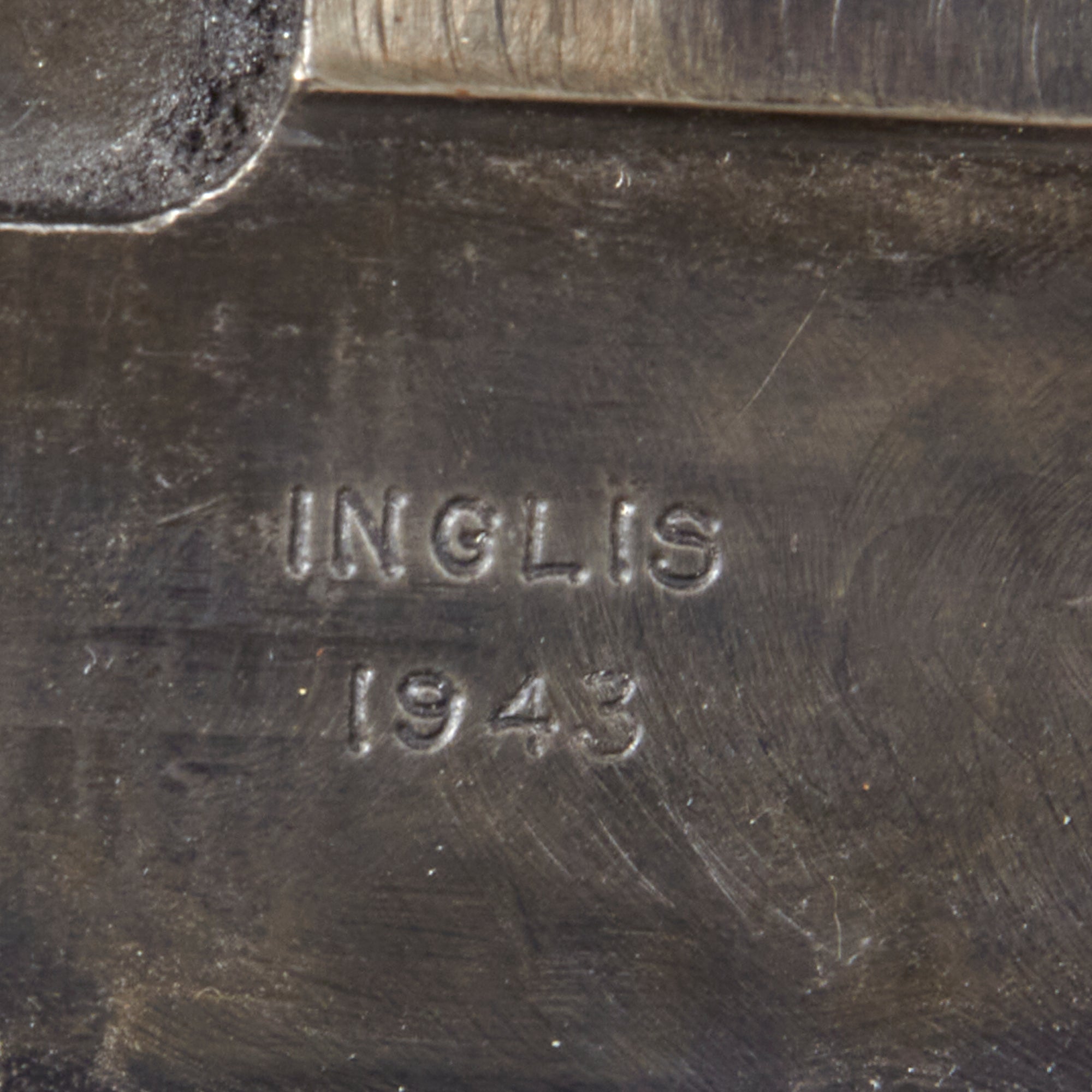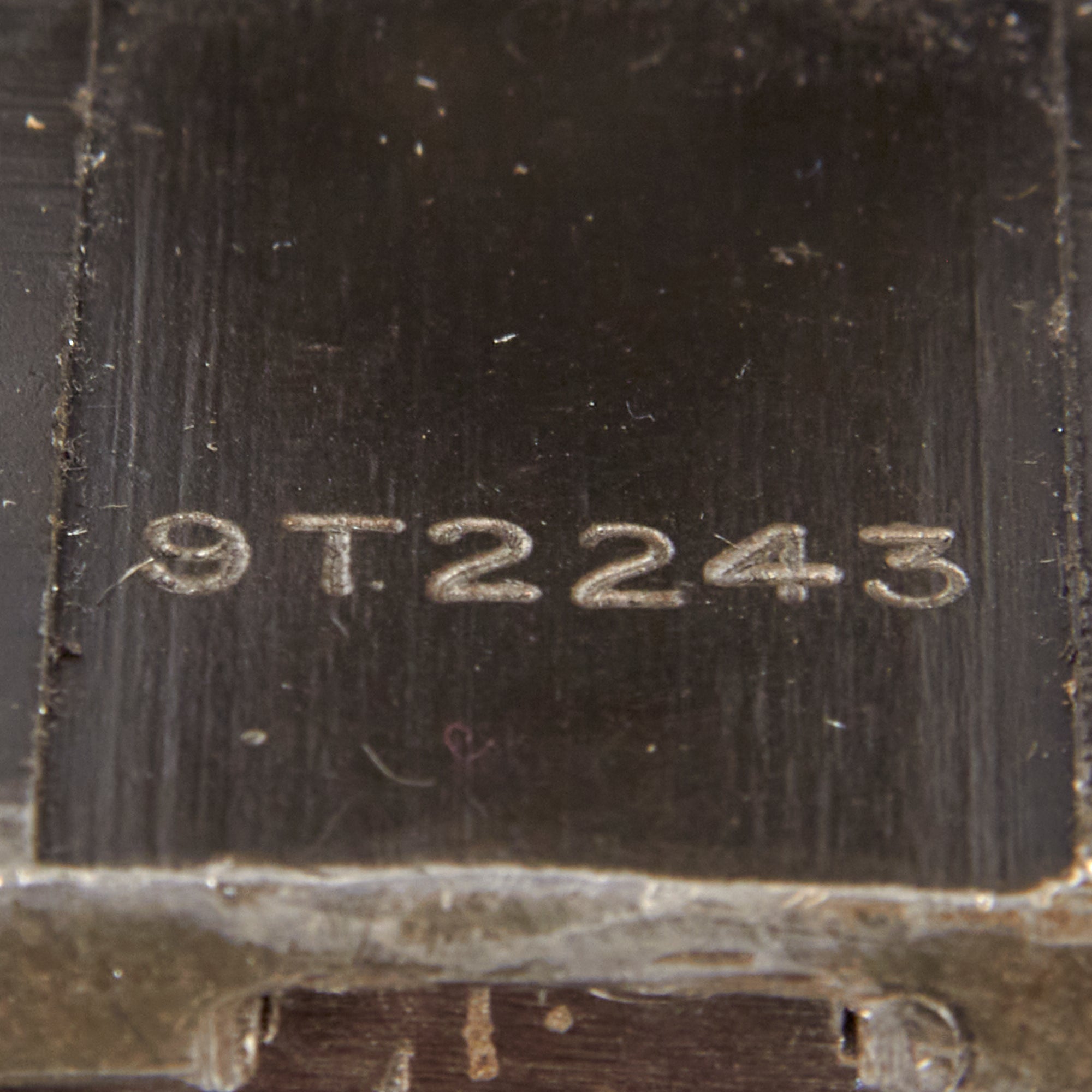 The display gun comes complete with an original magazine, which still locks in securely, and can be released using the magazine catch. The MkII steel barrel on this example is still LIVE, with an intact chamber and none of the demilitarization that was done to barrels post 2001. The bore still shows rifling, but also wear and past fouling, so it did see a good amount of use. It still locks into the receiver securely, though unlocking it can take a rubber mallet to convince the lock and barrel to move. The display gun marked BREN Mk II on the rear receiver over the cocking lever. It is also marked INGLIS / 1943 farther up the receiver, indicating manufacture by the Canadian Firm of John Inglis, who was contracted to make Bren guns by the British Military during WWII after many were lost at Dunkirk. They were first mainly making the MkIm, which had some simplifications to the design, and then later made the MkII, which removed a lot of the faults of the MkI design, while reducing production time. The rear of the receiver bears partial serial number 9T2243, the correct format for an Inglis made gun.