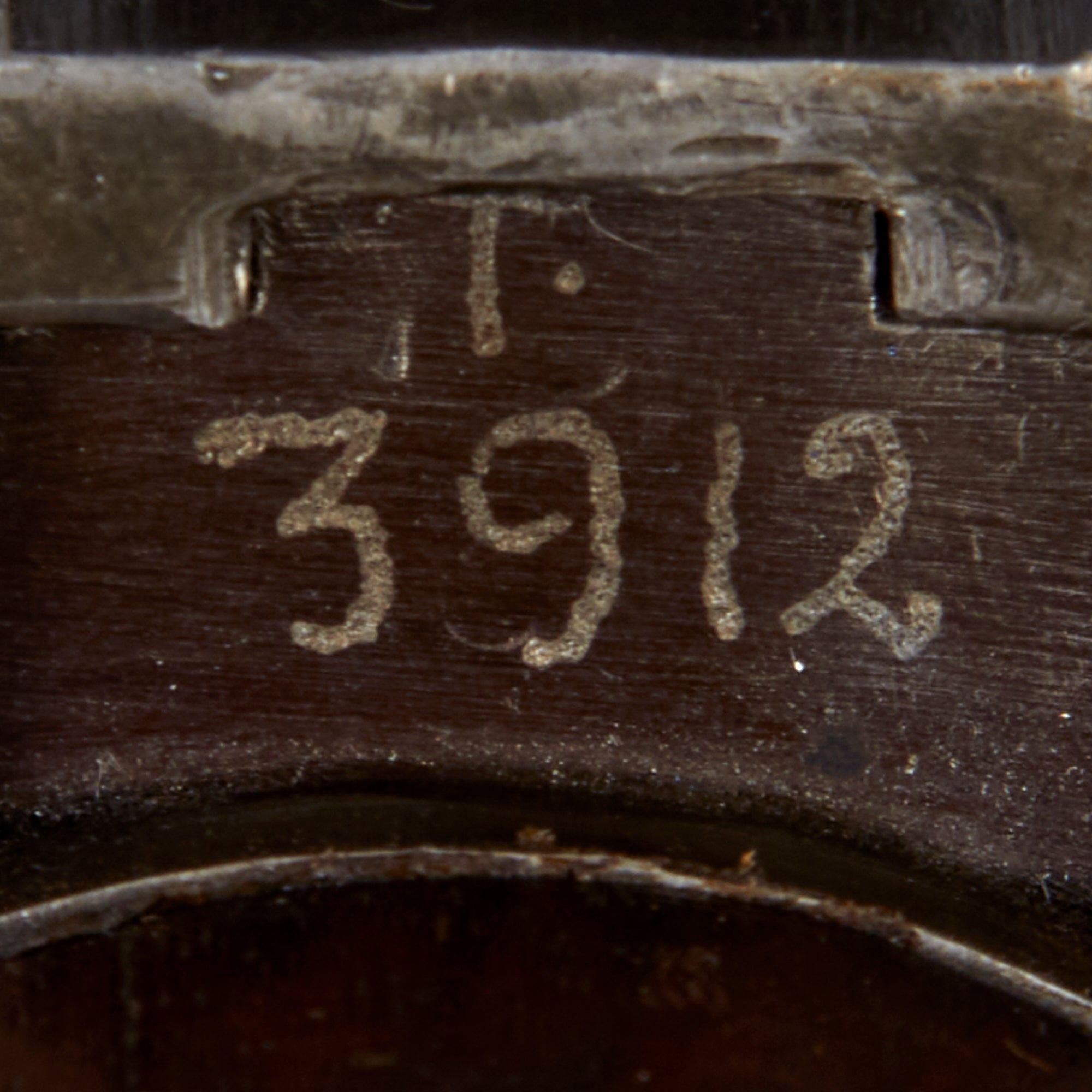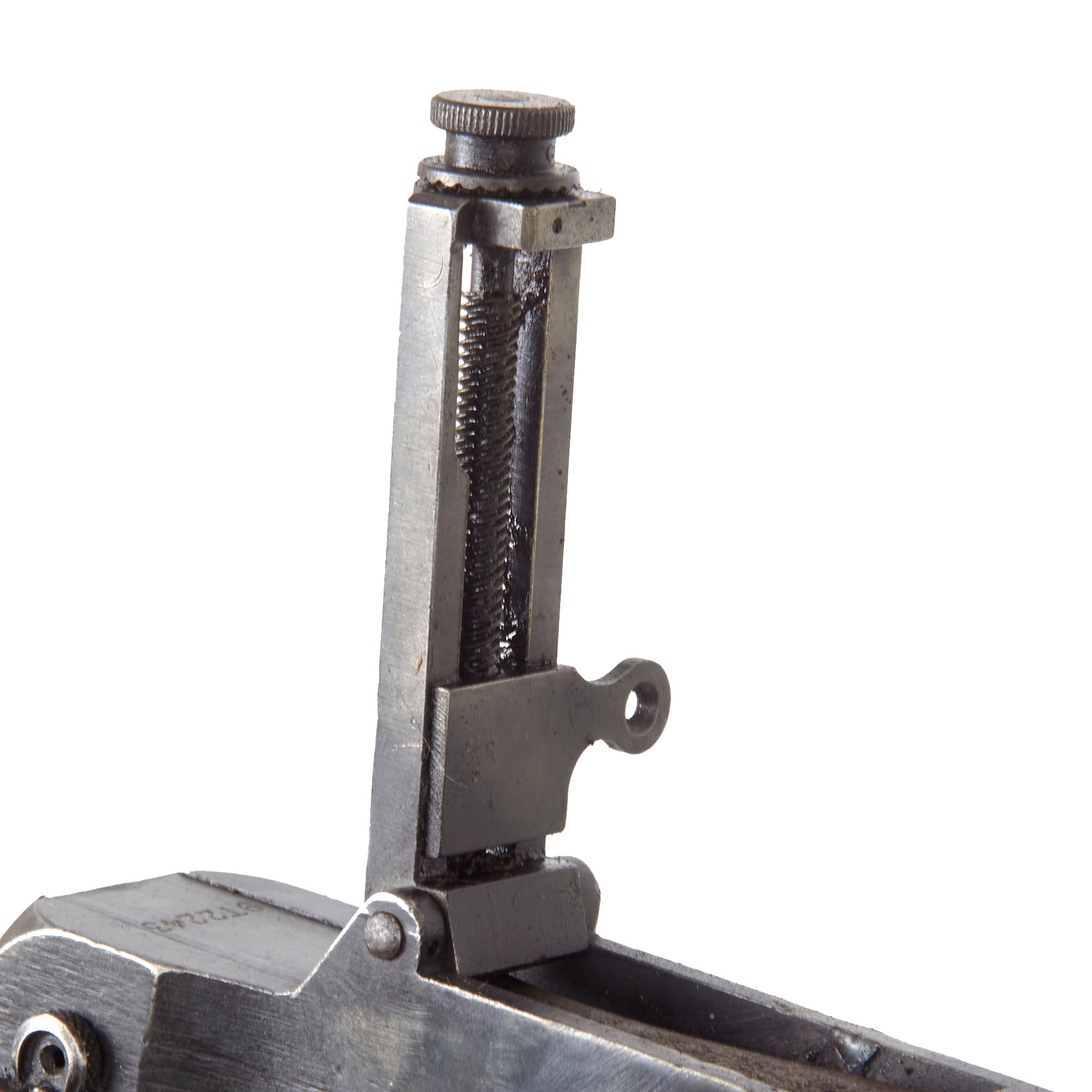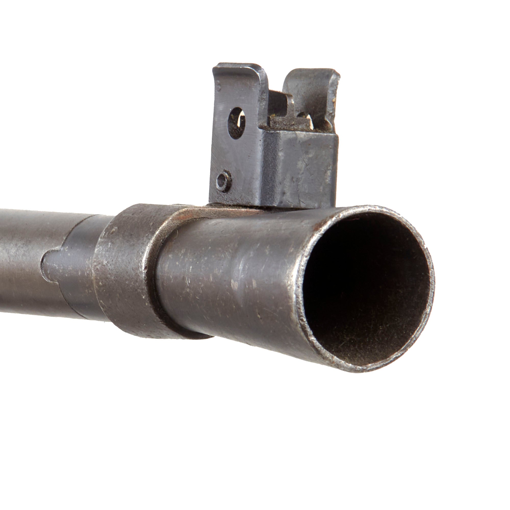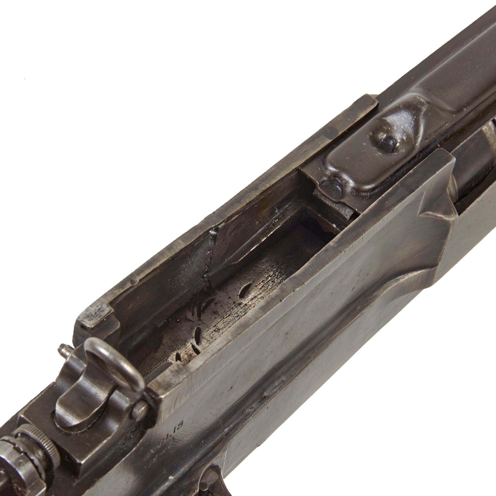 Overall the display gun is in very nice condition, with much of the original finish present on the original parts. Pistol grip and butt stock are in solid shape, with a great color and grain. There is no crack through the butt stock, as often seen on these due to the "lip" on the butt plate. There is however a repair on the top of the butt stock where it meets the receiver, as we see on virtually all examples.