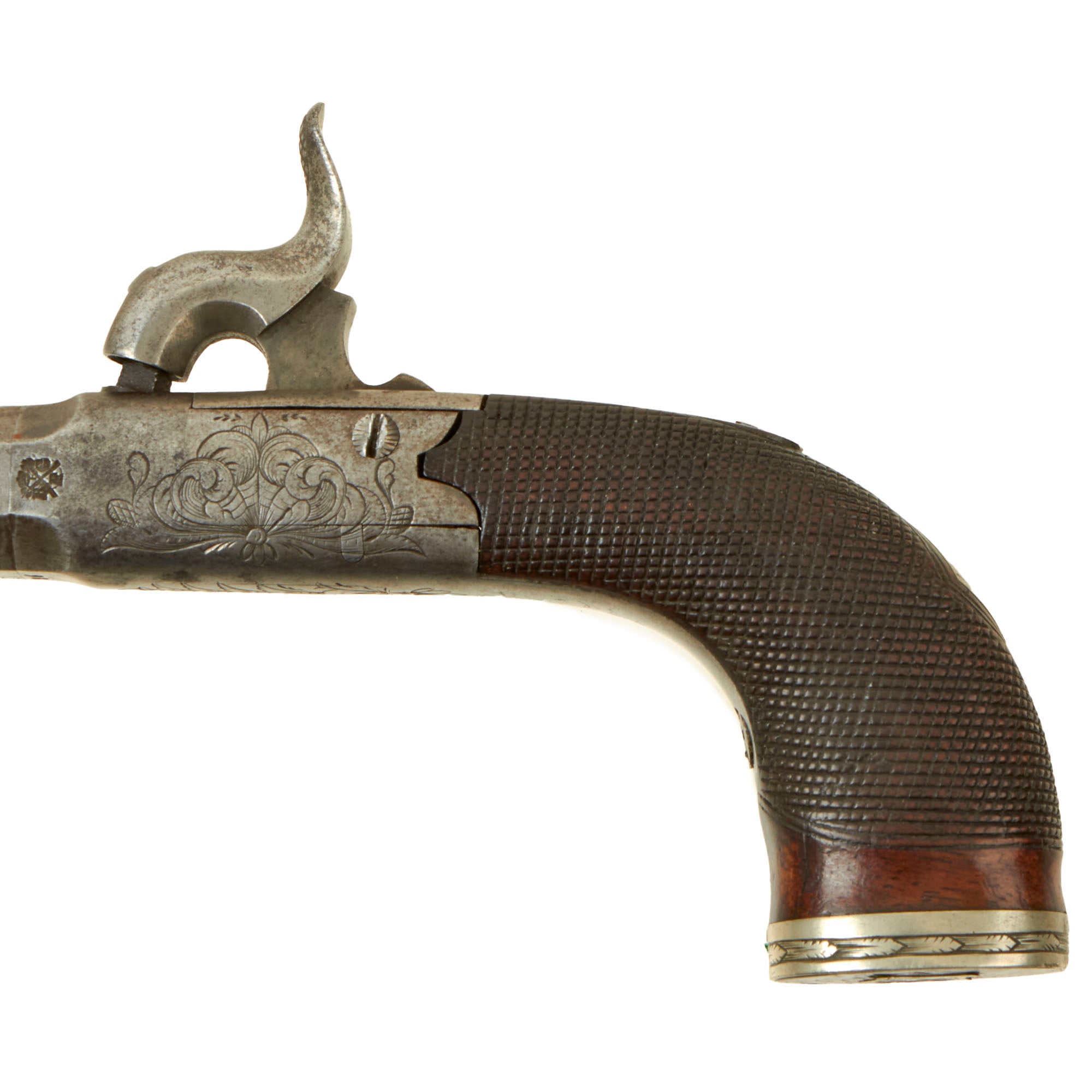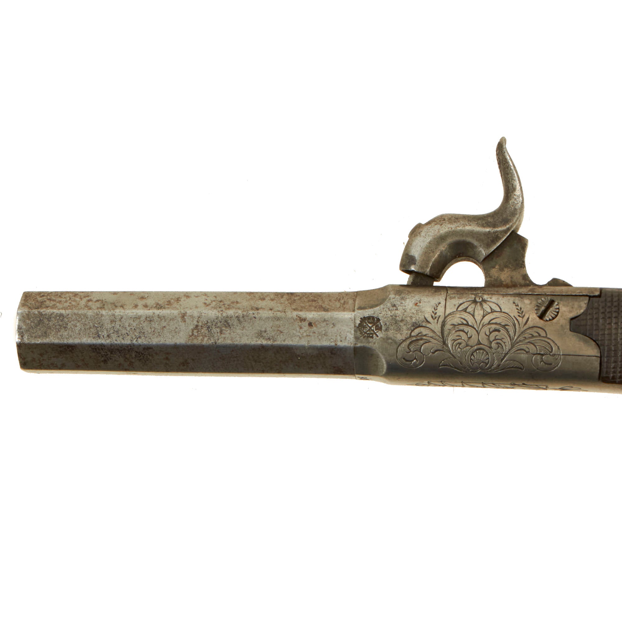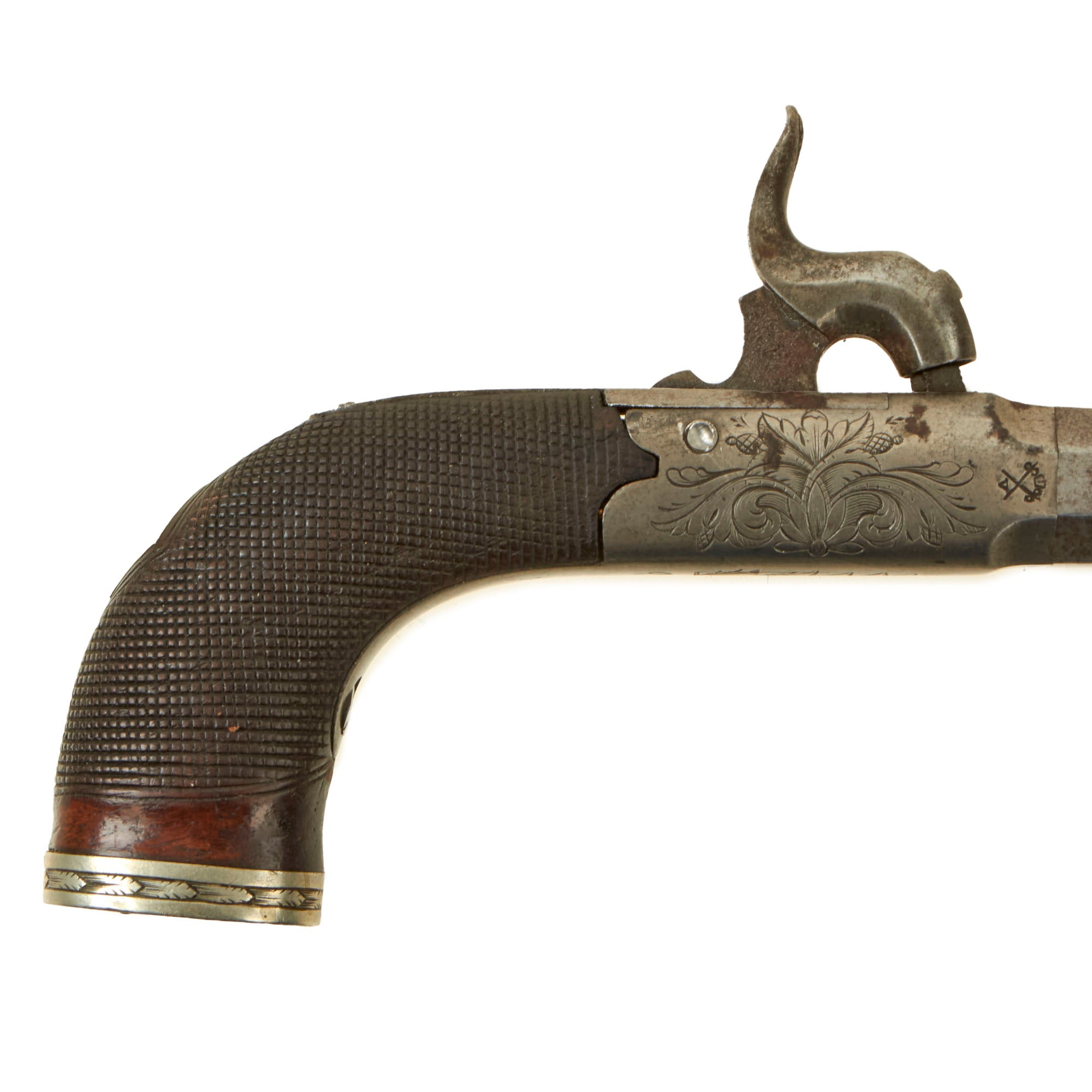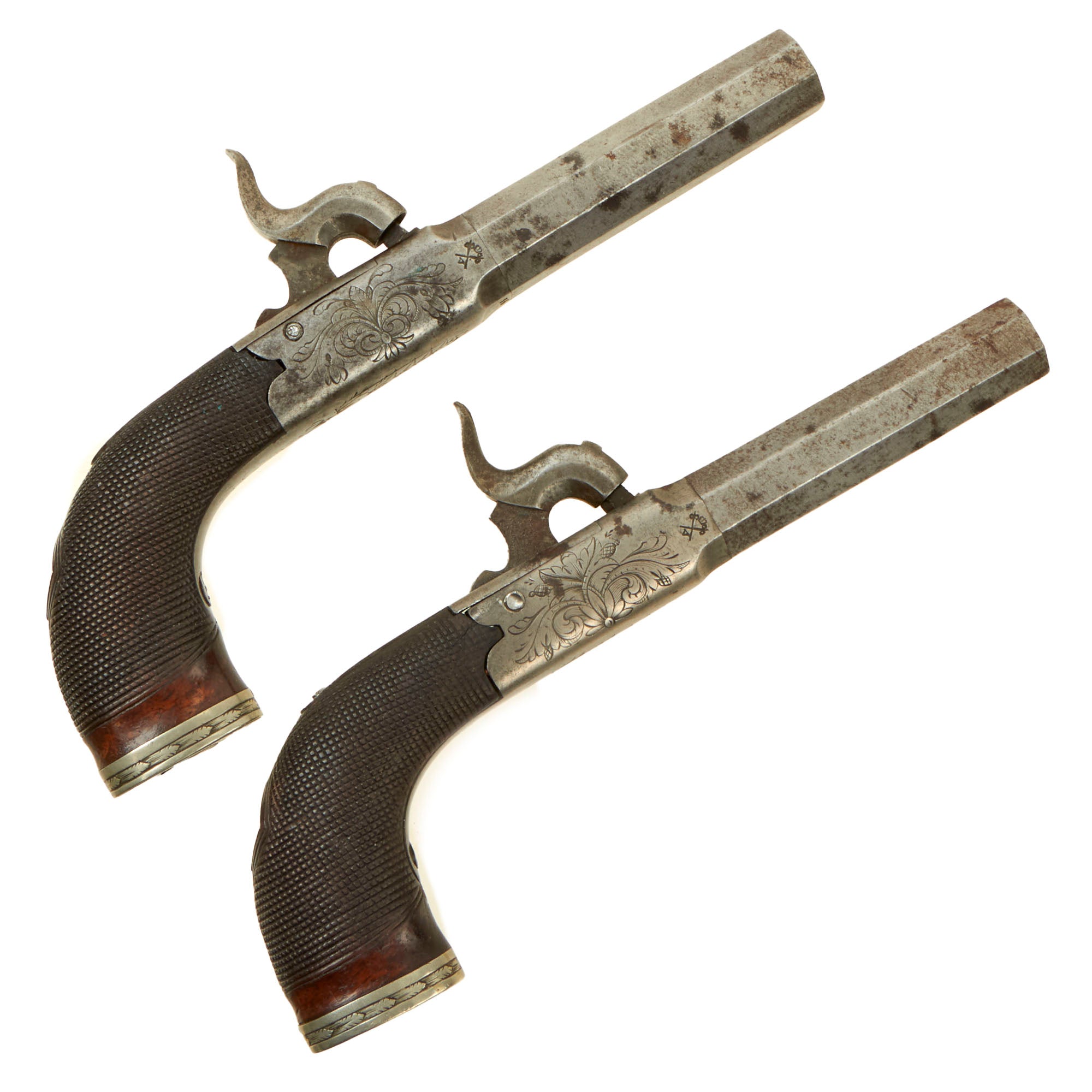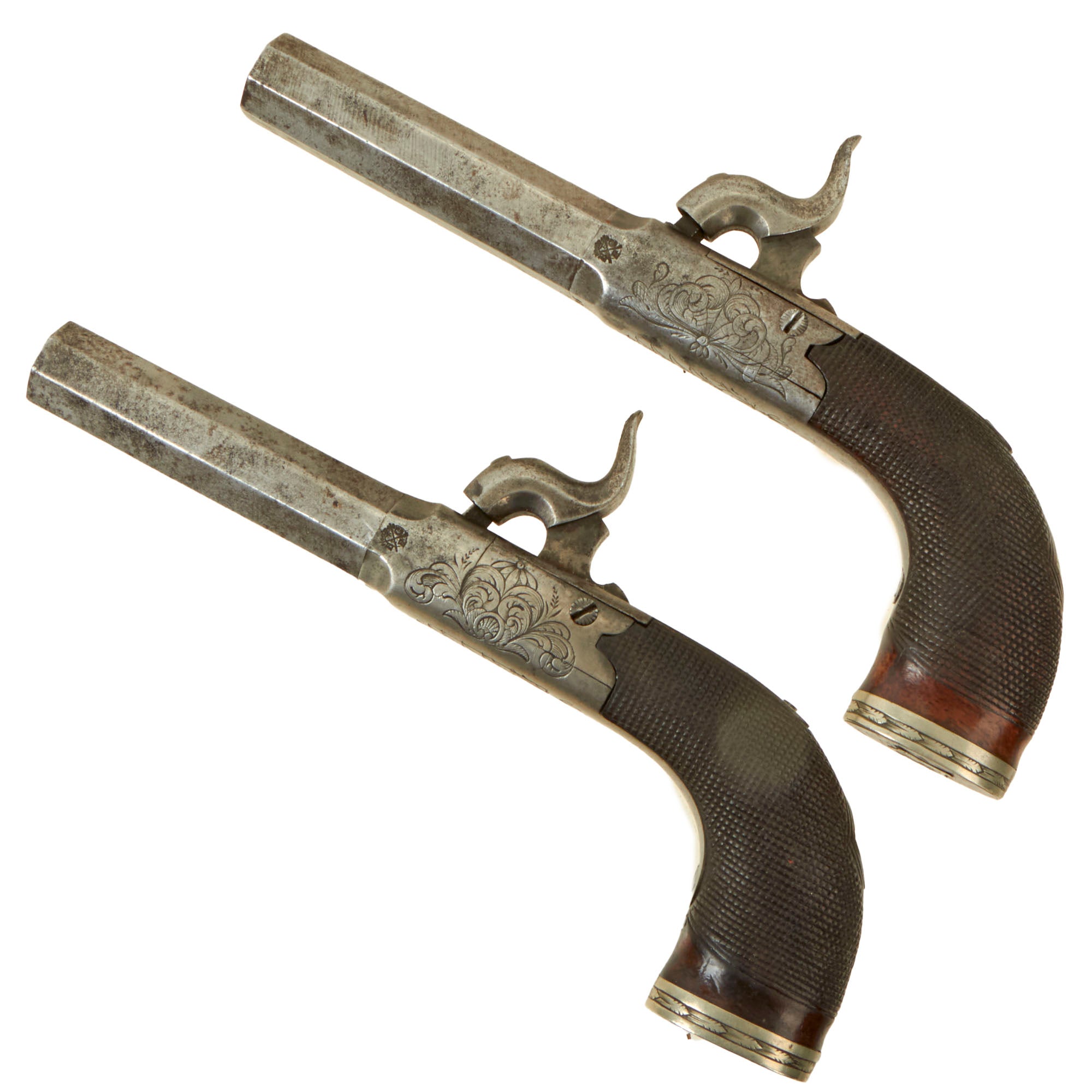 Original Items: Only One Pair Available. This is a lovely matched pair of Victorian Era British Vest Pocket Percussion pistols, completely unmarked on the "box lock" style frame, but definitely of very high quality, with lovely engraving on all sides of the frame. These were quite popular for self-protection, and were easily concealable in a vest pocket. Pistols like this were equally at home on dark Streets of New York or of London in Victorian England. We assume it was bespoke, or possibly made unmarked for a retailer.