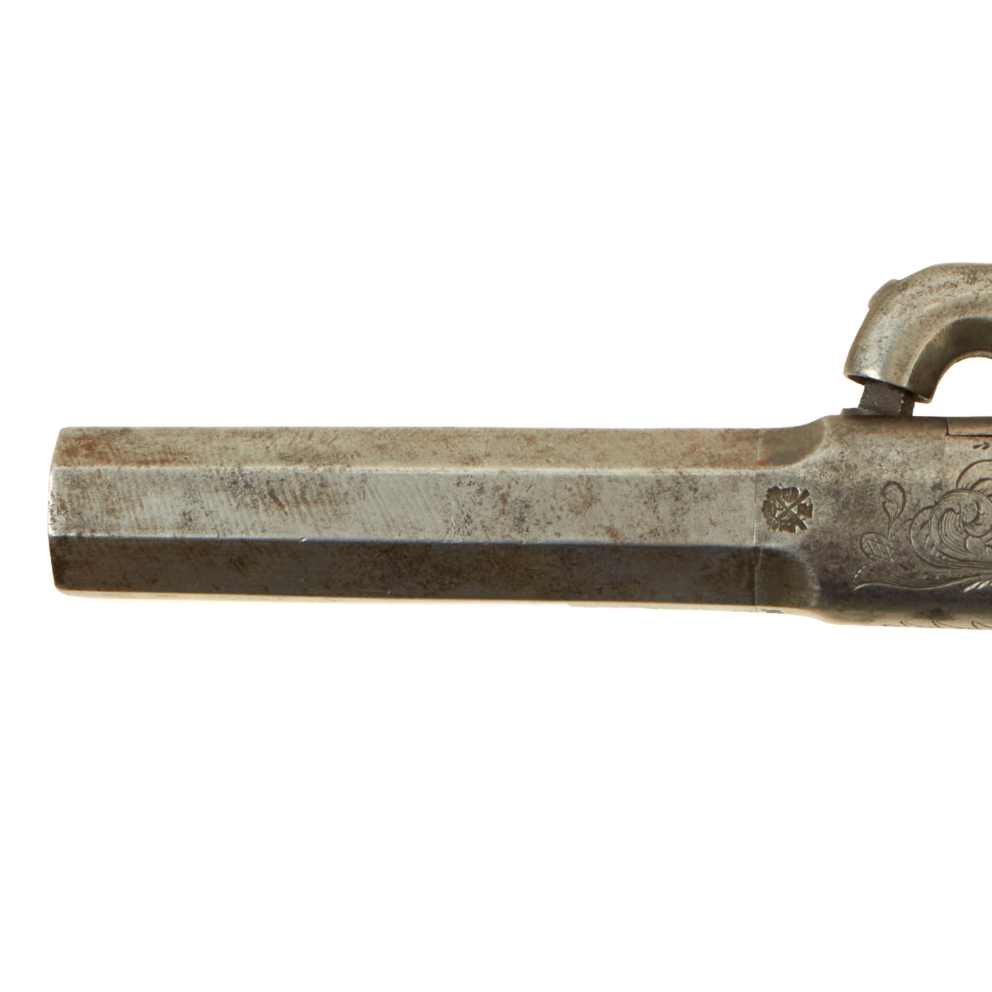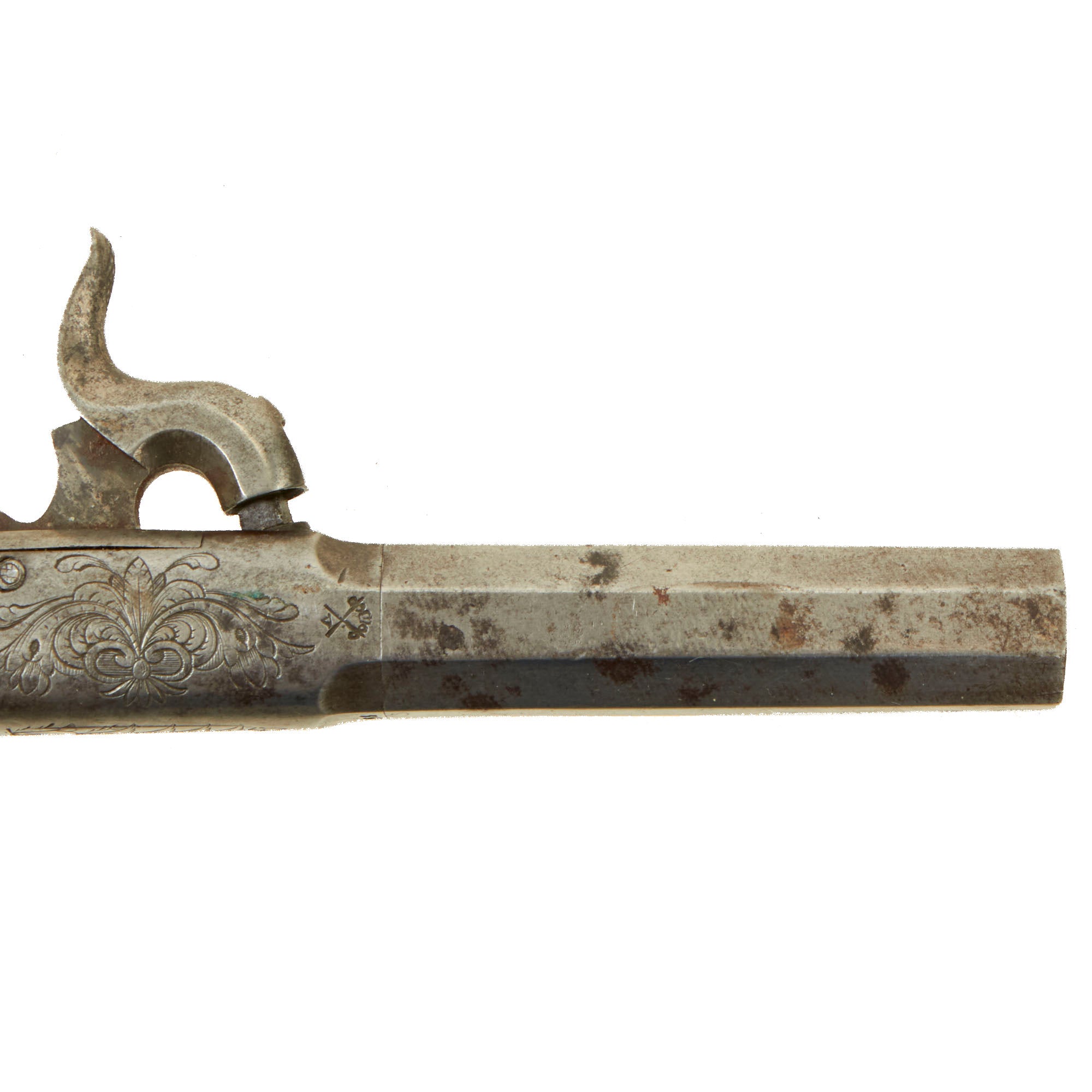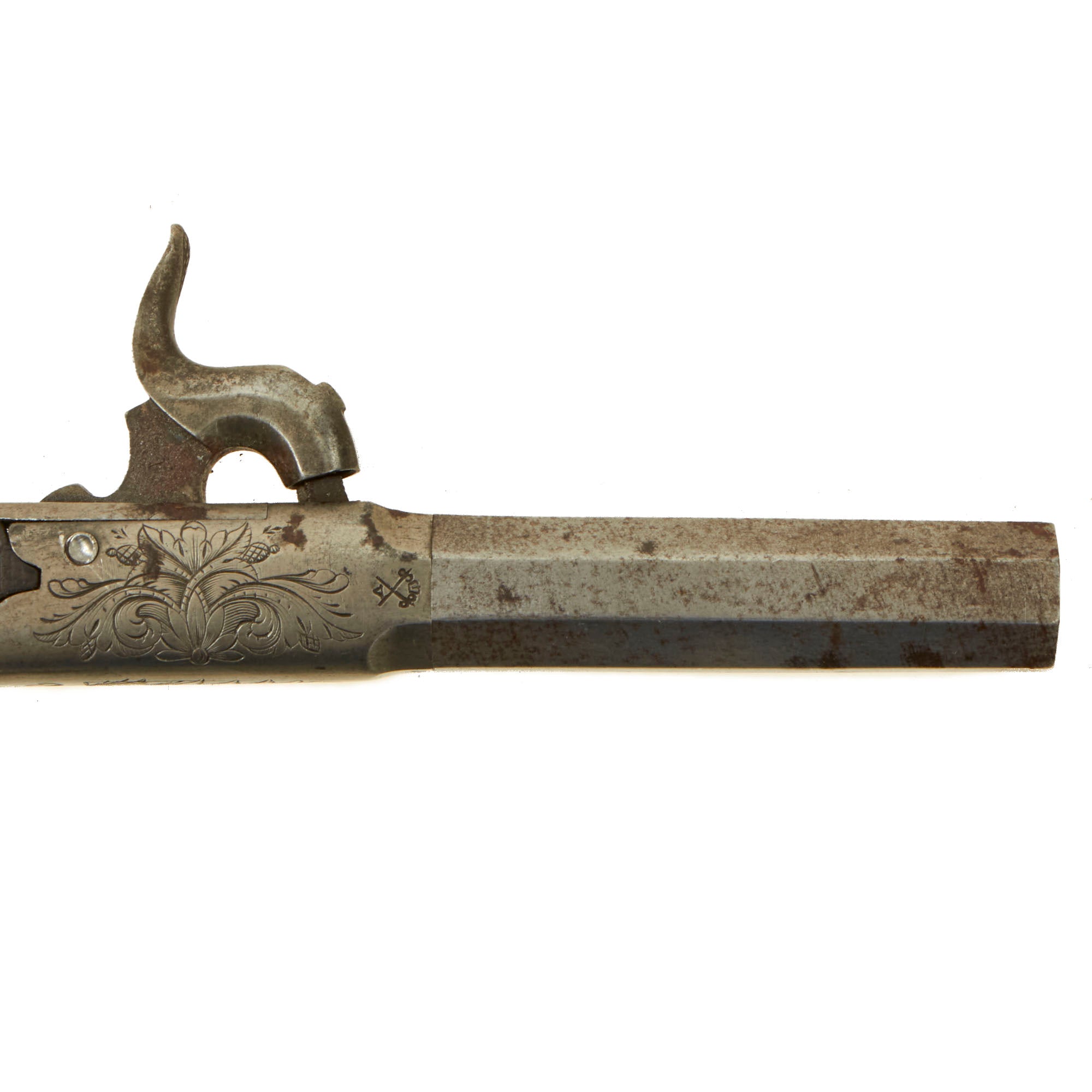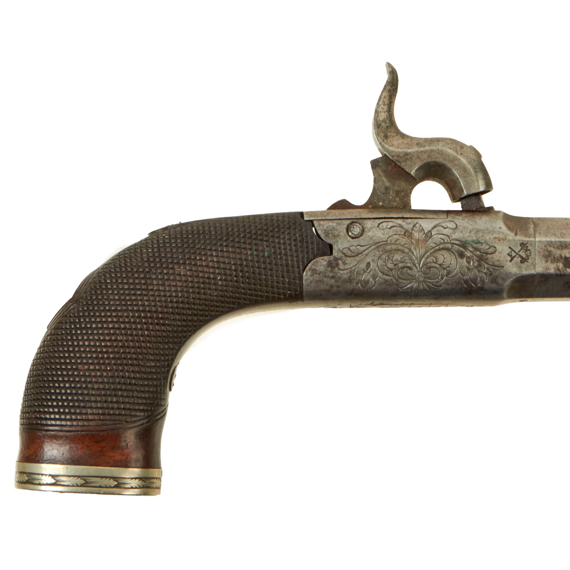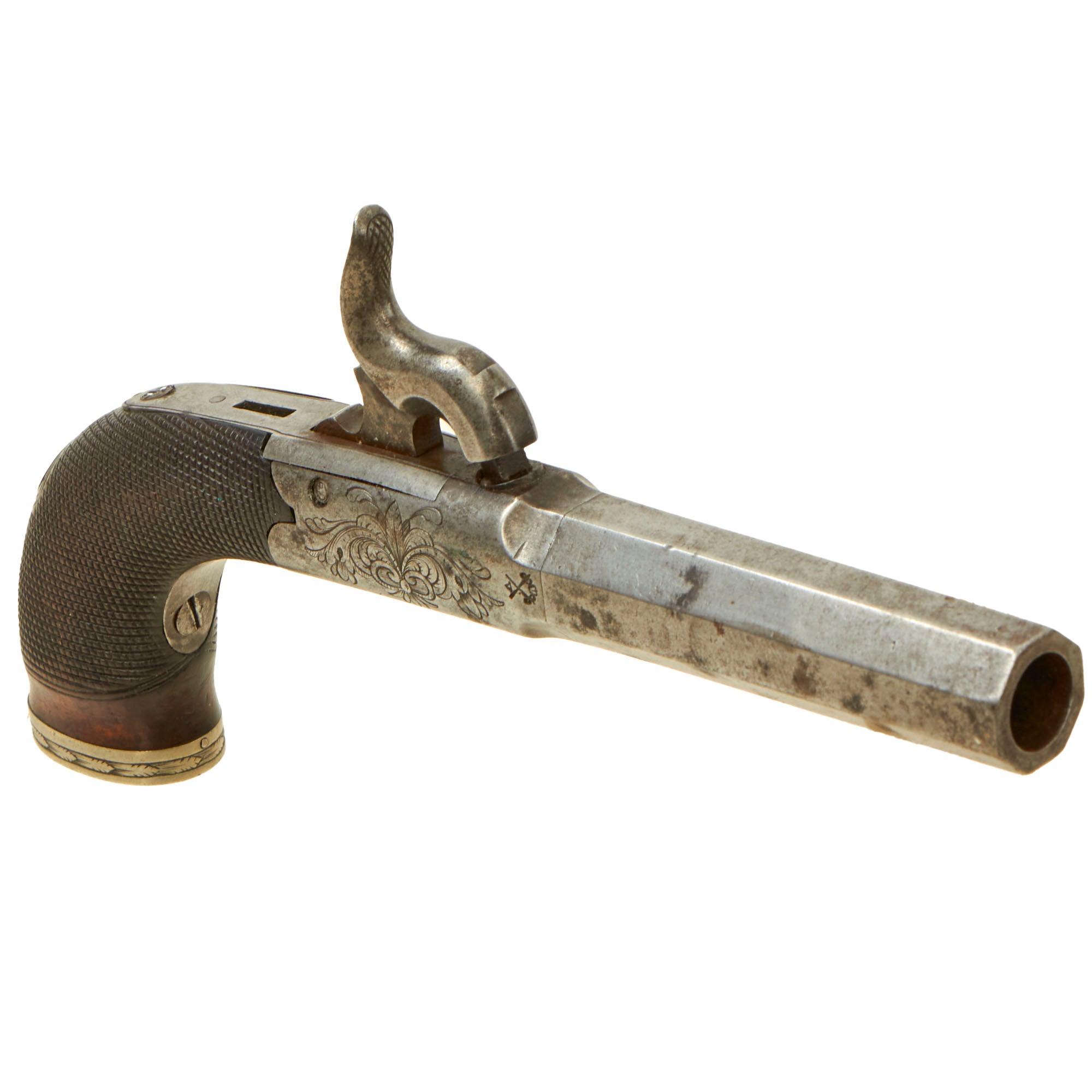 Original Items: Only One Pair Available. This is a lovely matched pair of Victorian Era British Vest Pocket Percussion pistols, completely unmarked on the "box lock" style frame, but definitely of very high quality, with lovely engraving on all sides of the frame. These were quite popular for self-protection, and were easily concealable in a vest pocket. Pistols like this were equally at home on dark Streets of New York or of London in Victorian England. We assume it was bespoke, or possibly made unmarked for a retailer.