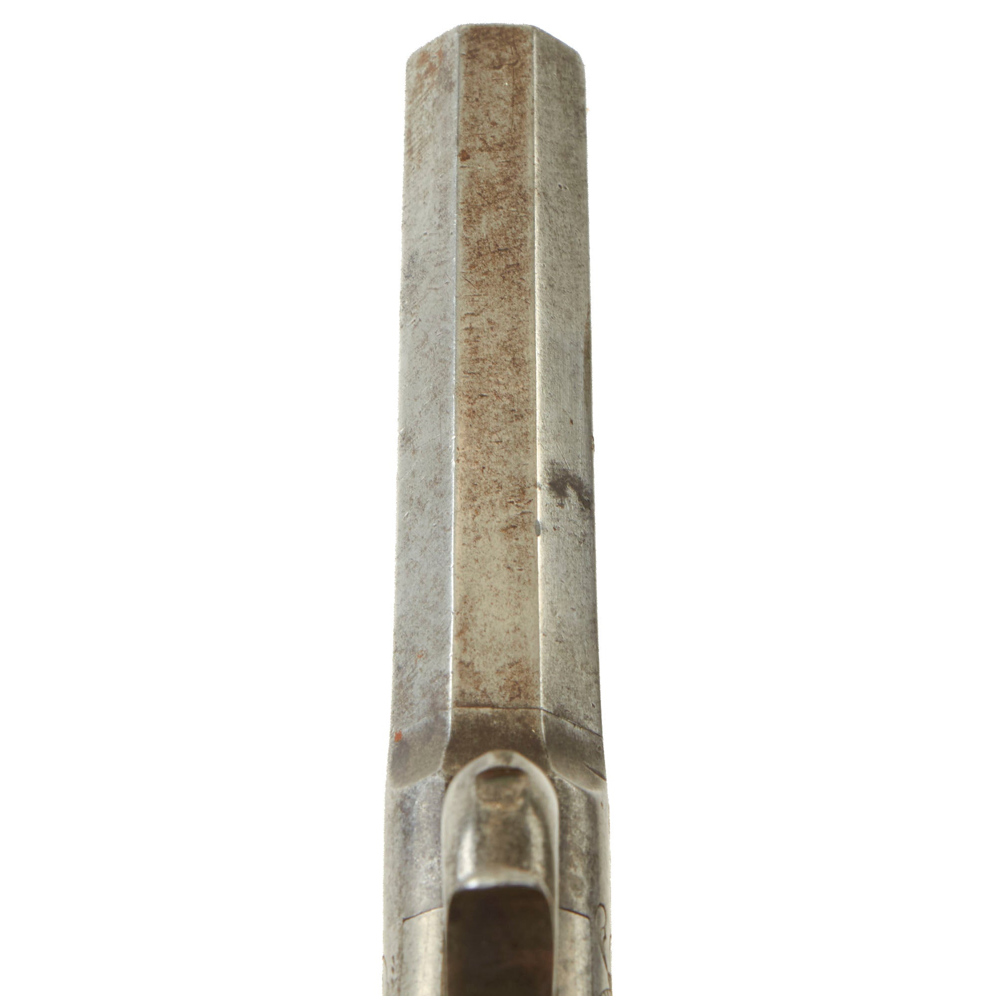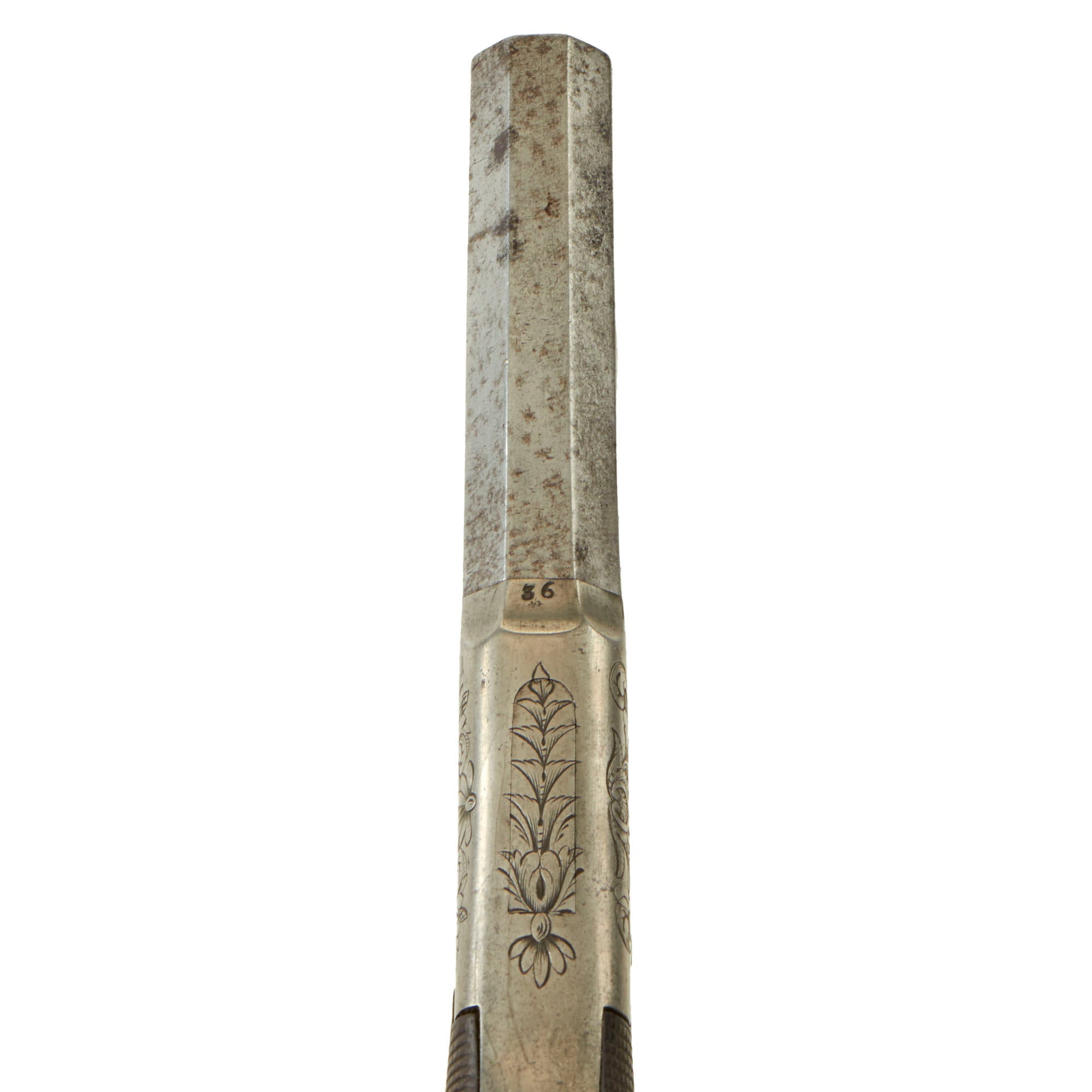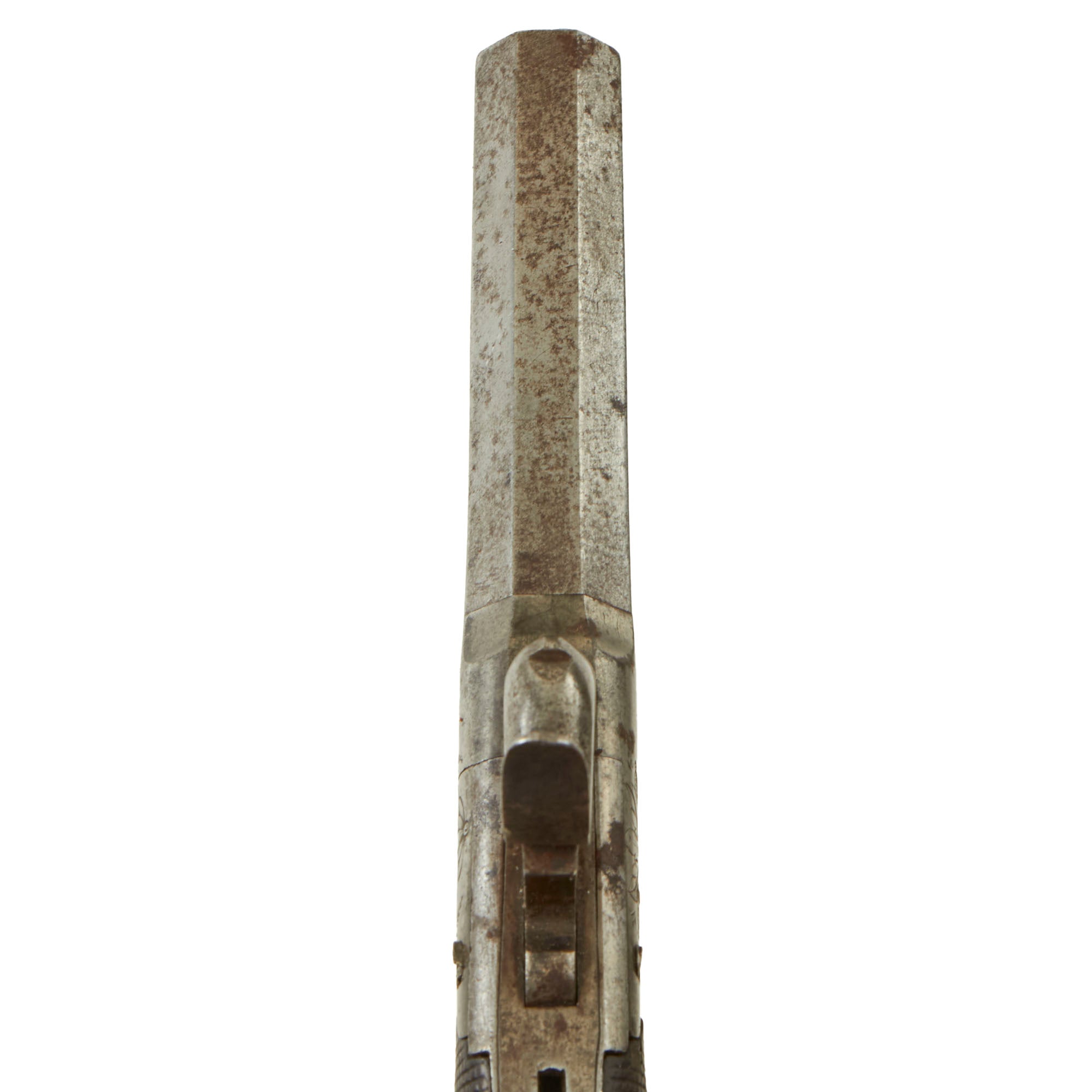 The pistols measure 7 1/2 inches in overall length, featuring a 2 7/8 inch "turn off" .49" caliber barrels, which made re-loading and cleaning the pistol a much easier process. As with most we see, the barrel joints are unfortunately seized with oxidation and fouling. The right sides of both frames are marked with the CROWN / CROSSED SCEPTERS / BPC "black powder proof" marking from from the city of Birmingham, England, while the right sides are marked with the CROWN / CROSSED SCEPTERS / V "viewed" mark. These are the style of markings in use until 1855. Both are also marked with number 36 on the bottom front of the frame by the barrel joint, probably a matching number.