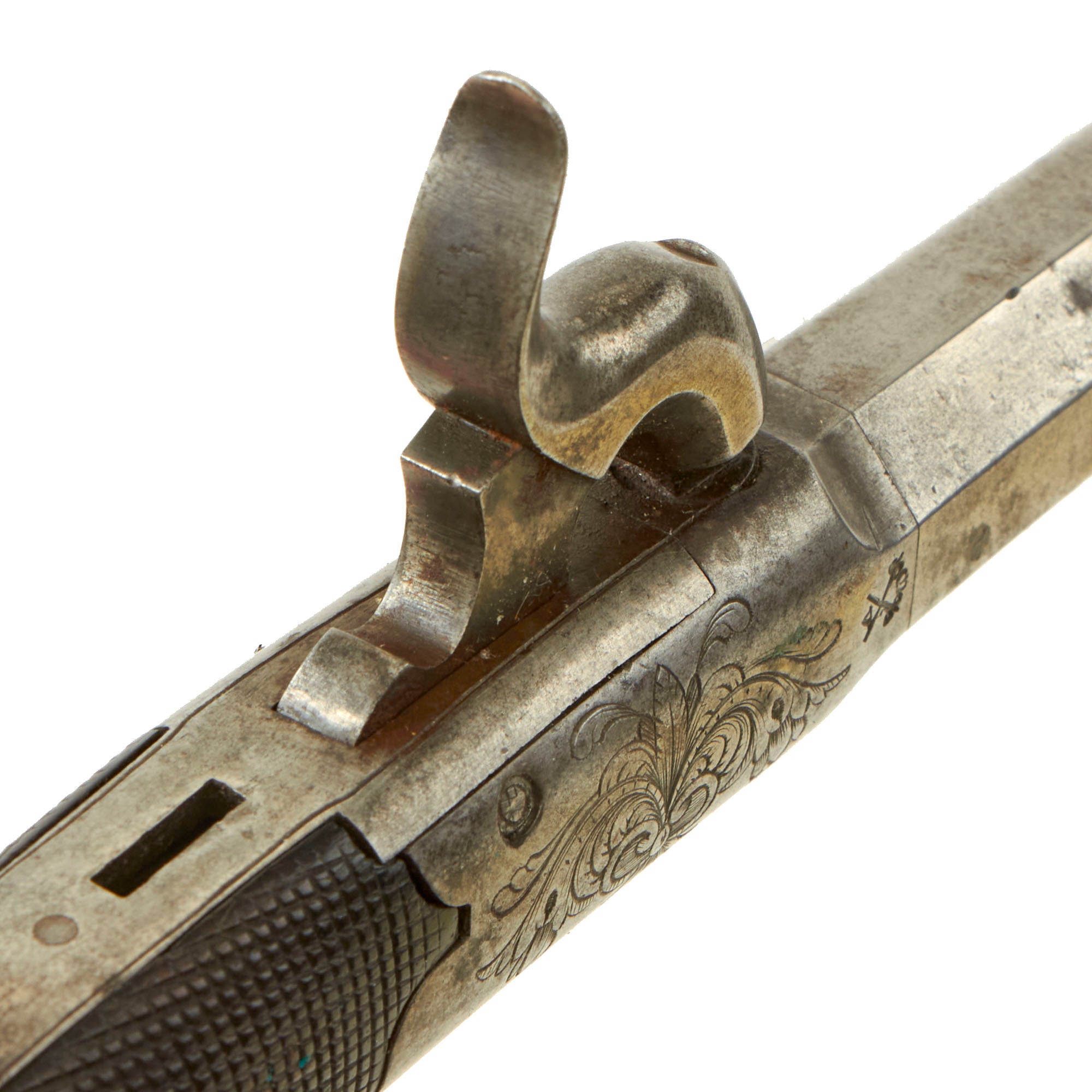 They have some lovely features that make it very useful as a vest pocket pistol, including trigger that only folds out when the pistol is fully cocked, which prevents it from getting caught on the clothing. The locks are both functional, however one of the pistols does not hold at half cock, while the other does. We can also see some slots behind both hammers, so we assume these originally had some type of half-cock safety, which was later removed.
