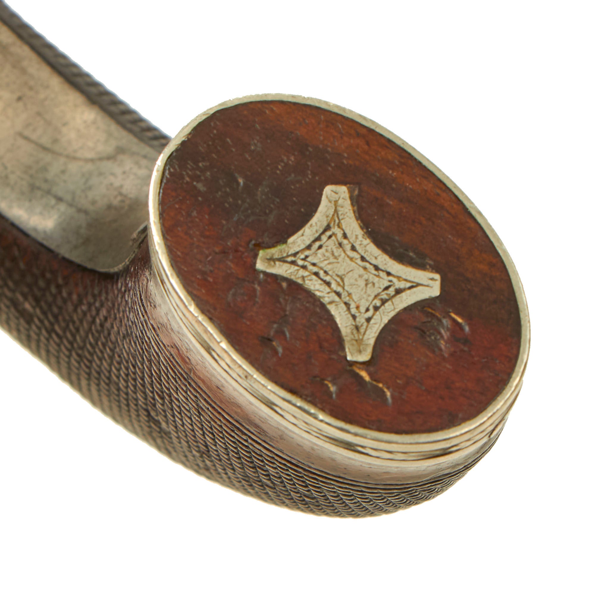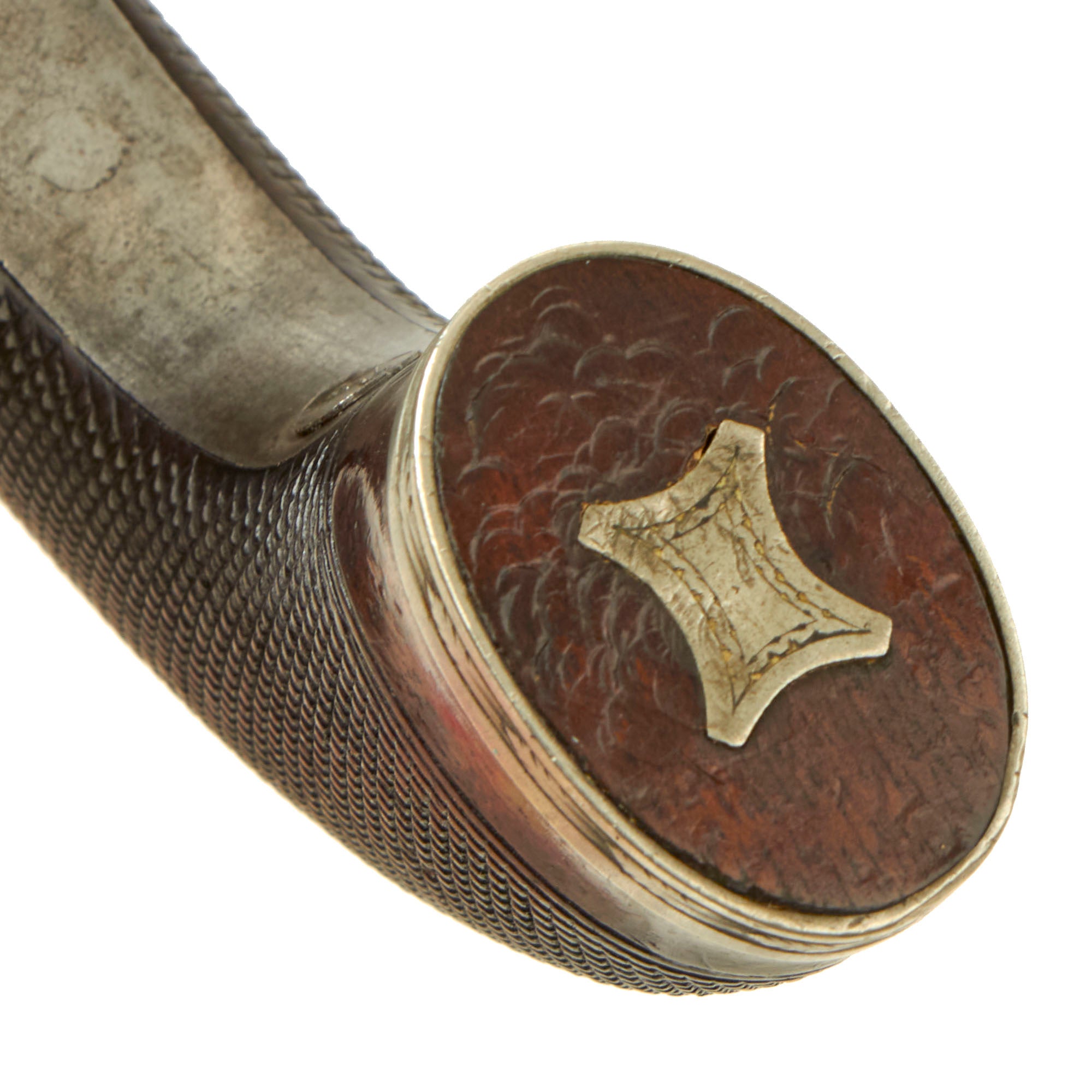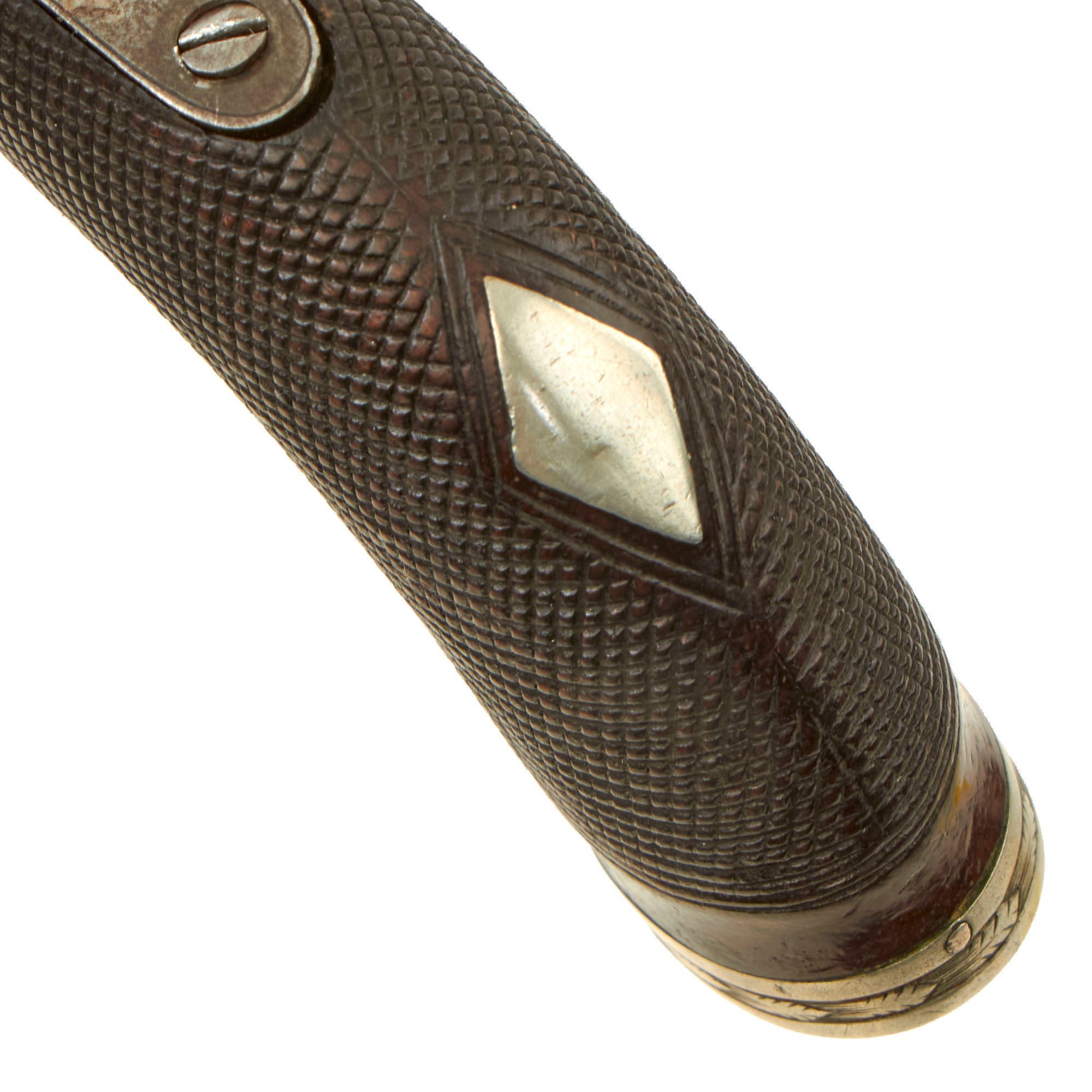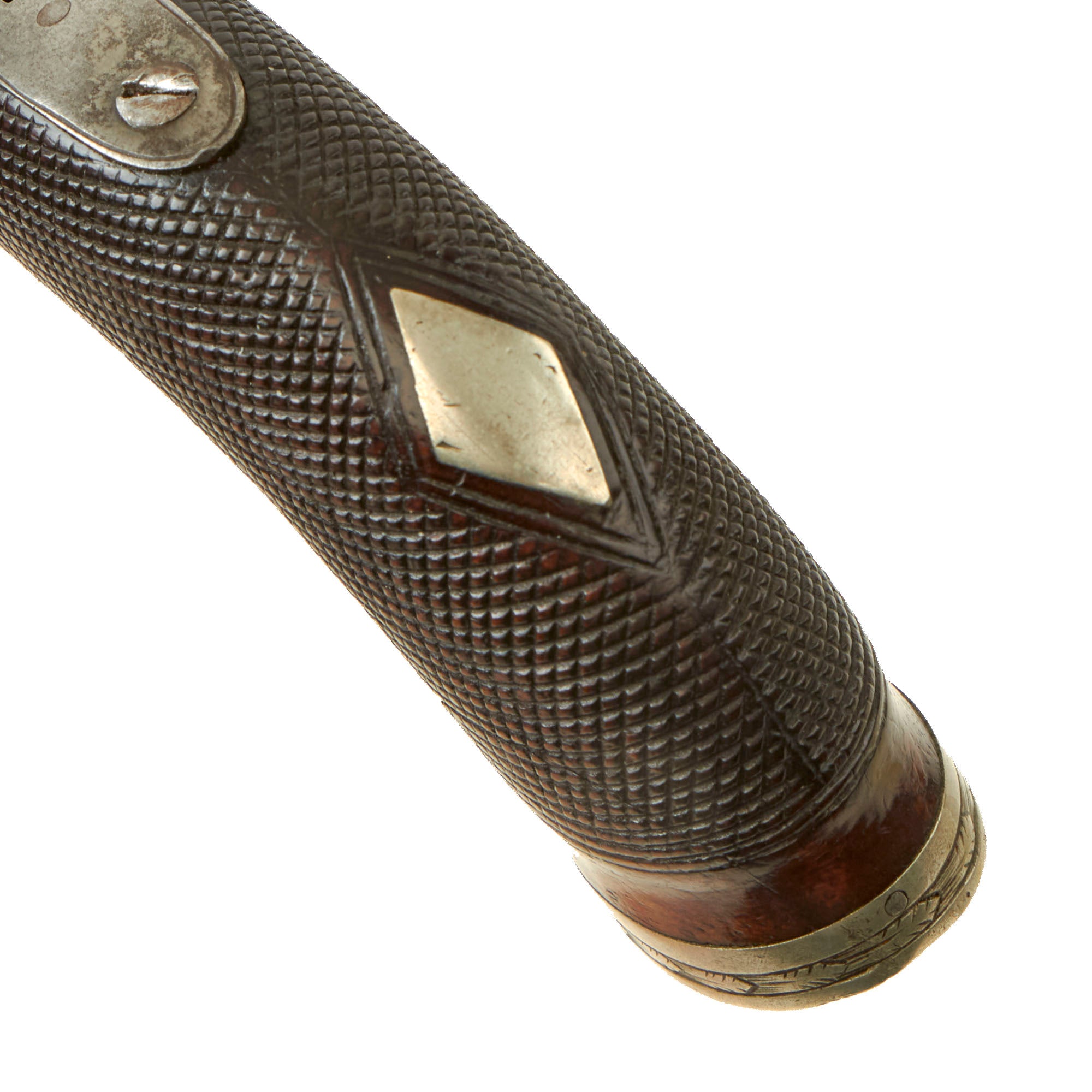 The pistols follow the classic style, and are fitted with a very nice checkered flat bottom curved grips, which are great shape. The bottoms of the grips are fitted with silver, with some small escutcheons on the undersides, while the rear of both grips are fitted with silver diamond escutcheons. The metalwork of the pistols show a lovely bright steel patina, with some spots of oxidation and past peppering, now cleaned away.