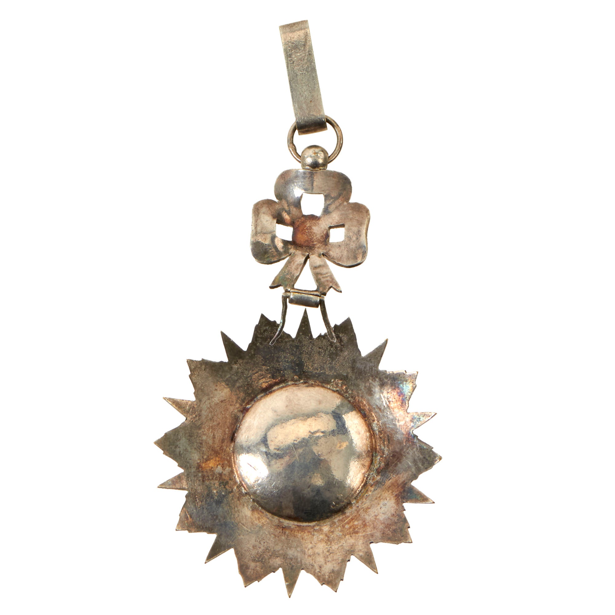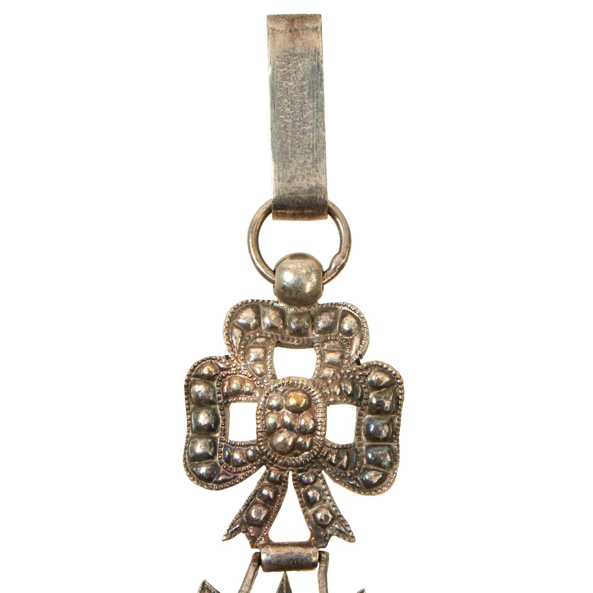 This example is in good shape and retains its clover-shaped brooch, but is missing the ribbon which would attach to the small piece at the top. The body is clearly made from silver. The order measures 4¾ x 2¼”. Comes ready for further research and display.