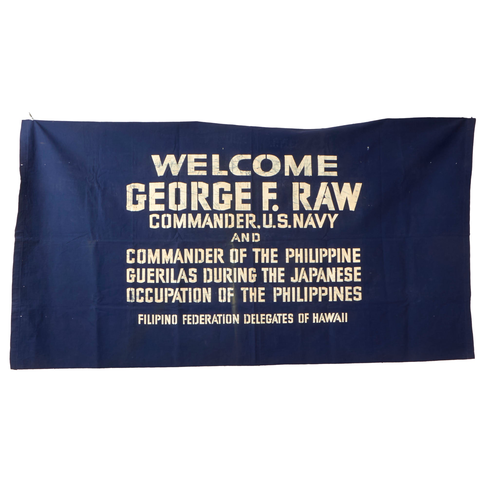 Original Item. One-of-a-Kind. This is a really tremendous banner used to welcome George F. Raw to a meeting of the Filipino Federation Delegates of Hawaii. We haven’t been able to find any information on Raw, so the banner may have a misspelling, or there just isn’t much information on him.