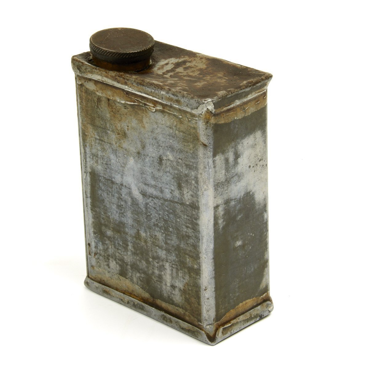 Original Item: This is the first oilcan issued with the Vickers Medium Machine Gun. The can is constructed of plated steel with a brass screw cap. Ours are the early version with a brush attached to the cap. The capacity is 0.5 pint. The official name is CAN, OIL, MG, MK I, and it was introduced in February of 1915. See Dolf Goldsmith, The Grand Old Lady Of No Mans Land (Collector Grade Publications, 1994), page 506. These very early WW I oil cans are quite rare.