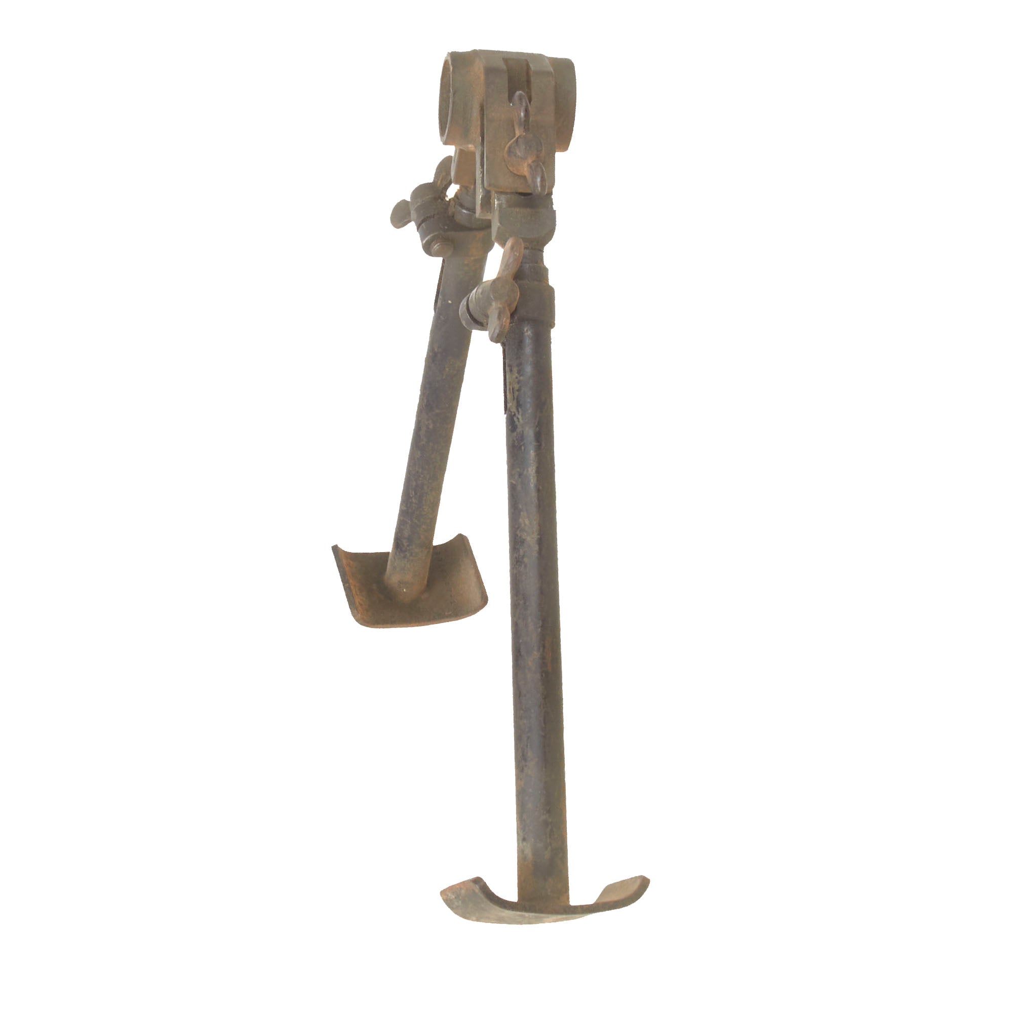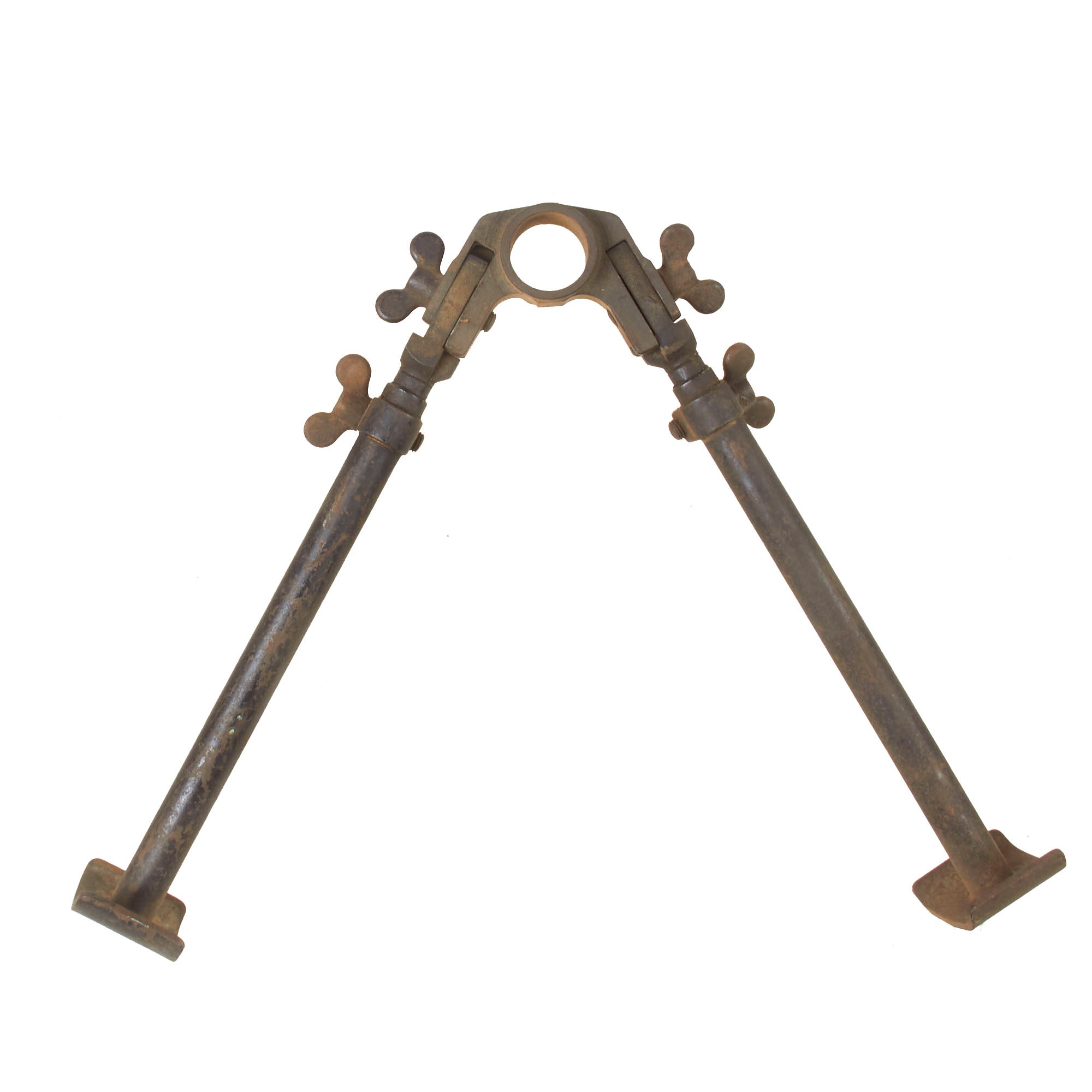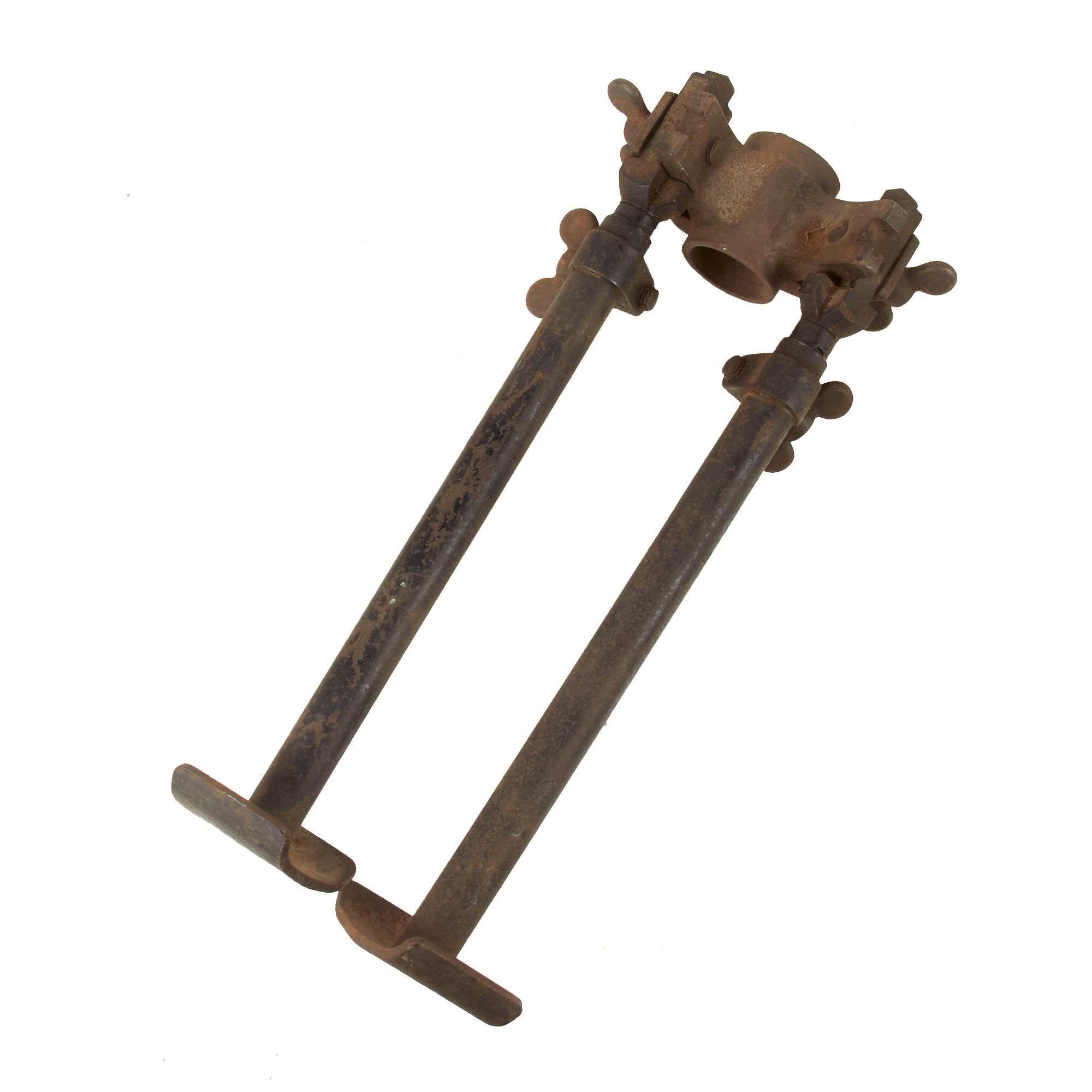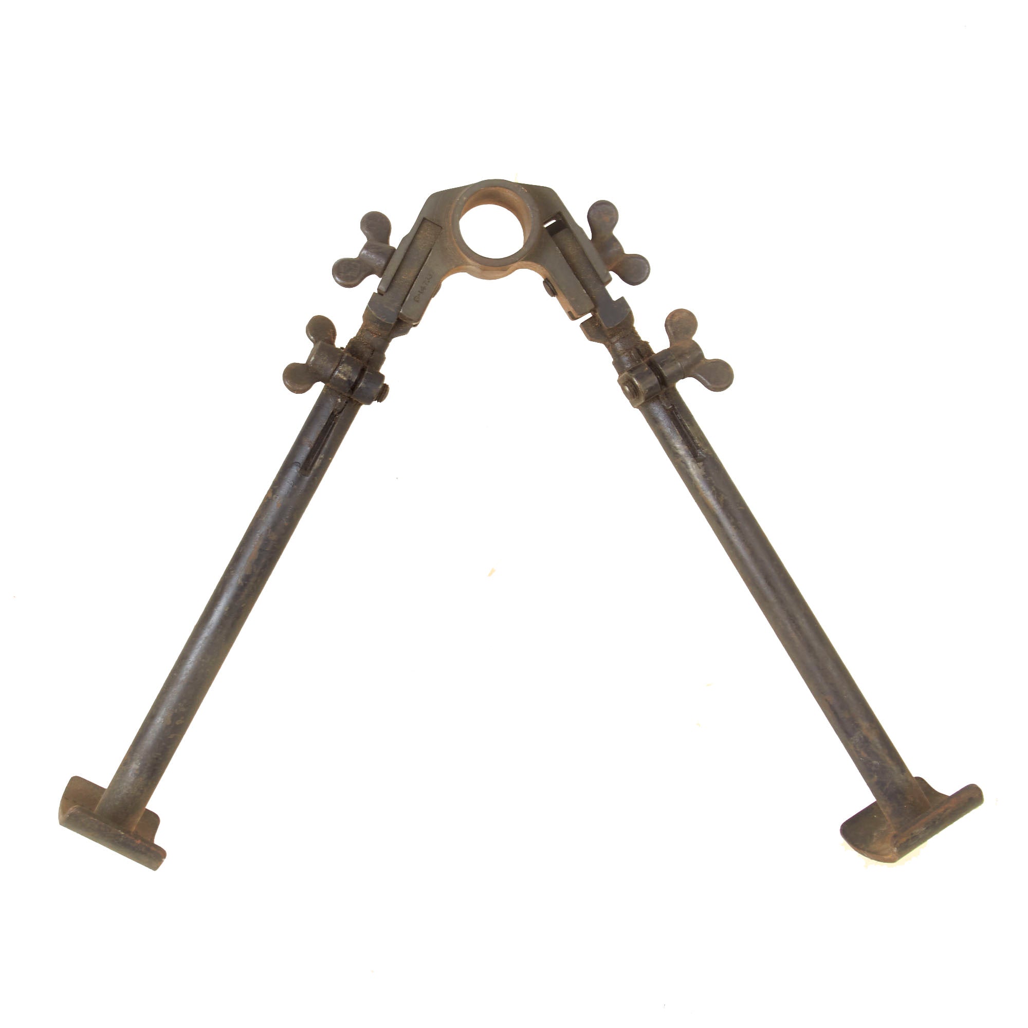 Original Item: Only One Available. This is a very good condition, field used example of a bipod for the U.S. Browning M1918A2 Machine gun, as used by U.S. forces during WWI and WWII. This design fits over a spacer at the muzzle of the gun, and is held in place by a barrel nut and tension washer. There were two versions of this bipod produced, an early one with a solid steel central hub, and a later version which utilized a metal strap over the top of the hub, which was easier to tighten. This is the early version, with the solid steel hub.