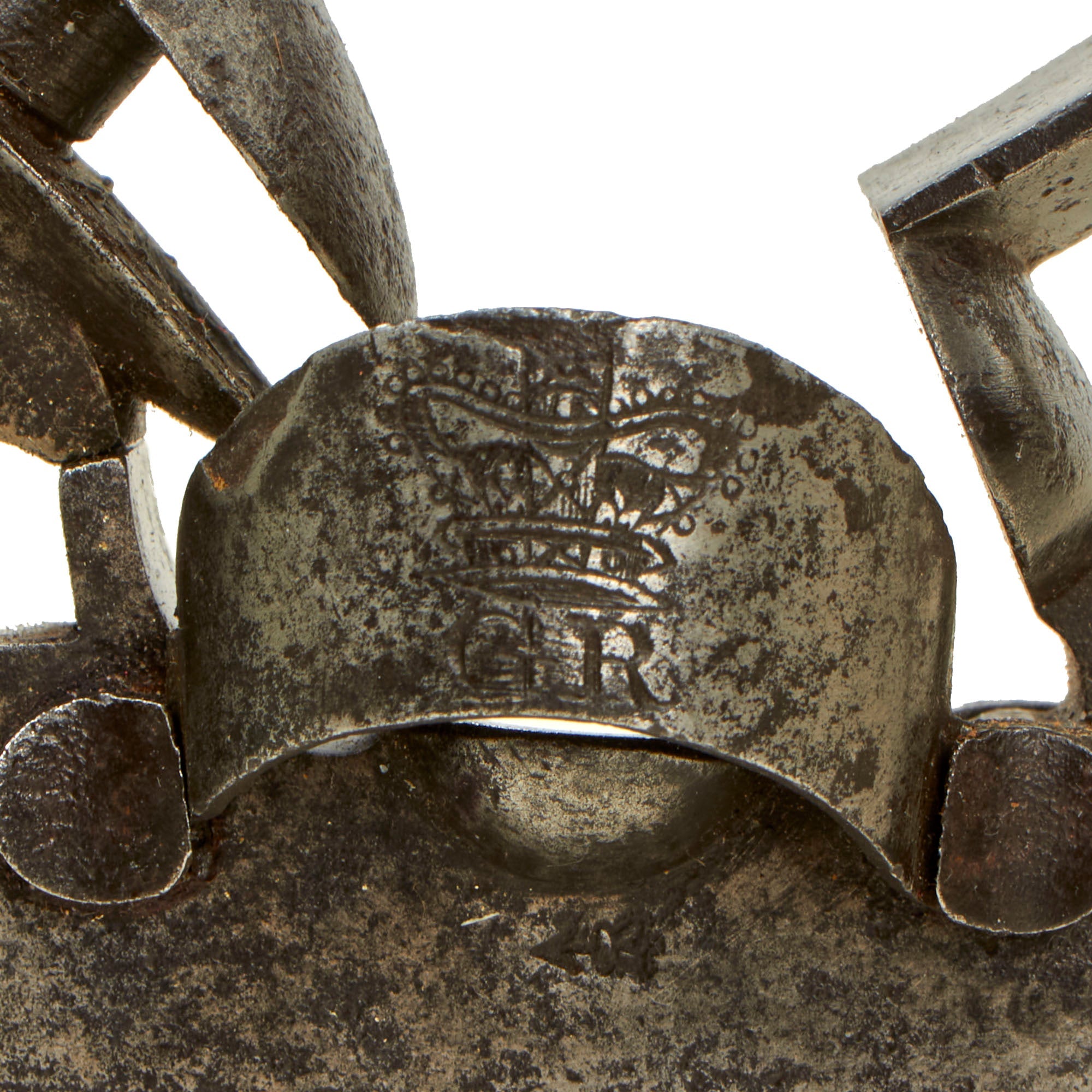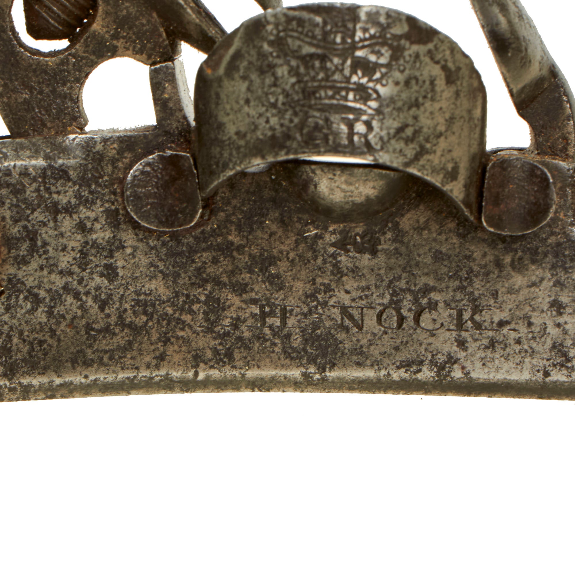 This is a tremendous and probably experimental screwless detached lock mechanism for a flintlock pistol or carbine, made by the famous London Gun Maker HENRY NOCK, and is fitted with his patented internal hammer mechanism and a very interesting “flash guard” over the frizzen. The lock is signed H‧NOCK. The flash pan shield side cover is engraved with the CROWN over G.R. royal cypher, and there is also a CROWN / BROAD ARROW "Lock Viewer's Mark over the maker name.