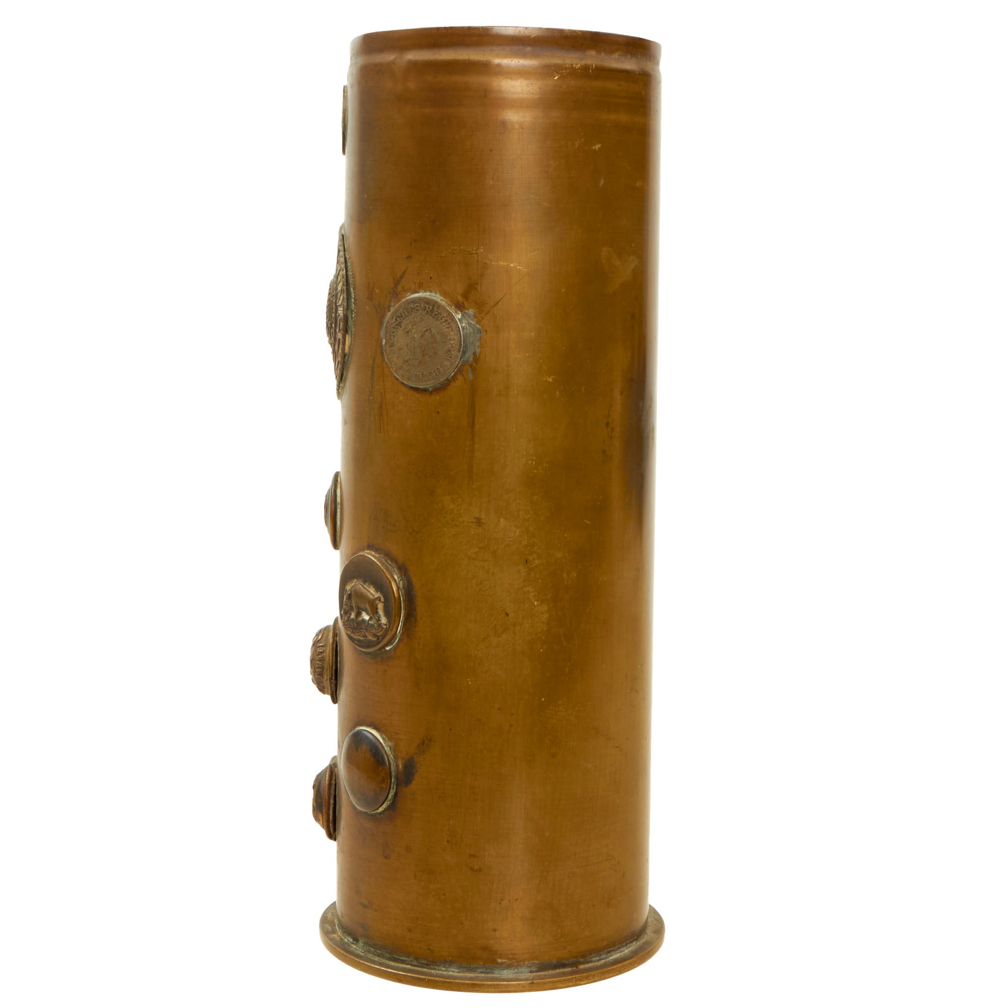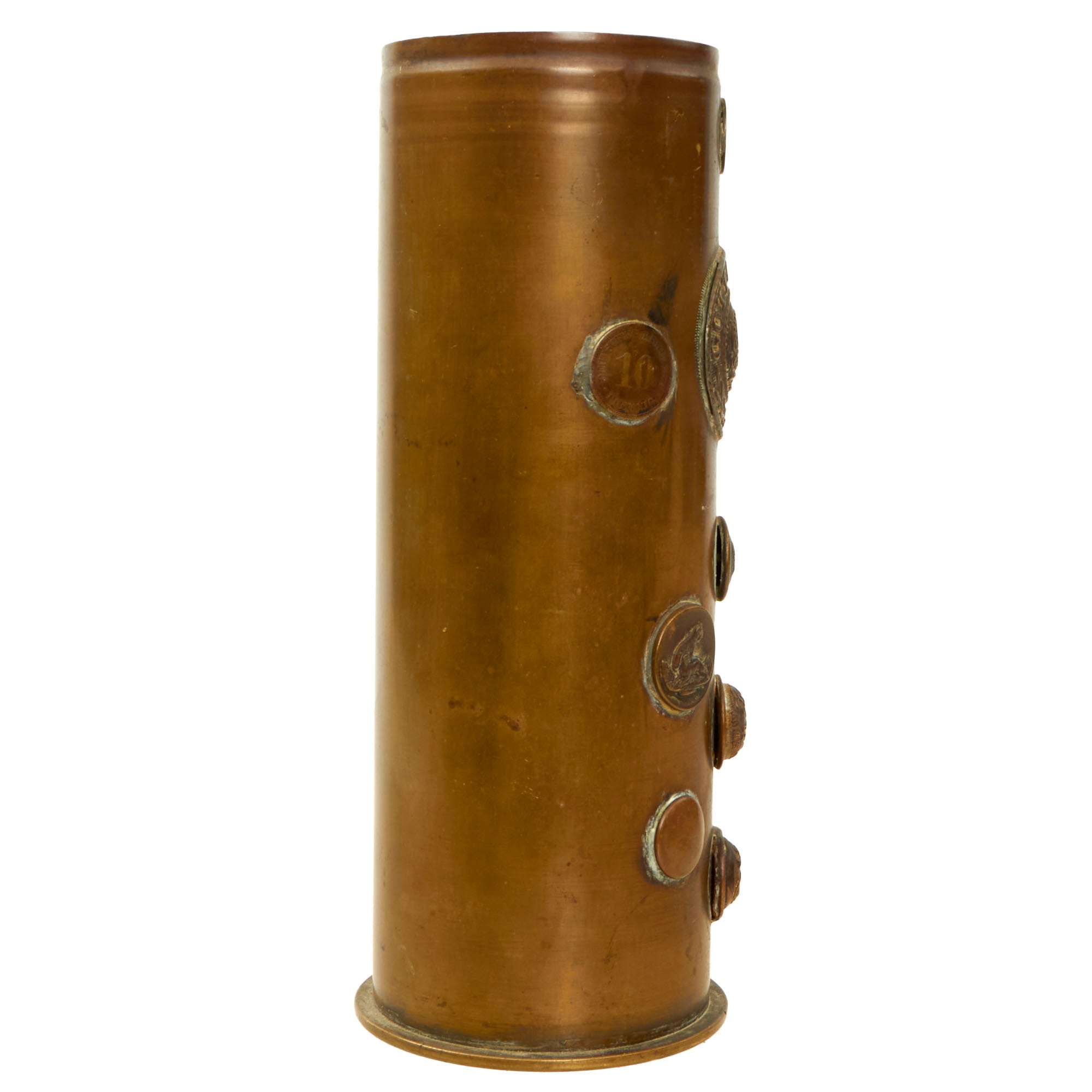 Original Item. One-of-a-Kind. This is a really gorgeous German artillery shell which has been adorned on one side with the GOTT MIT UNS emblem off of a German belt buckle, as well as three German “Pfenning” coins and seven buttons. Like all deactivated ordnance, this shell is Not Available for Export.