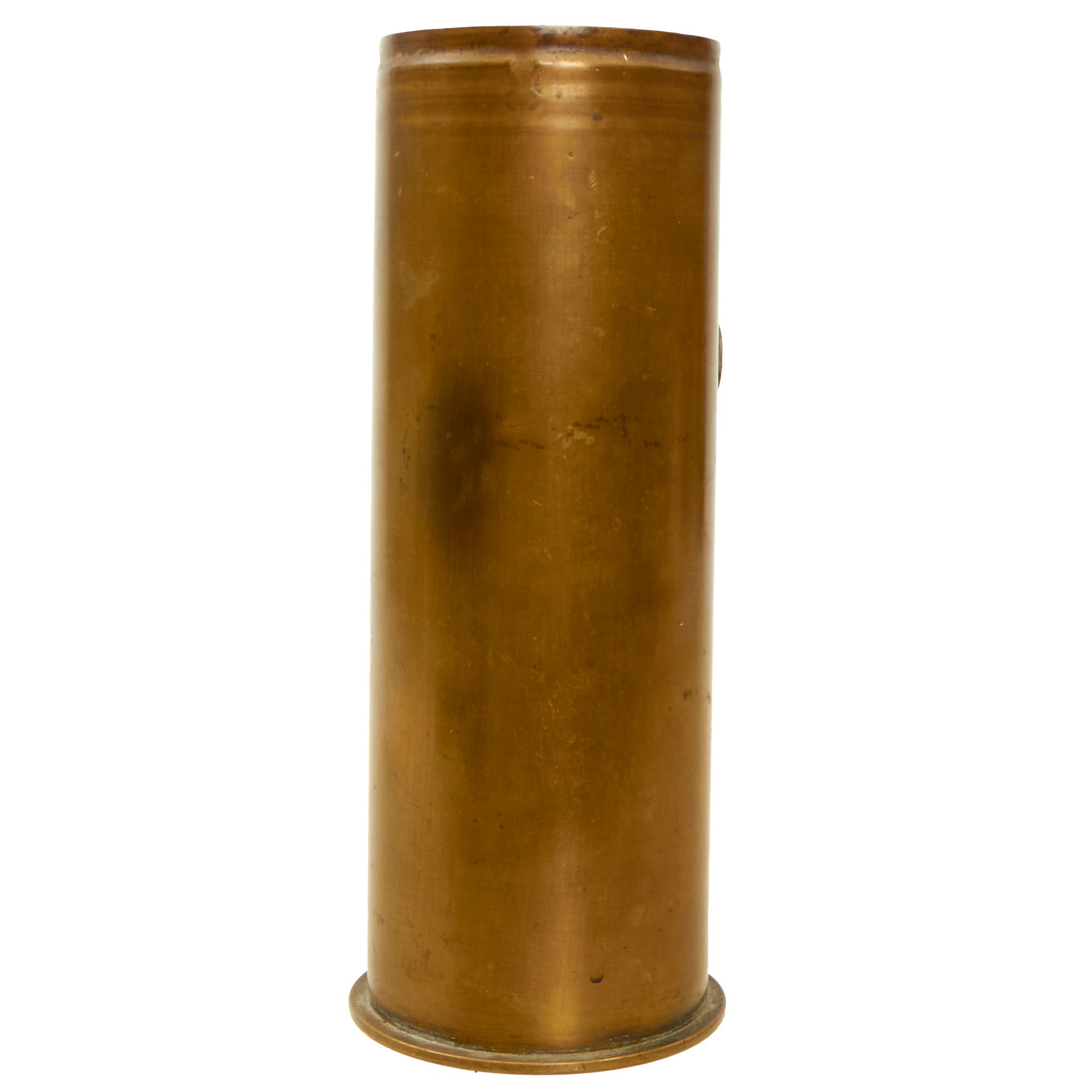 This is certainly an earlier manufactured shell than World War I, but it would have been used just the same. The shell measures 9” tall with a 3½” base diameter. The buttons include a German Imperial uniform button and a WWII Kriegsmarine button, alluding that this may have been put together post-war.