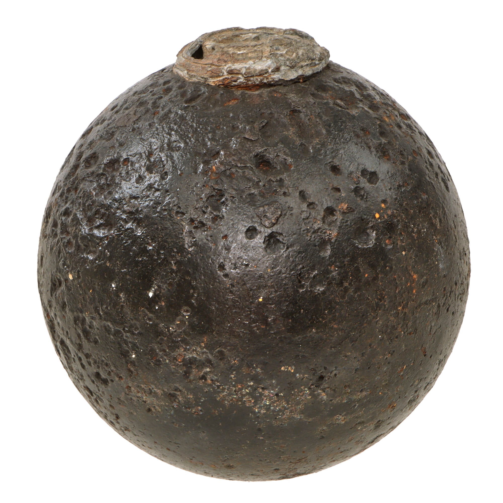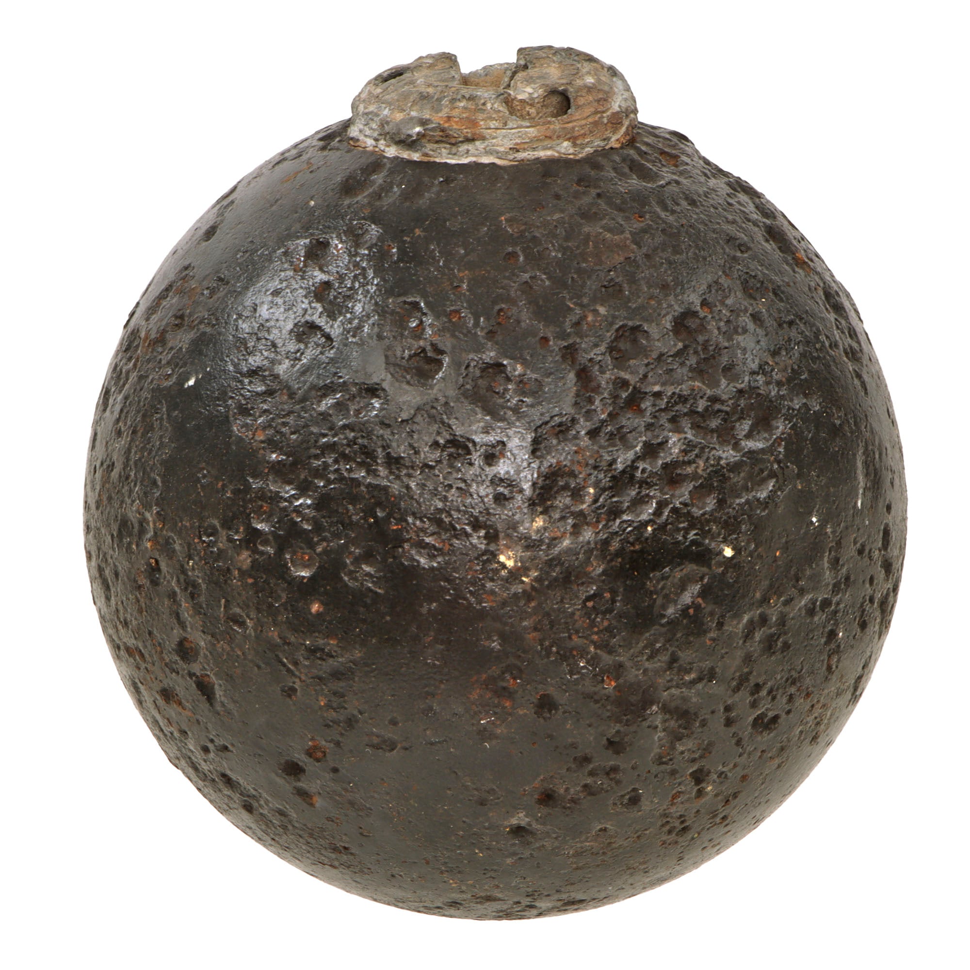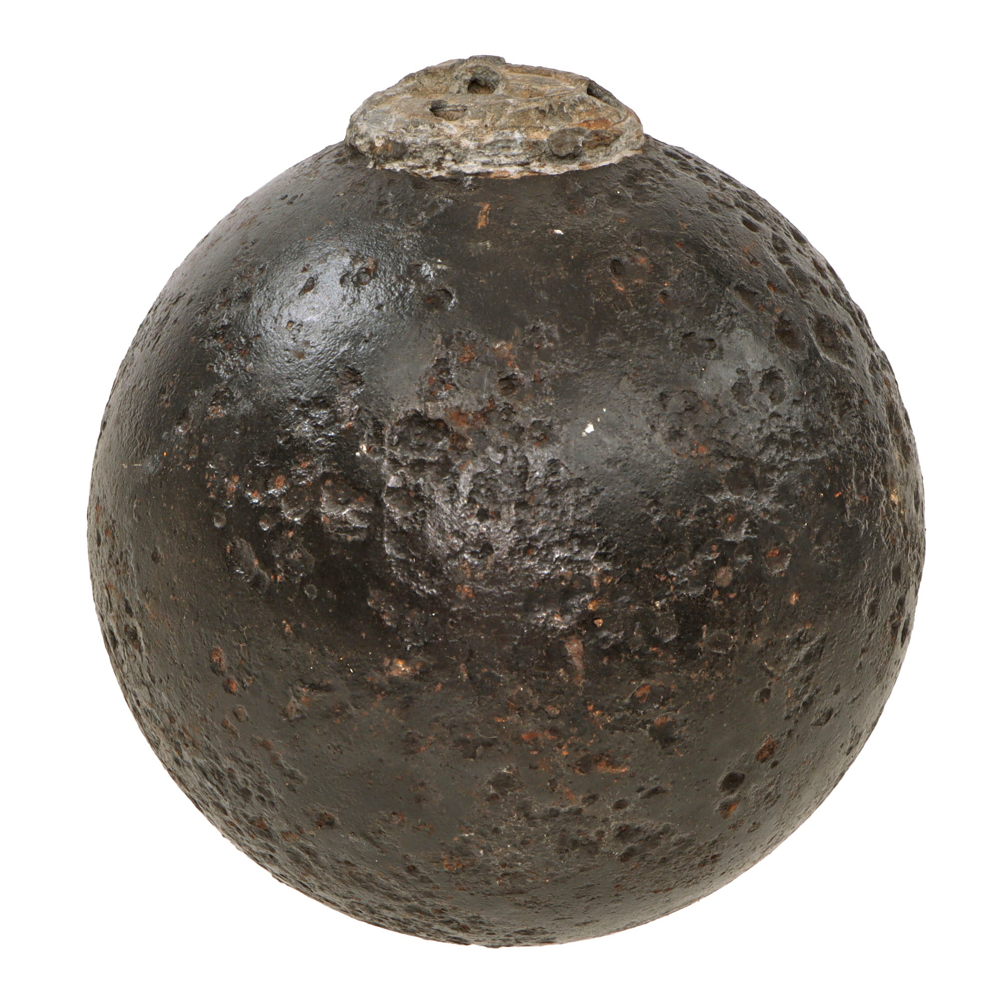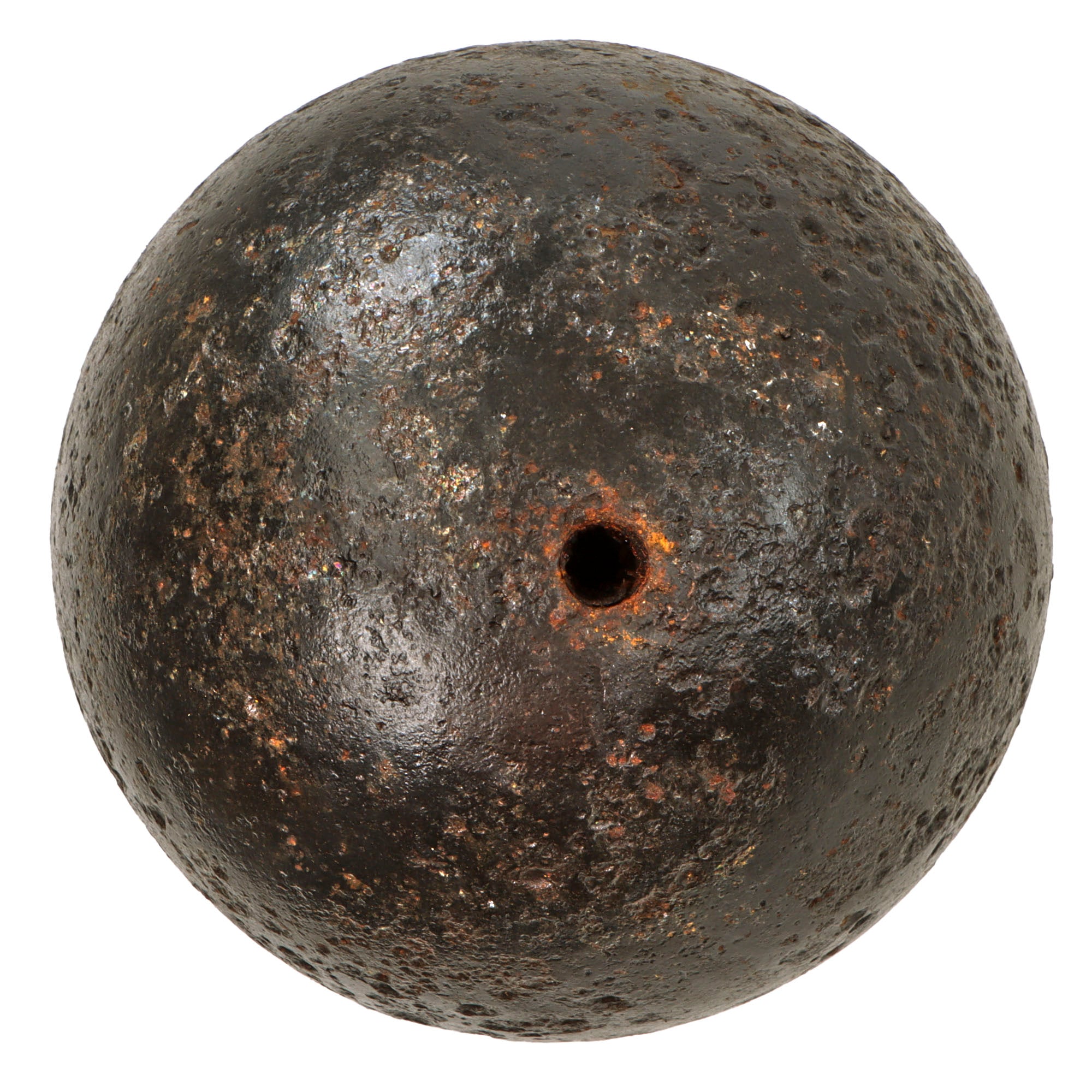 Civil War cannonball built to fit a smooth bore cannon and with remnants of thread to insert a  ''Bormann Time Fuze''. This cannonball, a 12-pound Shrapnel Shell, had a distance of about 1,200 feet and was used by the Union army throughout the Civil War. The fuze, invented around 1852, would cause a timed burst of the lead balls after the cannon was fired, unleashing the shrapnel contained within the shell. Cannonball weighs approximately 12 pounds and has a 4.5'' diameter and 14.25'' circumference. We have no information on where it was dug.