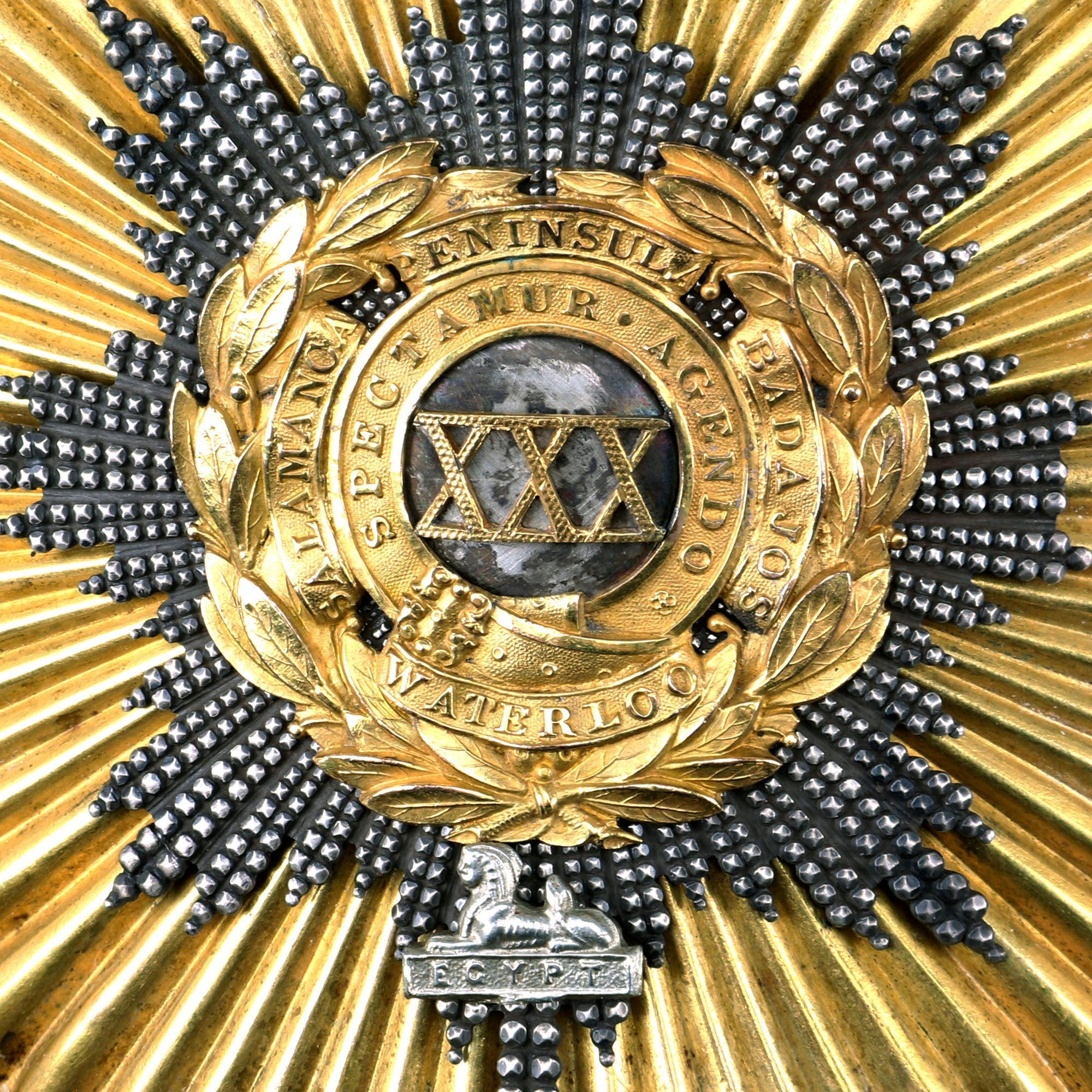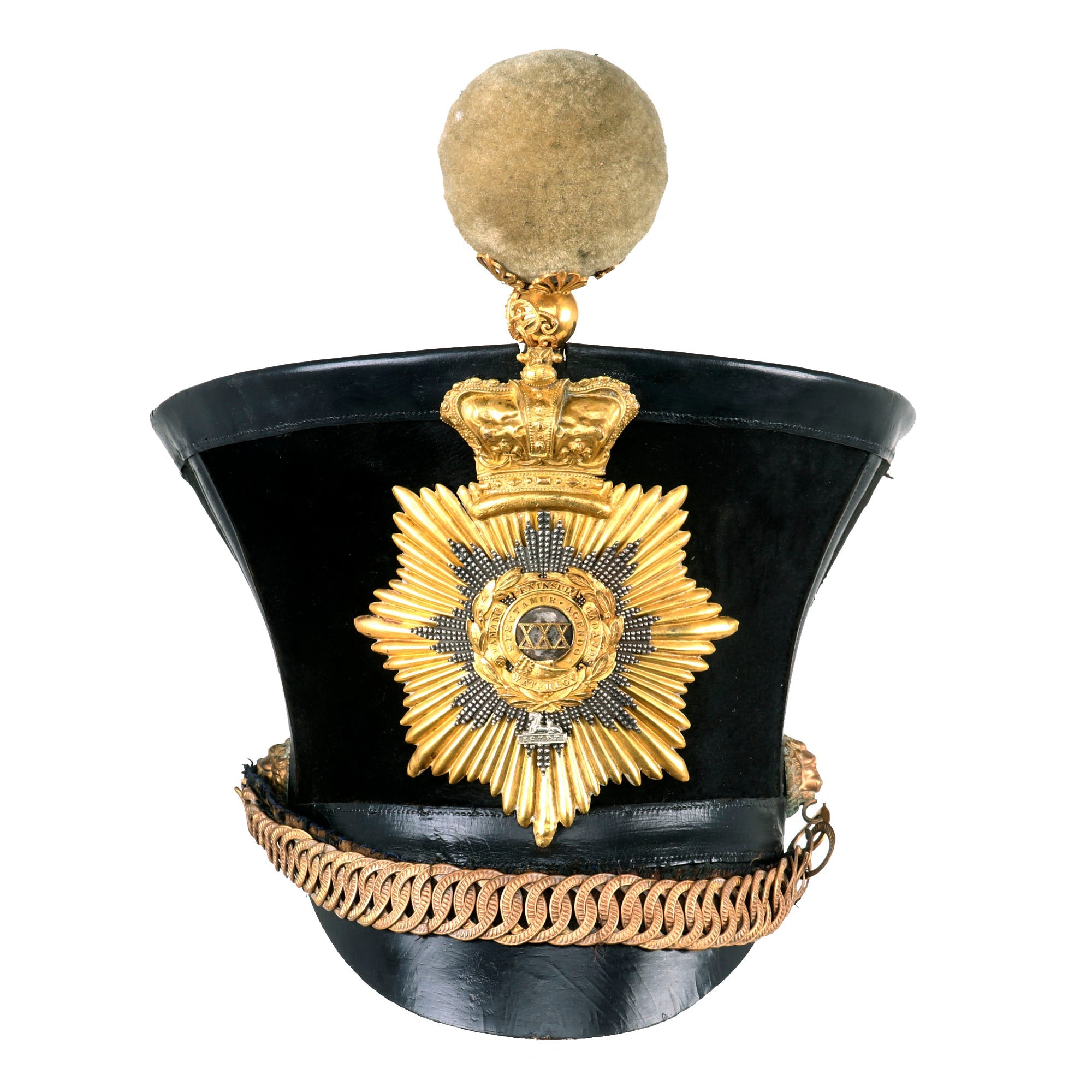 The shako is adorned with rich, intricate detailing including a polished brass plate emblazoned with regimental insignia and ornate embellishments. The plate is centered with the Roman numerals XXX denoting 30, for the 30th Regiment of Foot. Around this is the regimental motto, “Spectemur Agendo”, “Let us be judged by our actions”. Around this are four scrolls which denote the Battle Honors of the regiment up to this period, Waterloo, Salamanca, Peninsula, and Badajos. Below this is a small attached Egyptian Sphinx insignia with a scroll reading Egypt, denoting the regiment’s involvement in the French Campaign in Egypt & Syria during the War of the Second Coalition. The top of the plate features the British Crown, with the Ball Tuft housing meeting the tip of the crown.